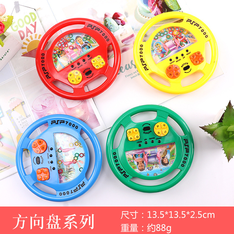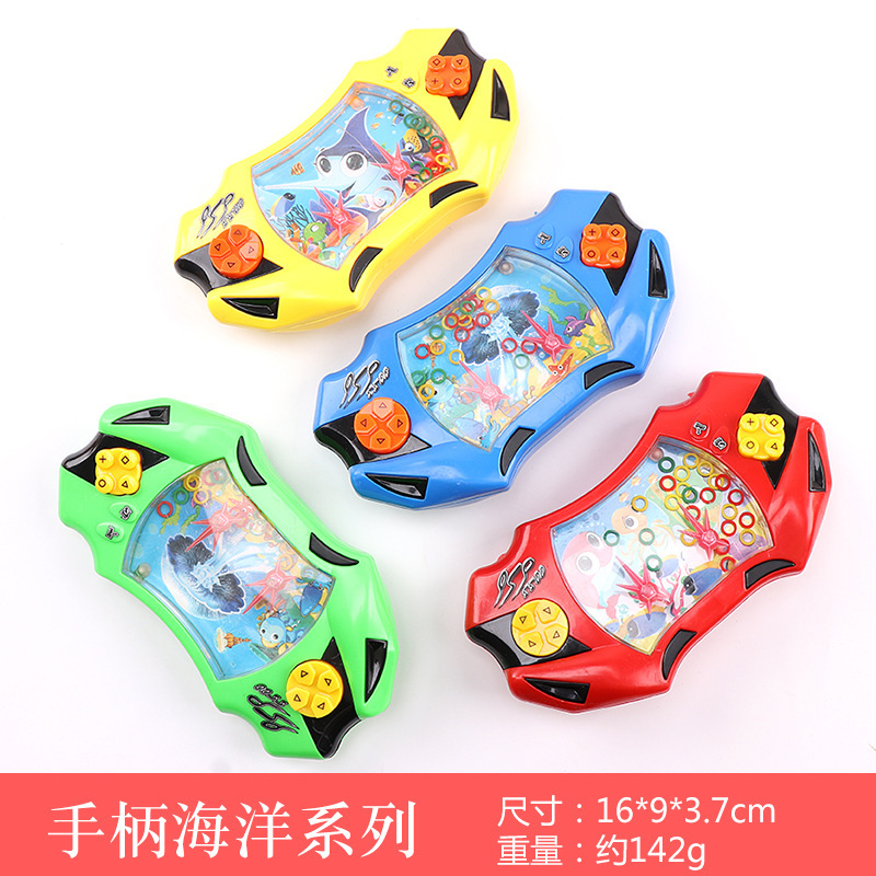 很有意思的休闲小游戏机.内部填充满了清水.下方有很多塑胶彩色小圈,按下发射台上的两个按钮就会激起一股股水流,我们要做的是:用水流的力量把彩色小圈都套到立柱上,儿时的经典玩具,能够锻炼宝宝的耐心。很有技巧的哦!爸爸妈妈们小时就玩过的游戏,两个按钮一按一按套圈圈,不要电池。看谁把水里圈圈套得最多。快买一款和您的孩子比一比