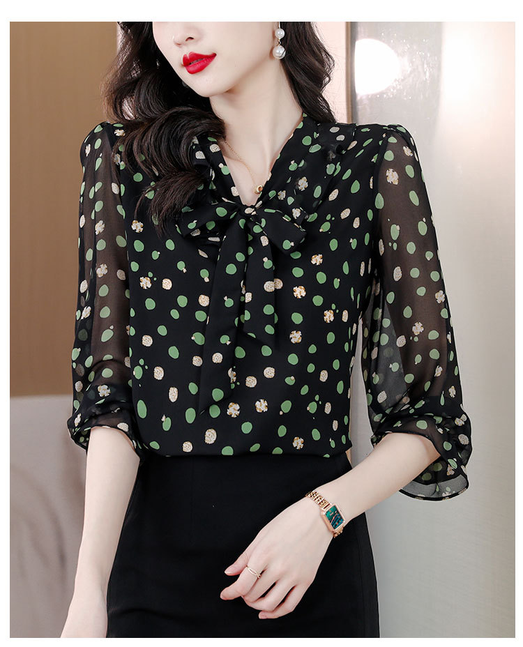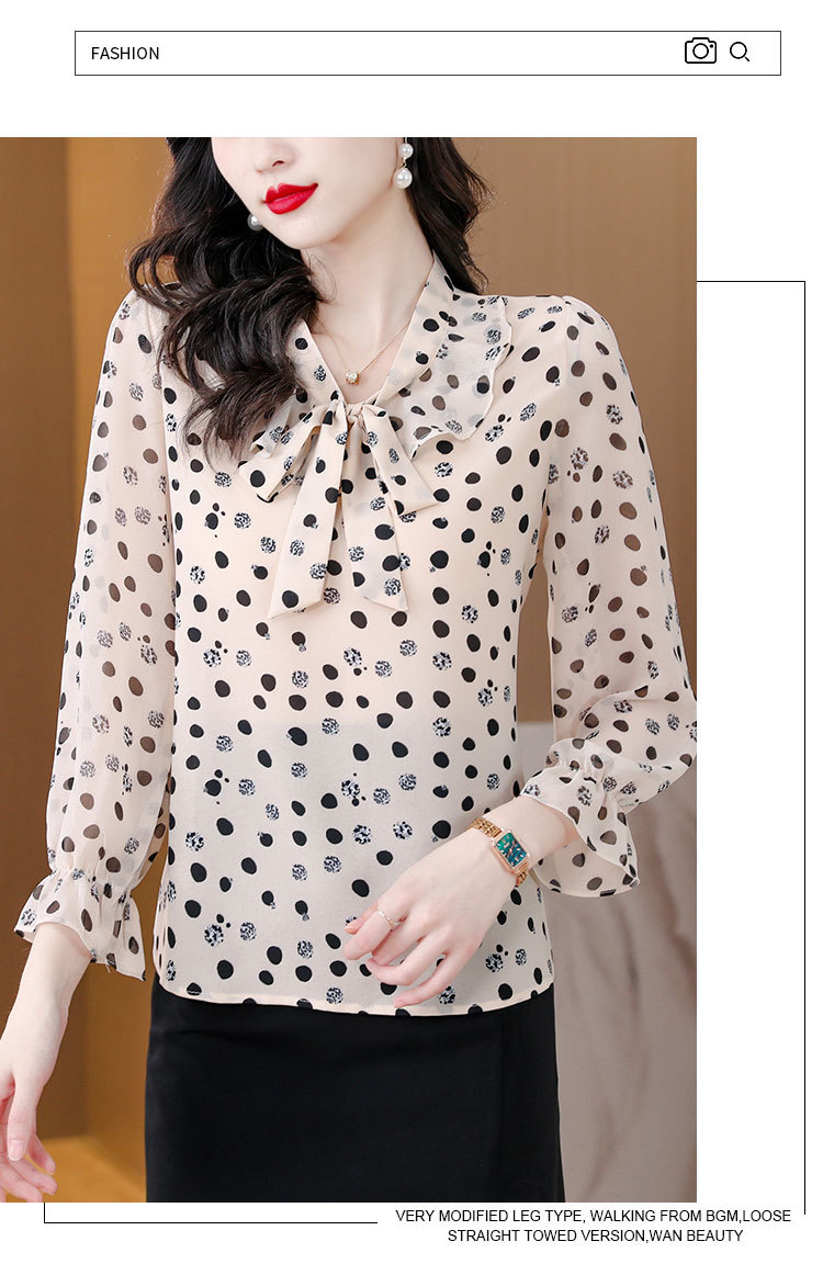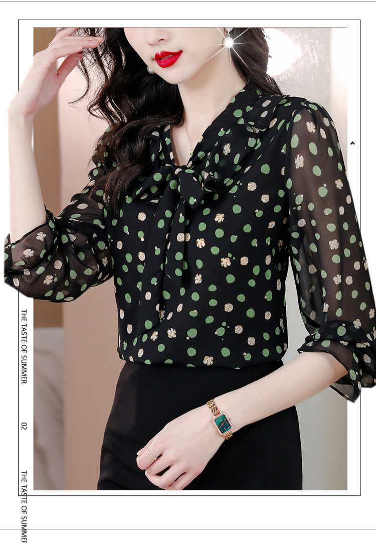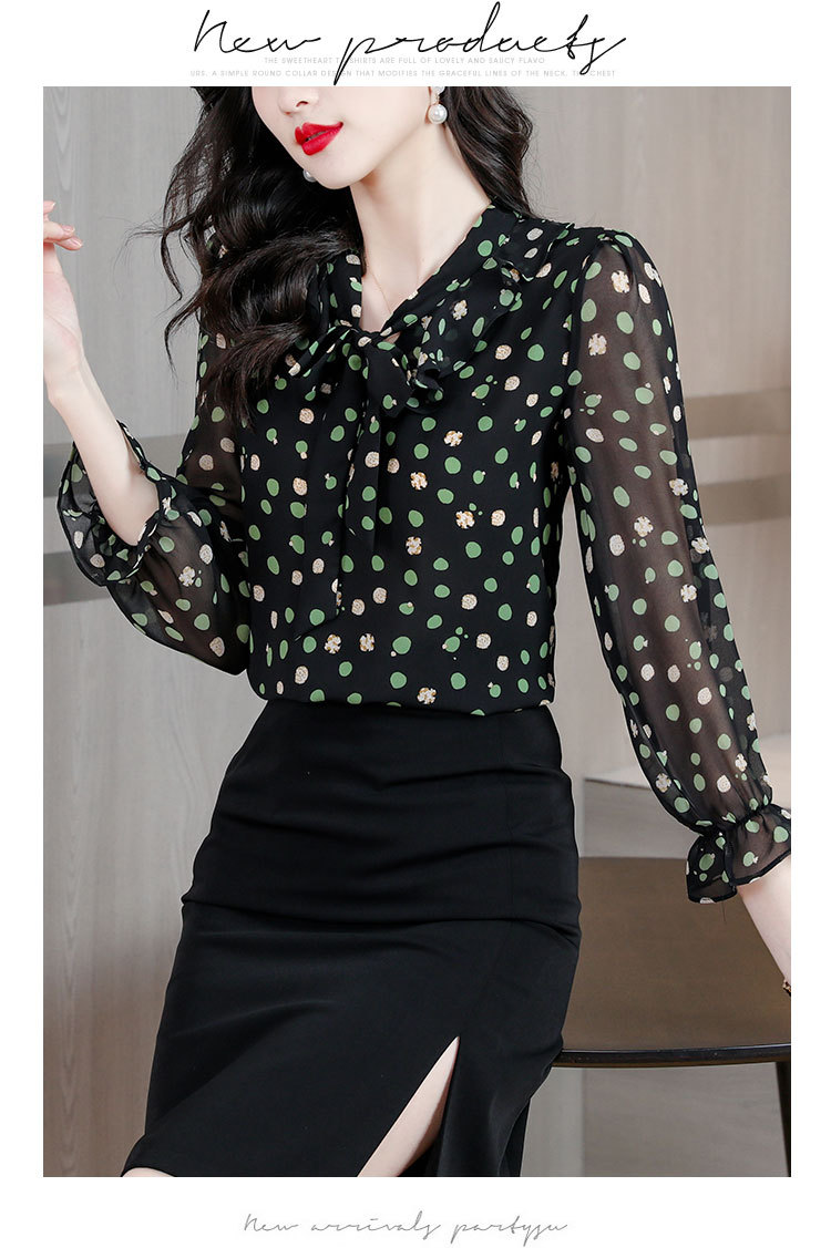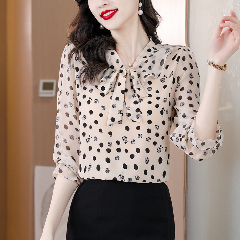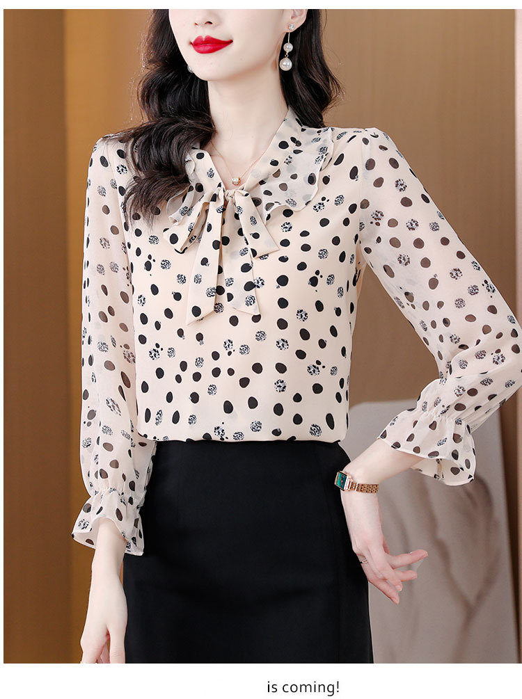 봄과 여름 2024 여성을위한 프랑스 스타일의 고급 러플 연령 감소 폴카 도트 리본 쉬폰 셔츠 새로운 플러스 사이즈 작은 셔츠스토어 가기