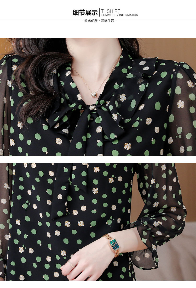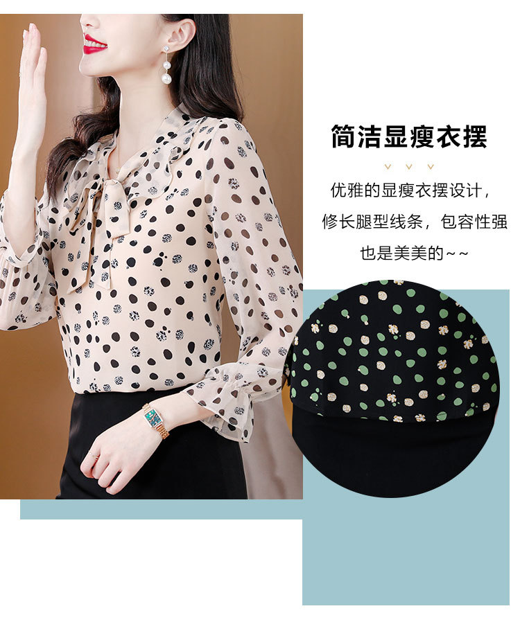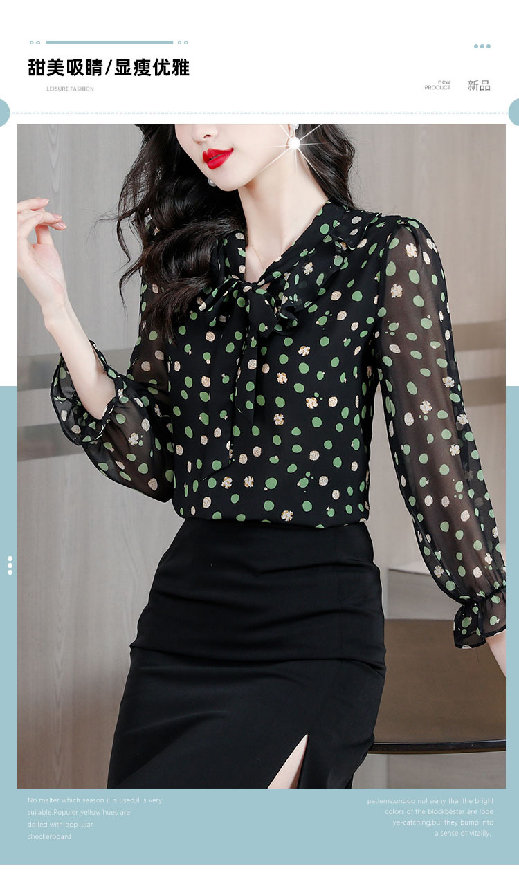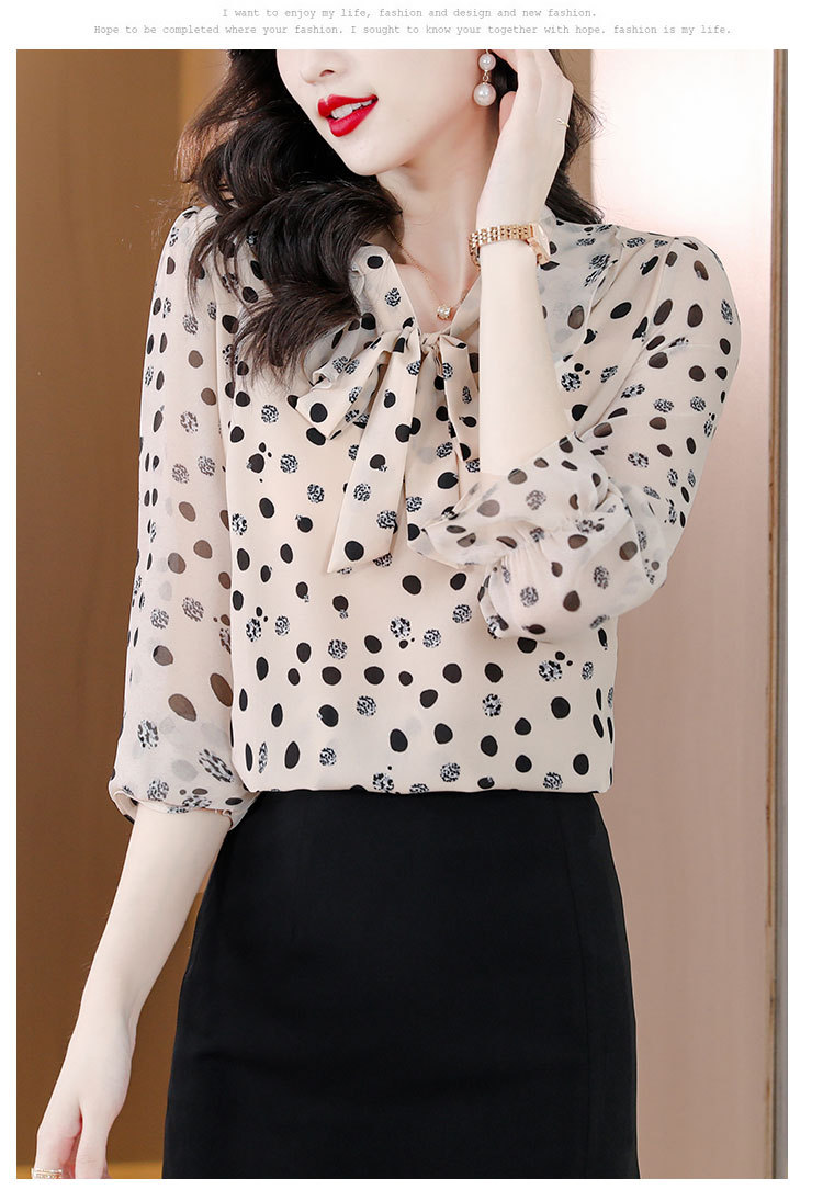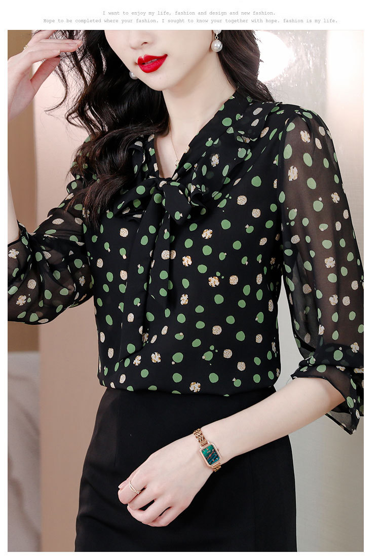 봄과 여름 2024 여성을위한 프랑스 스타일의 고급 러플 연령 감소 폴카 도트 리본 쉬폰 셔츠 새로운 플러스 사이즈 작은 셔츠스토어 가기