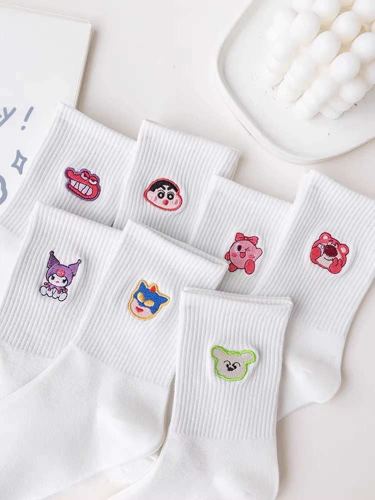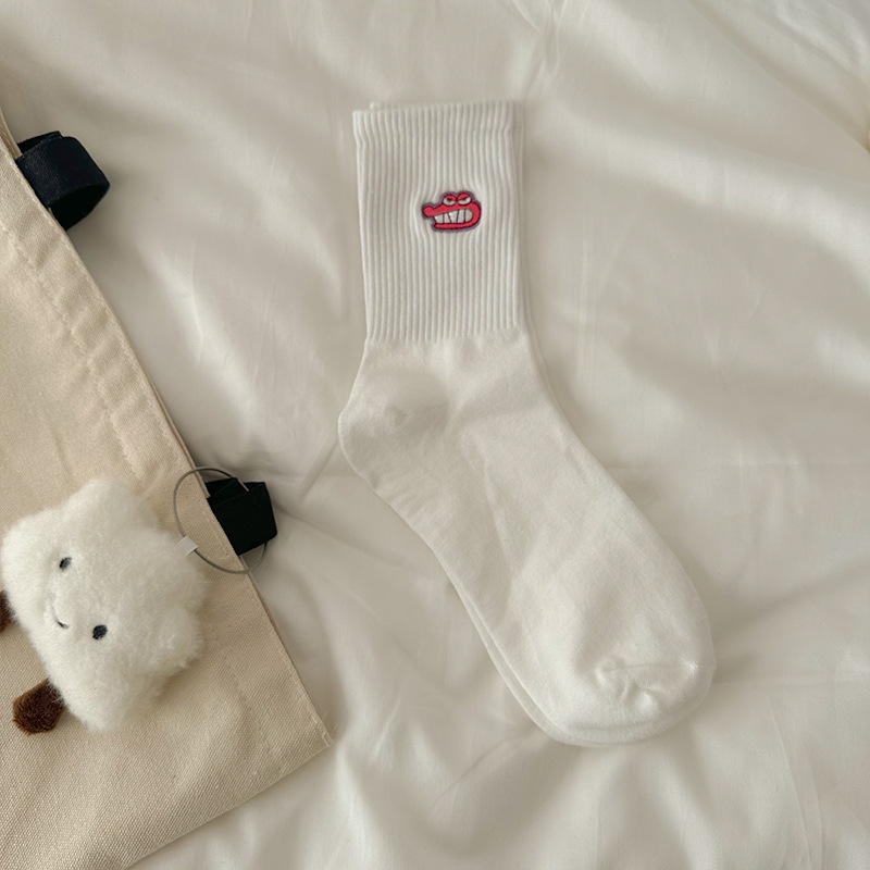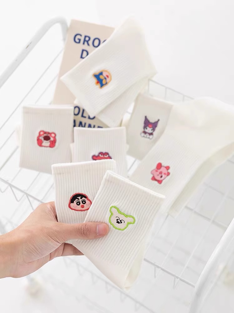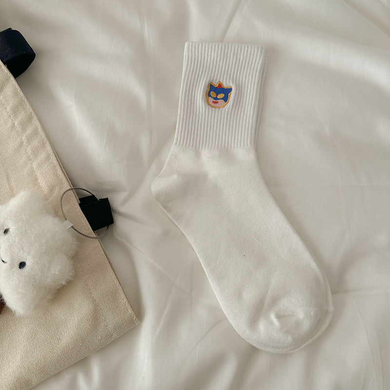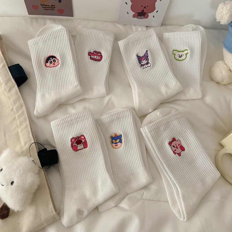 흰색 양말 여성 튜브 양말 면화 봄과 가을 일본 학술 스타일 만화 여름 얇은 자수 스포츠 스타킹
