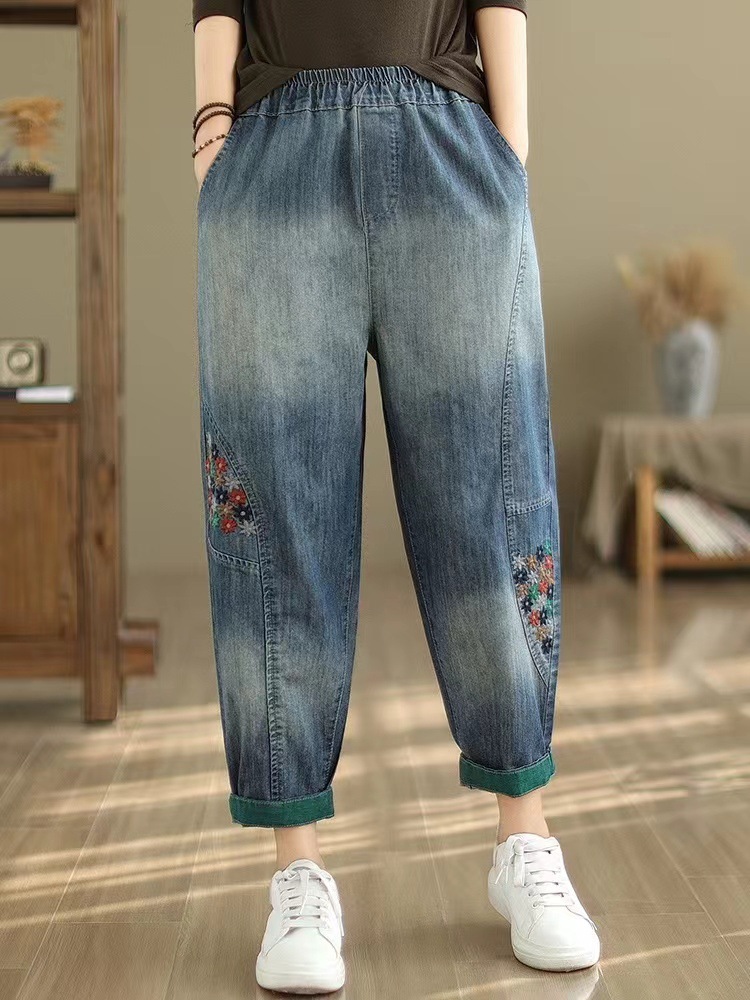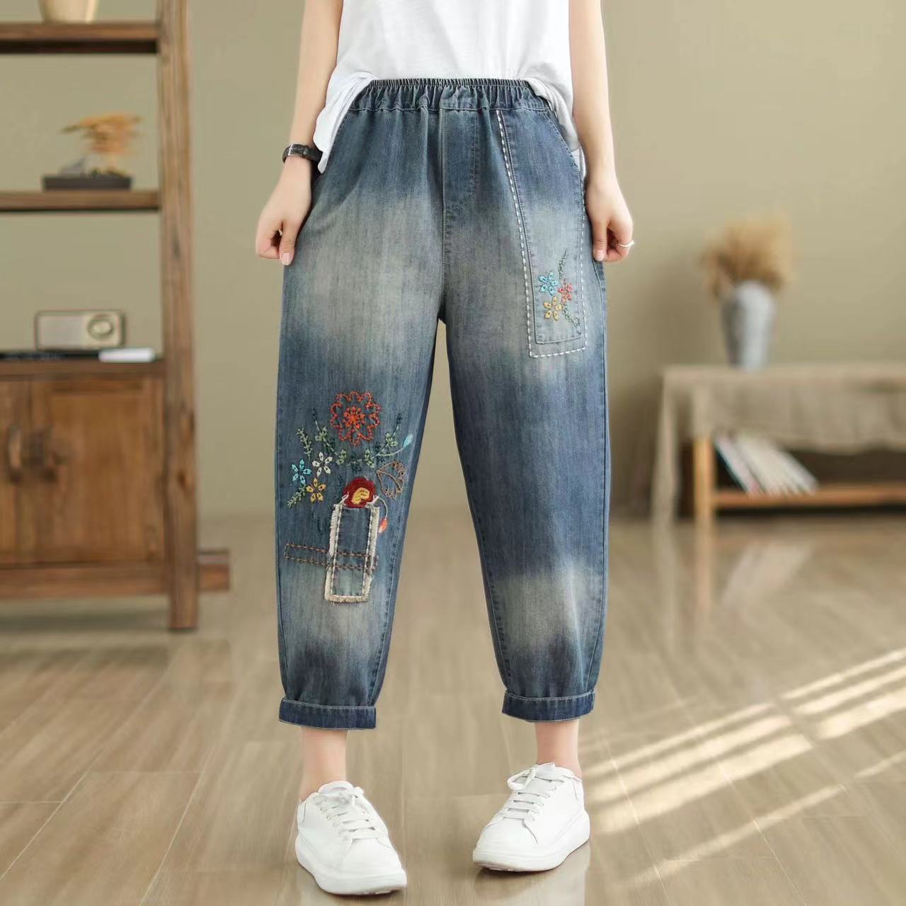 봄과 여름 새로운 느슨한 예술적 복고풍 청바지 자르기 하렘 바지 바느질 대조 컬러 토레 바지