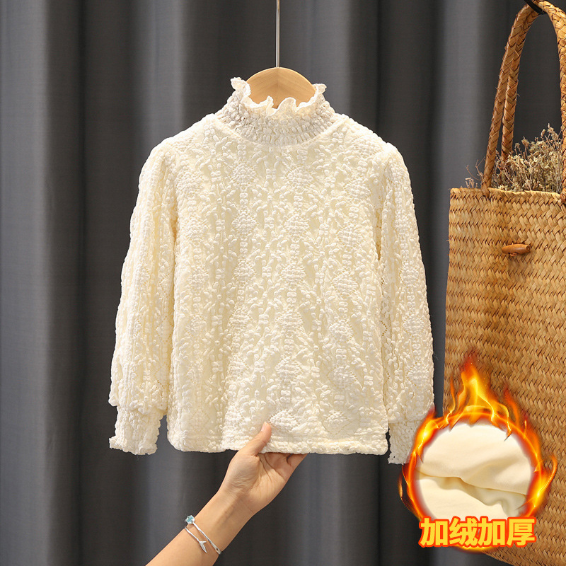 소녀베이스 셔츠 가을과 겨울 솔리드 컬러 올매치 소녀 두꺼운 레이스 인테리어 겨울 어린이 기모 긴팔 티셔츠 트렌디