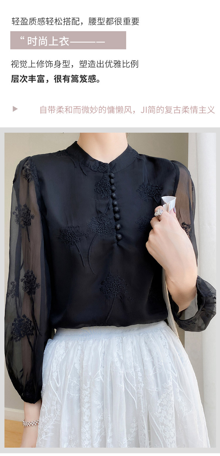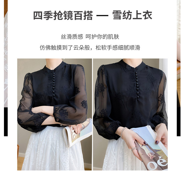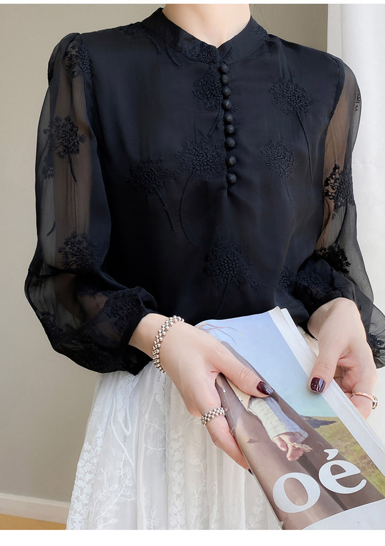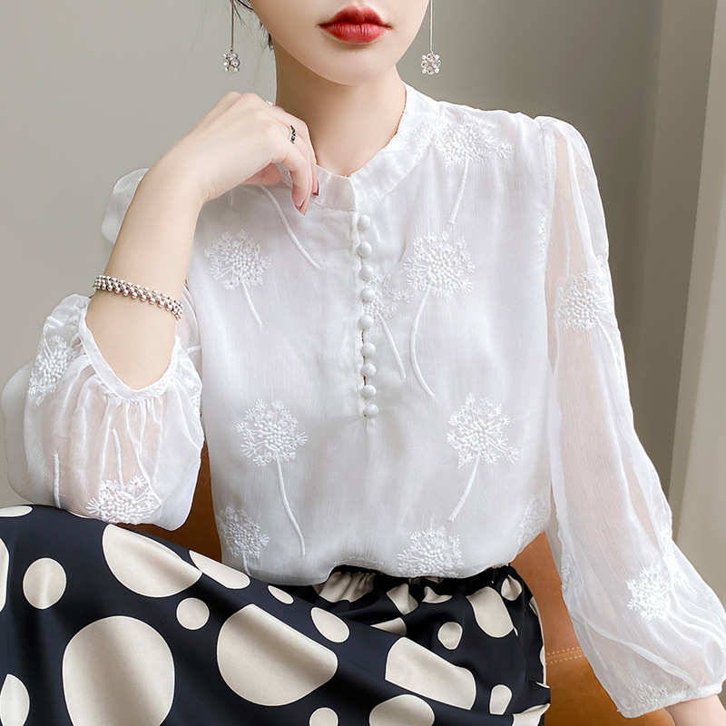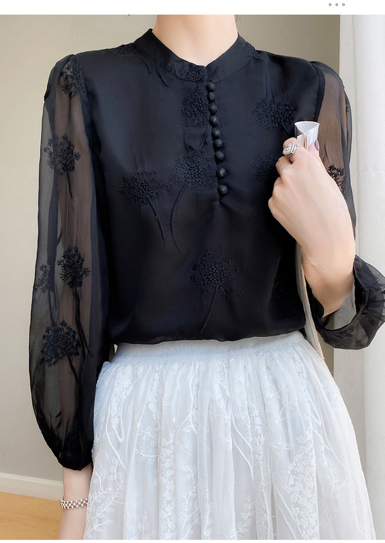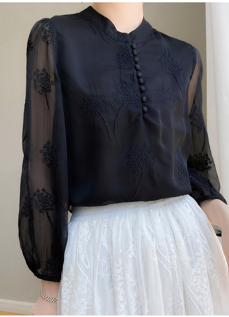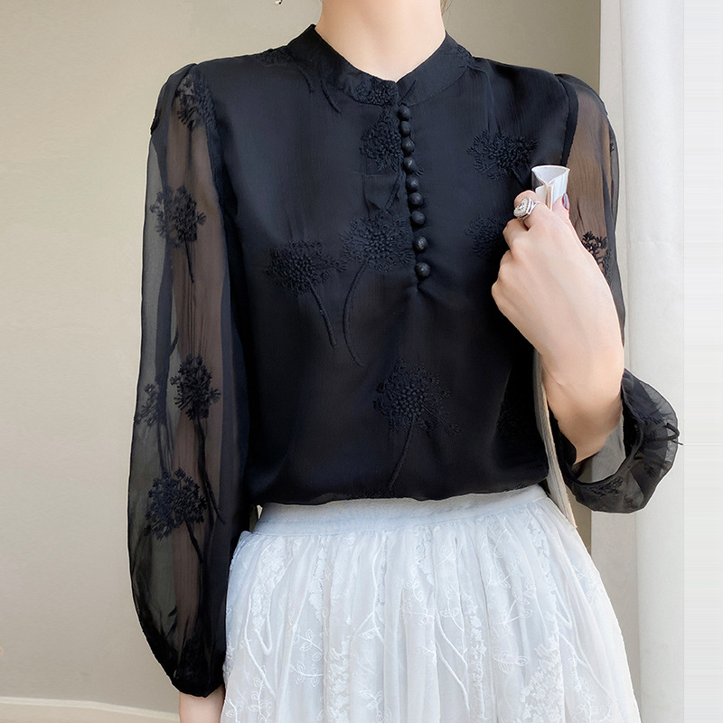 실크 새로운 중국 스타일 최고 여성 셔츠 긴 소매 태양 보호 자수 우아한 멀 베리 실크 스탠드 칼라 쉬폰 셔츠