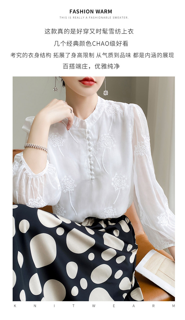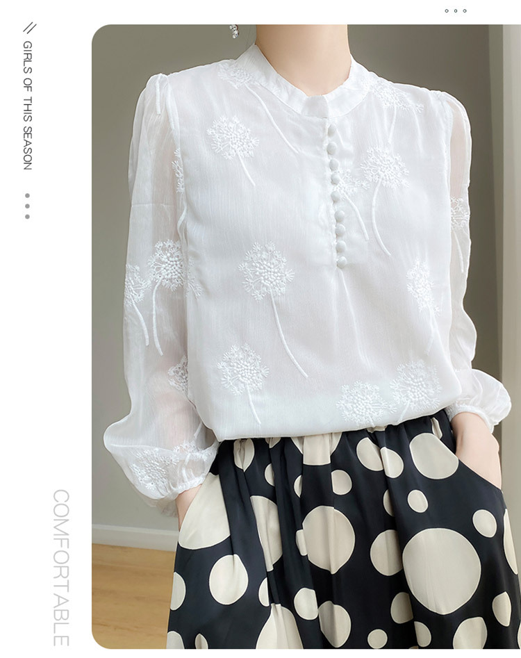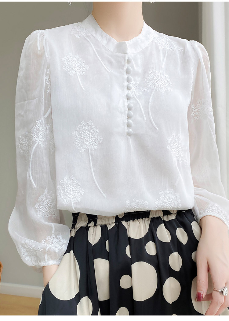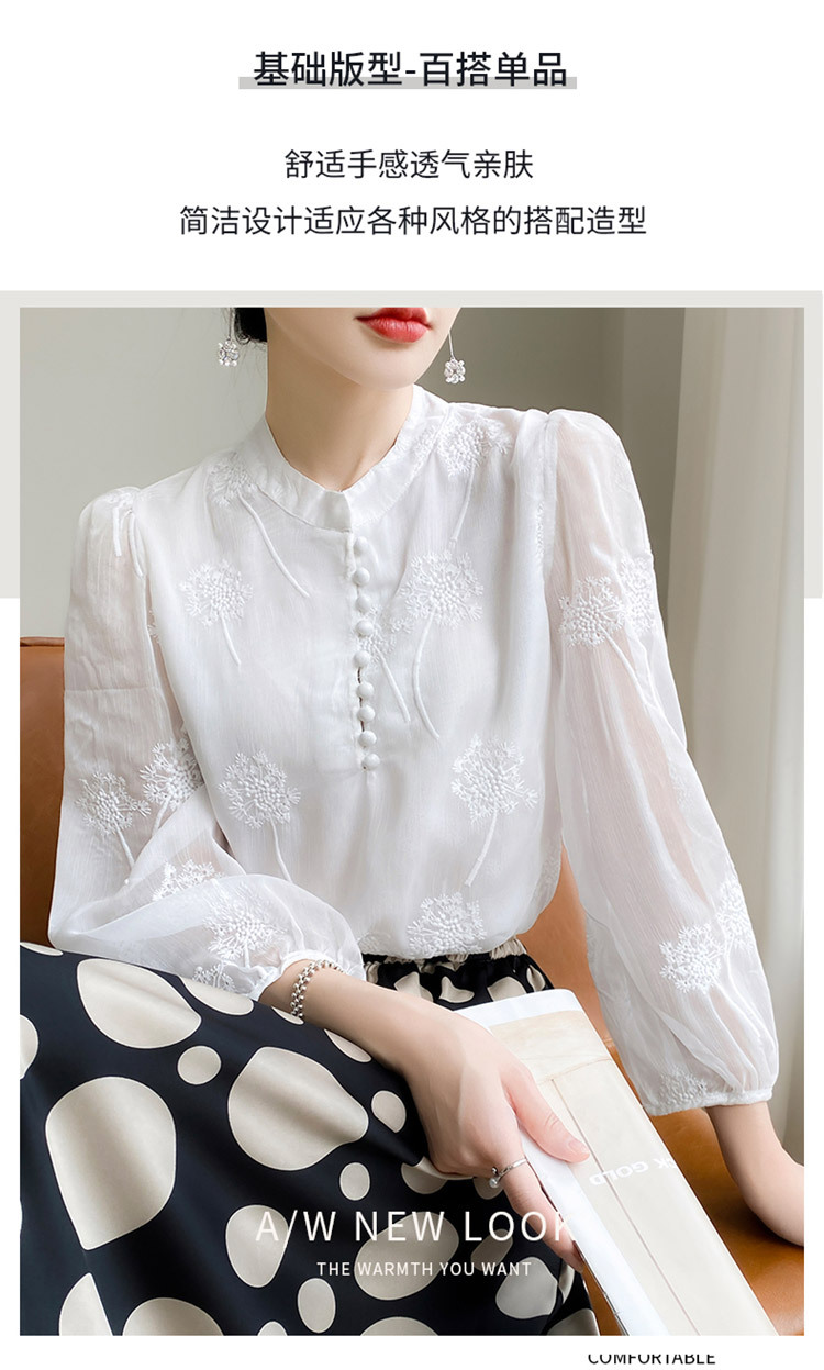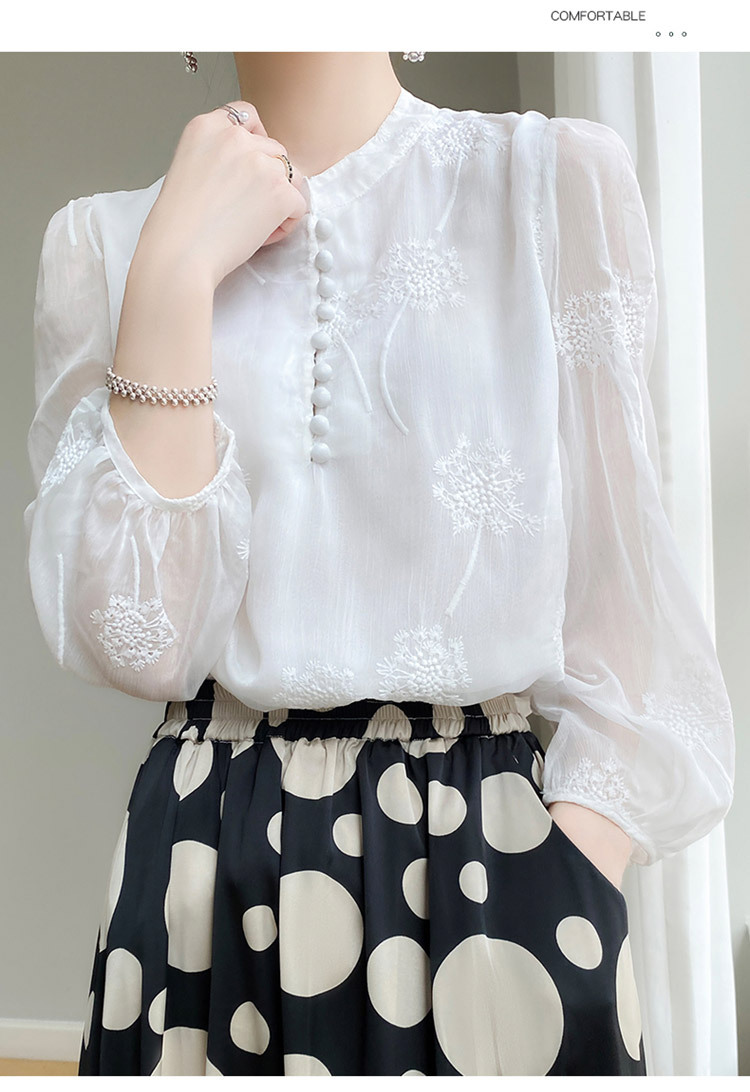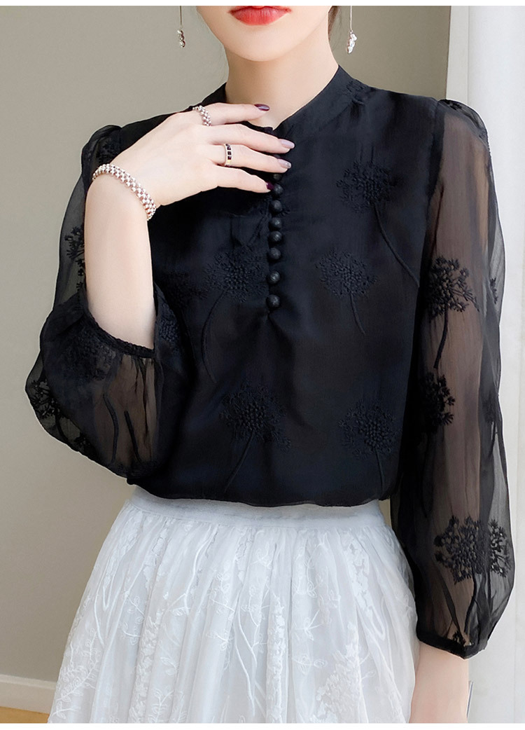 실크 새로운 중국 스타일 최고 여성 셔츠 긴 소매 태양 보호 자수 우아한 멀 베리 실크 스탠드 칼라 쉬폰 셔츠