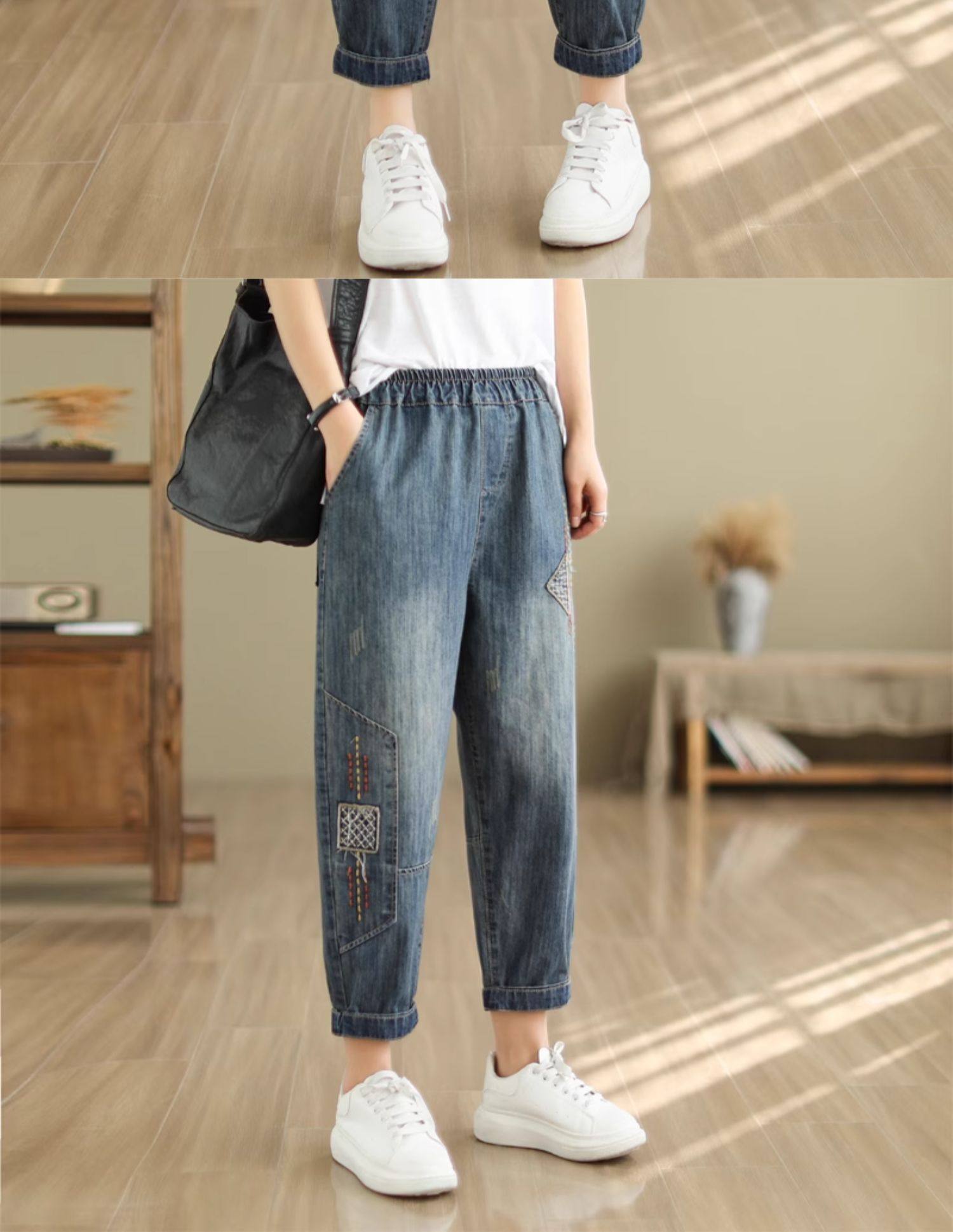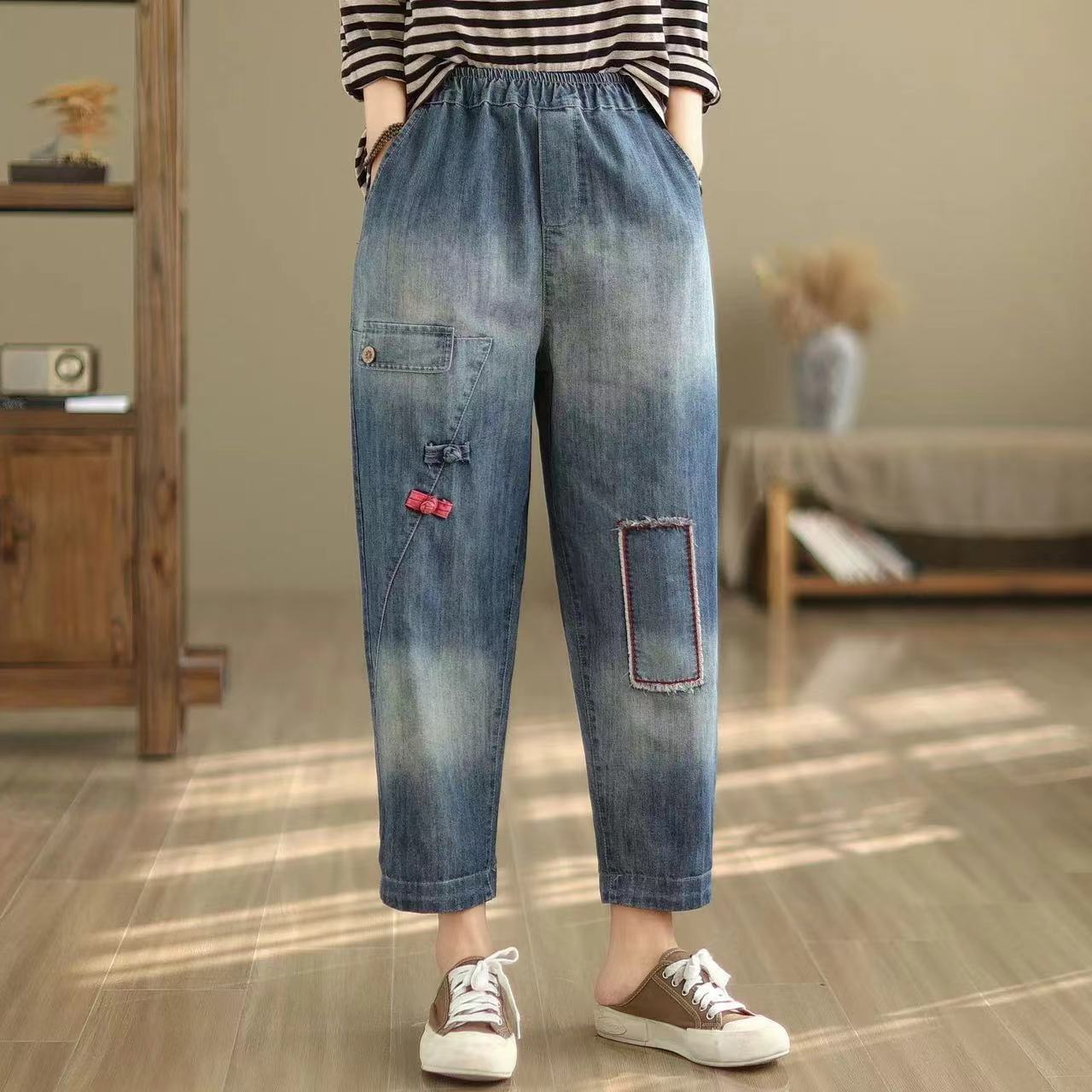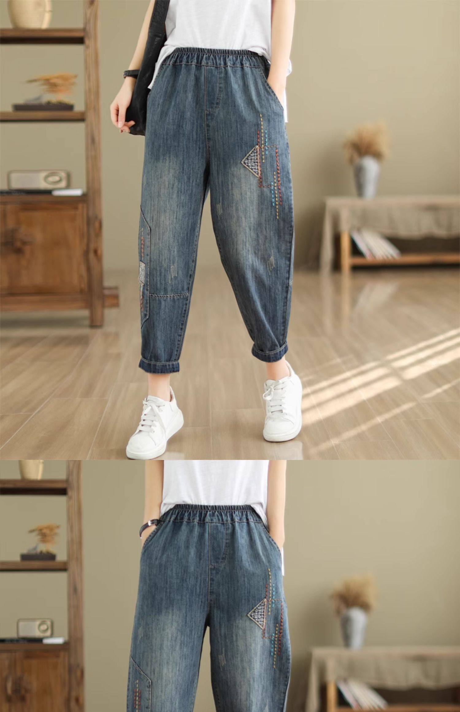 자수 씻은 고민 데님 자른 바지 년 탄성 허리 할머니 바지 무거운 작업 여성 하렘 바지 아빠 바지스토어 가기