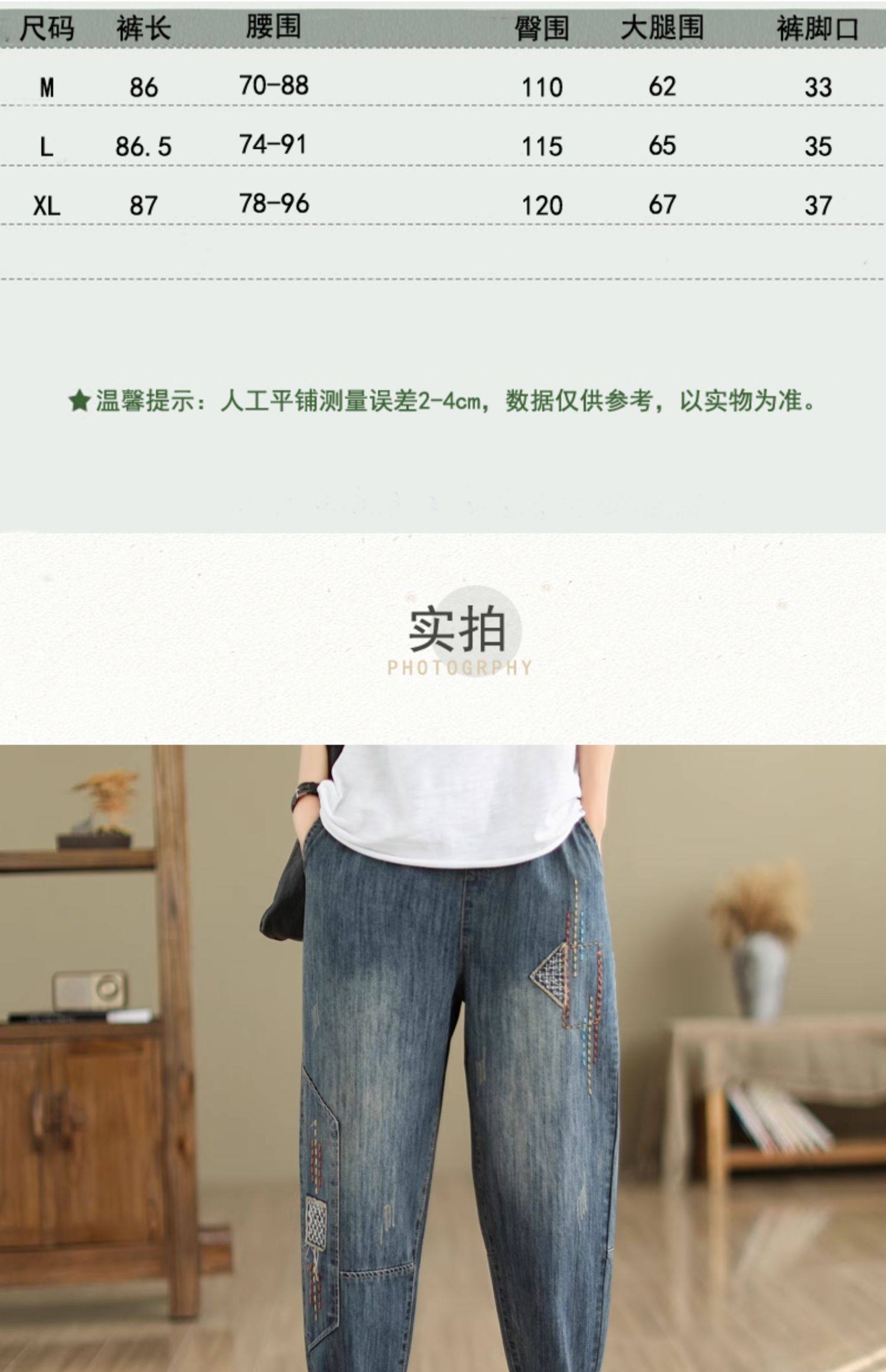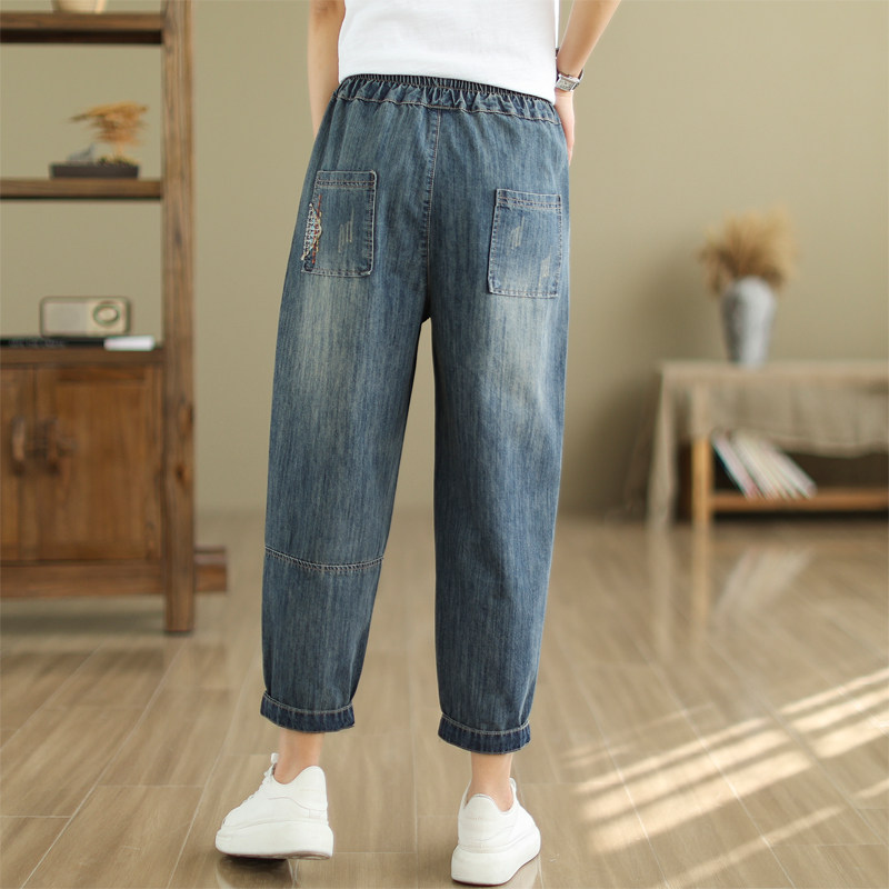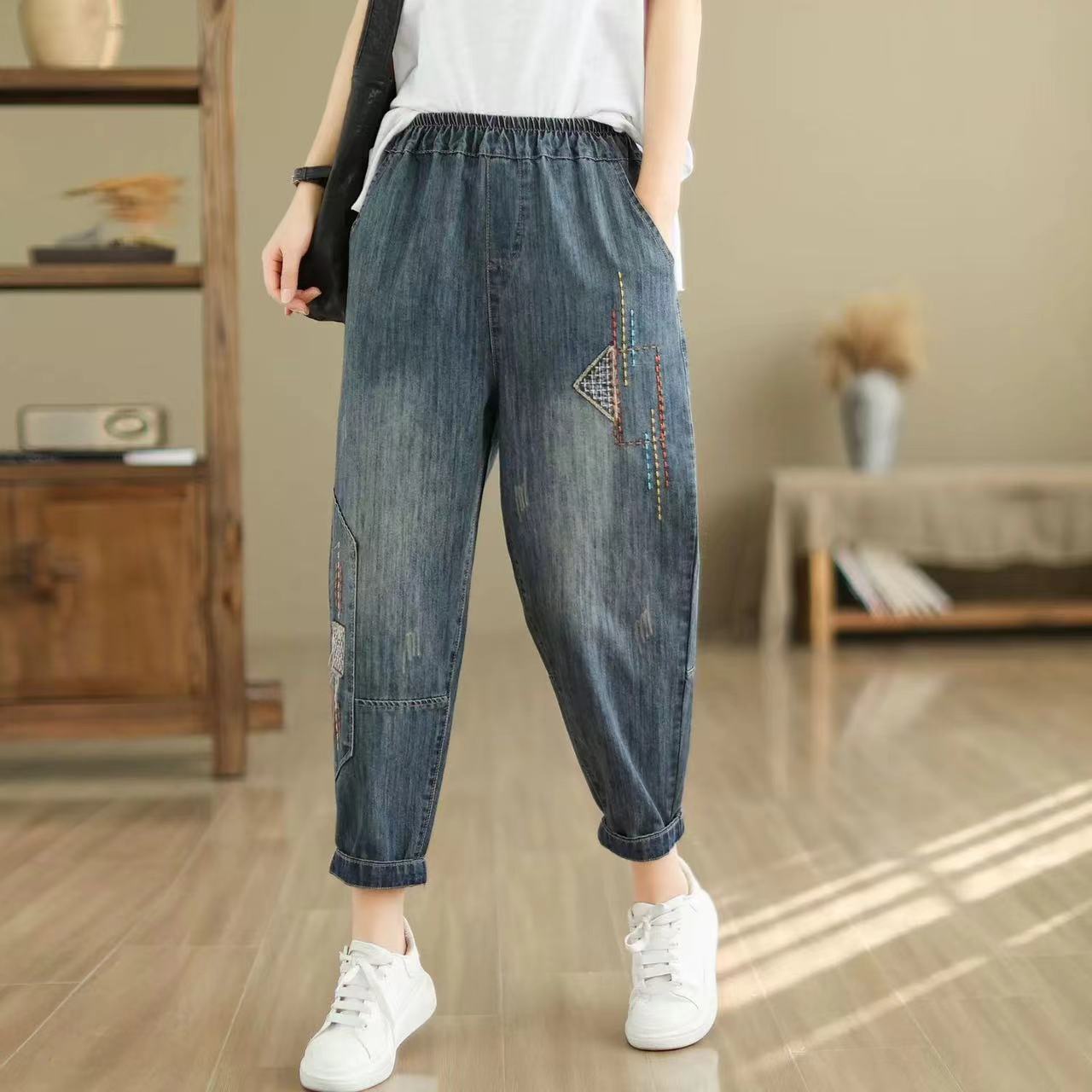 자수 씻은 고민 데님 자른 바지 년 탄성 허리 할머니 바지 무거운 작업 여성 하렘 바지 아빠 바지스토어 가기