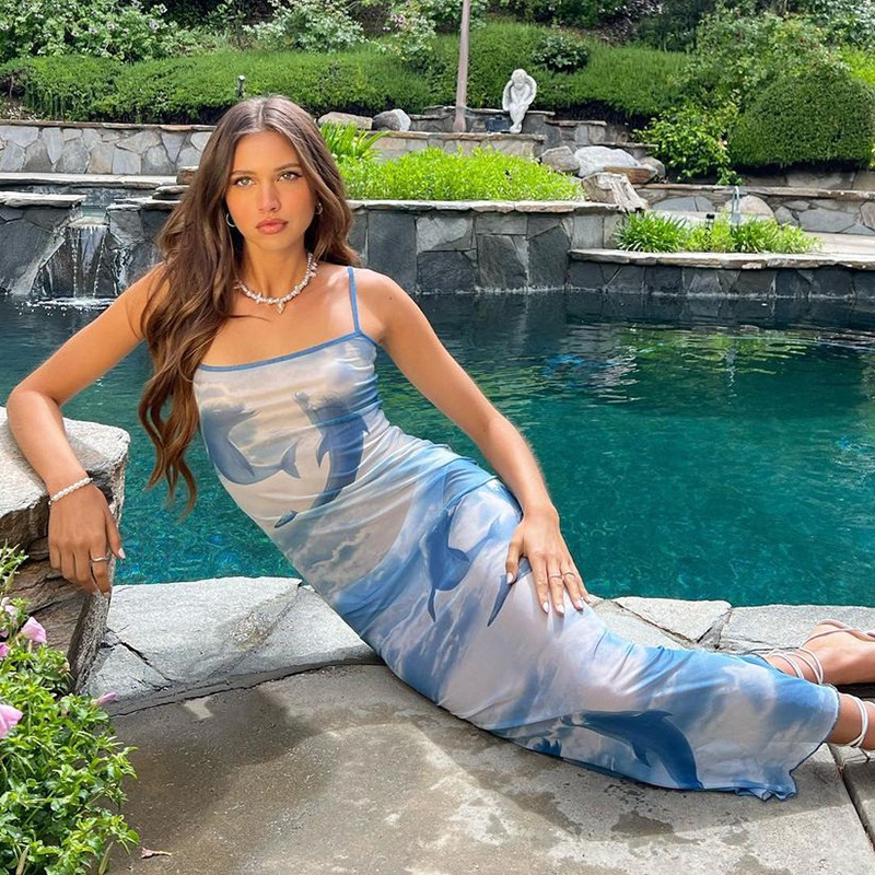 국경 간 대외 무역 유럽과 미국 여성 의류 2024 여름 긴 돌고래 프린트 엉덩이 스커트 섹시한 스트랩 타이트 원피스