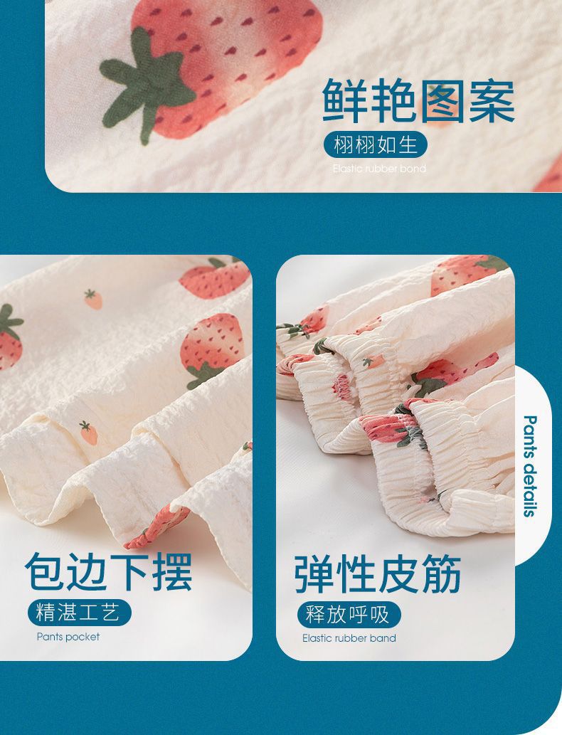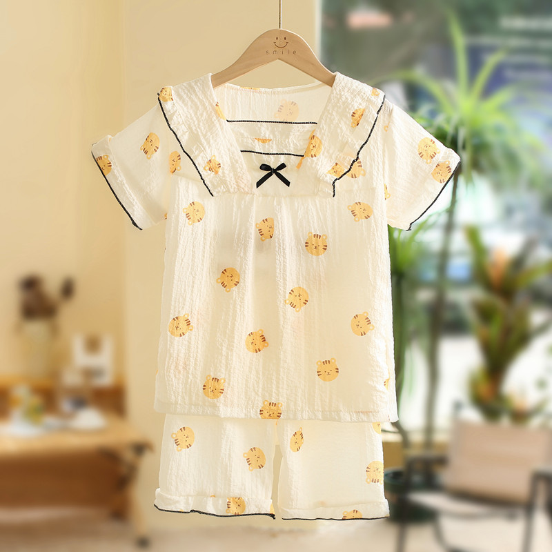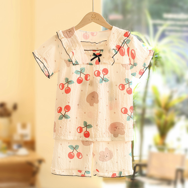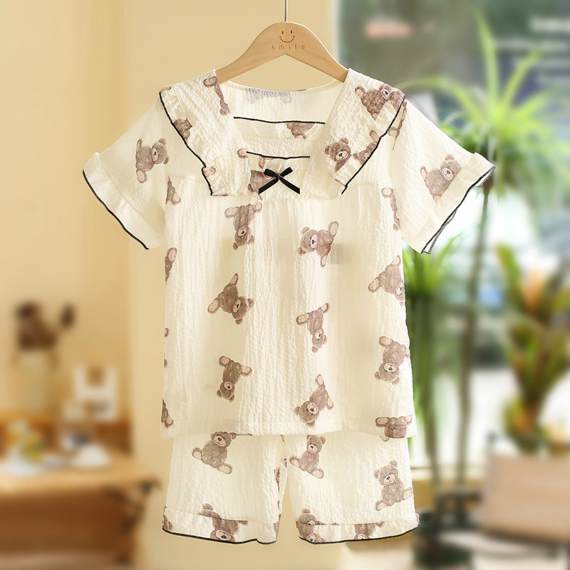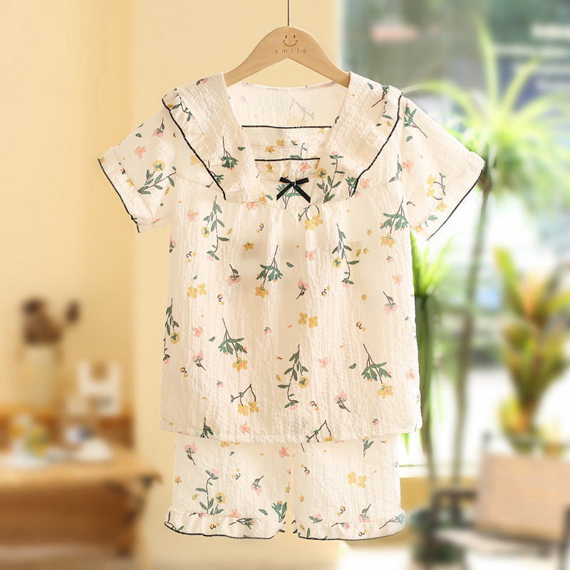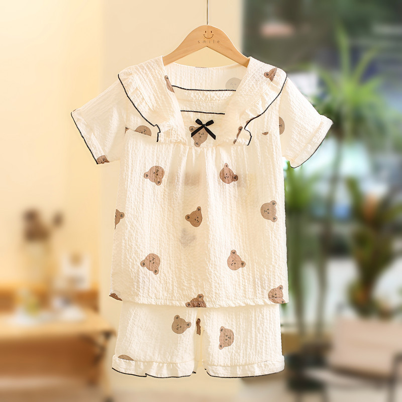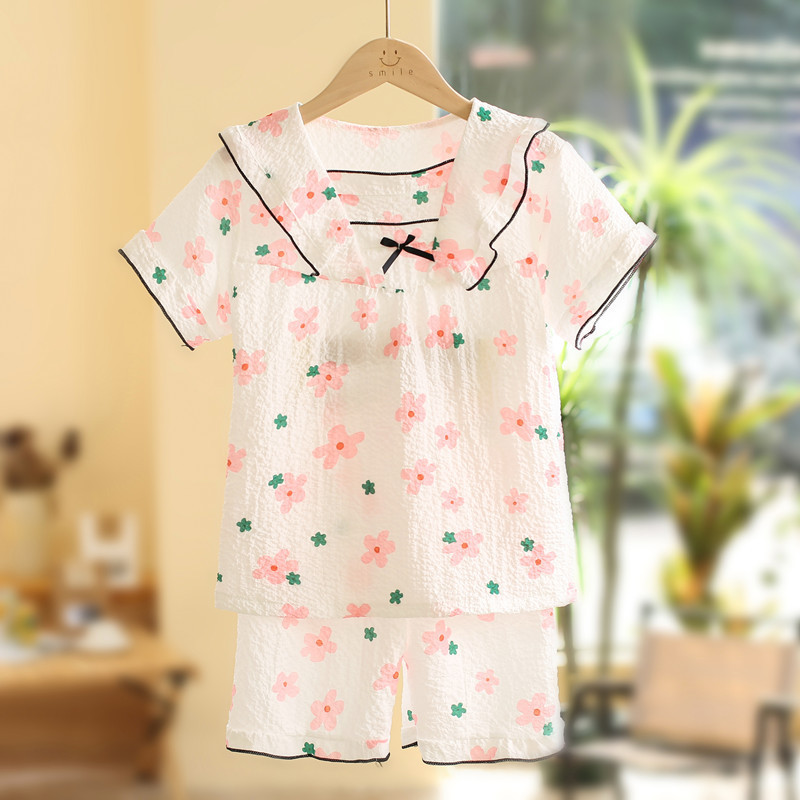 어린이 잠옷 여름 반소매 버블 크레페 달콤한 귀여운 어린 소녀 중년 어린이 아기 홈 세트스토어 가기