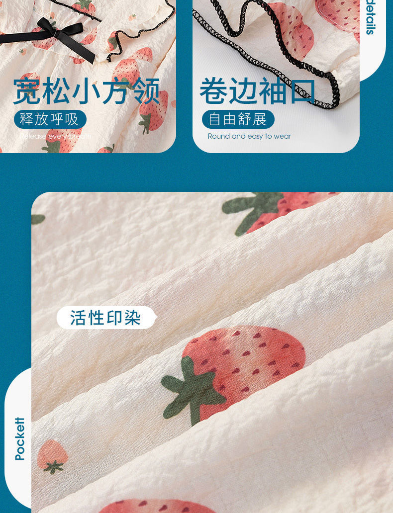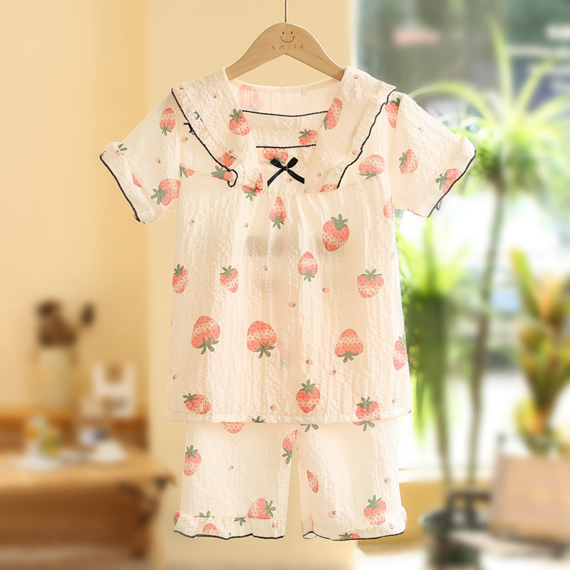 어린이 잠옷 여름 반소매 버블 크레페 달콤한 귀여운 어린 소녀 중년 어린이 아기 홈 세트