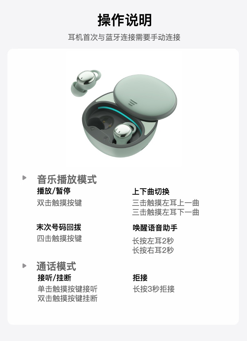 支持功能: 接、打电话/暂停/播放/上一曲/下一曲/音量+/音量-/睡眠模式