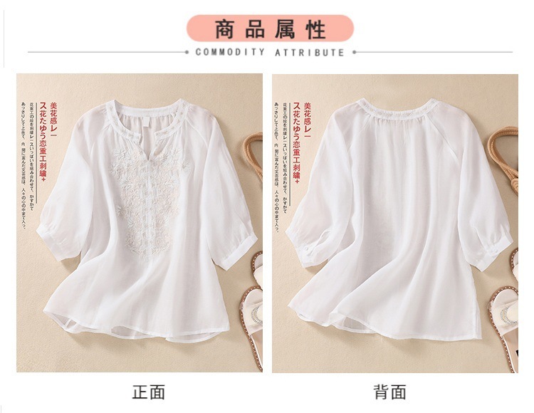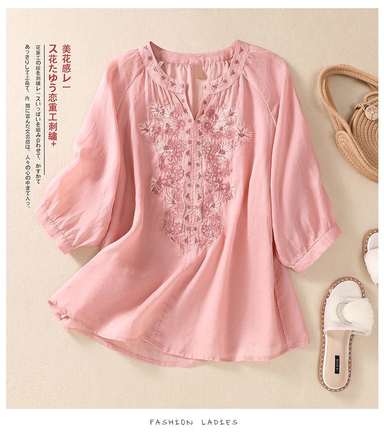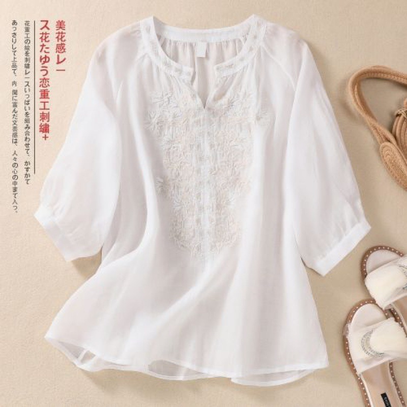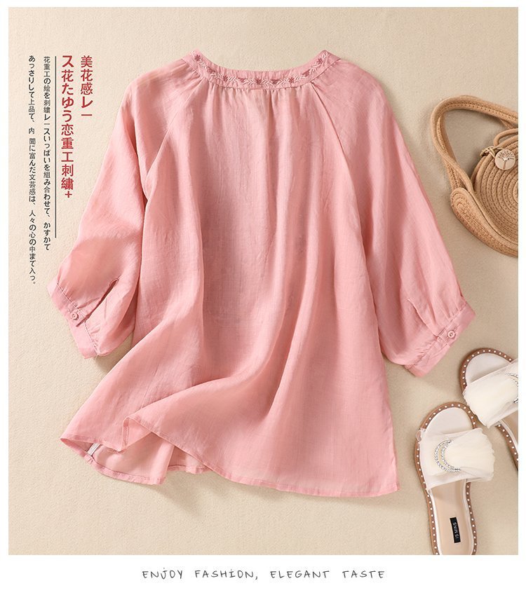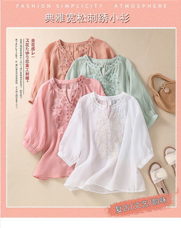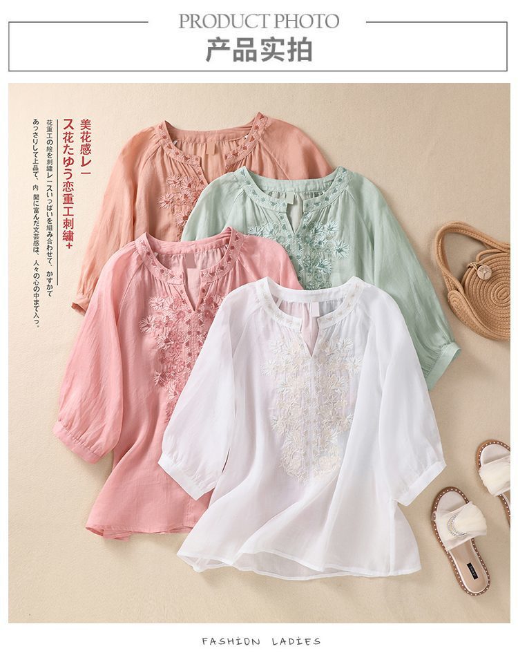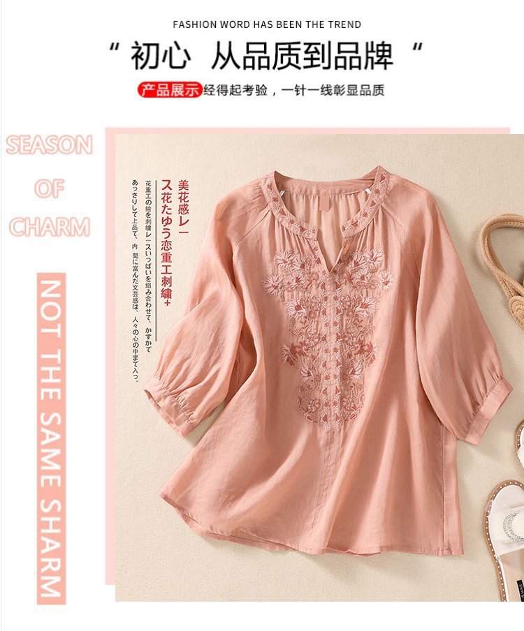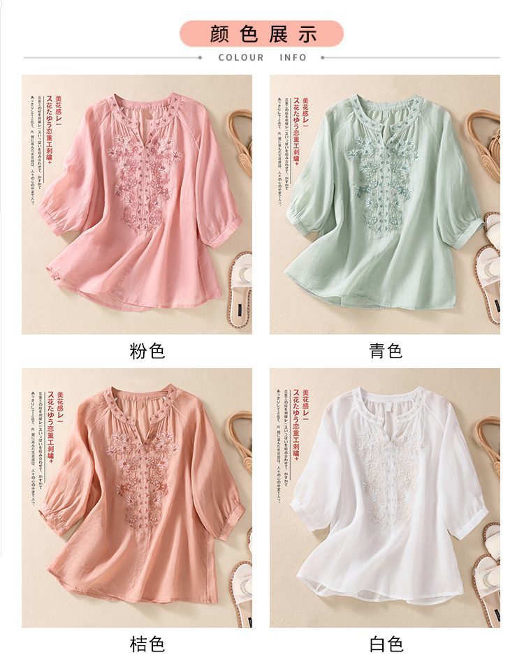 첫 번째 라인 유명한 대외 무역 복고풍면 및 린넨 자수 셔츠 여성의 여름 V 넥 슬리밍 간단한 단색 3/4 소매 탑