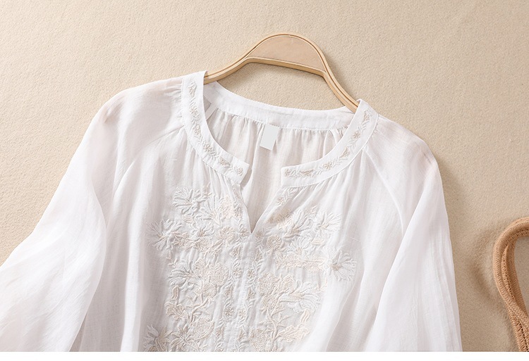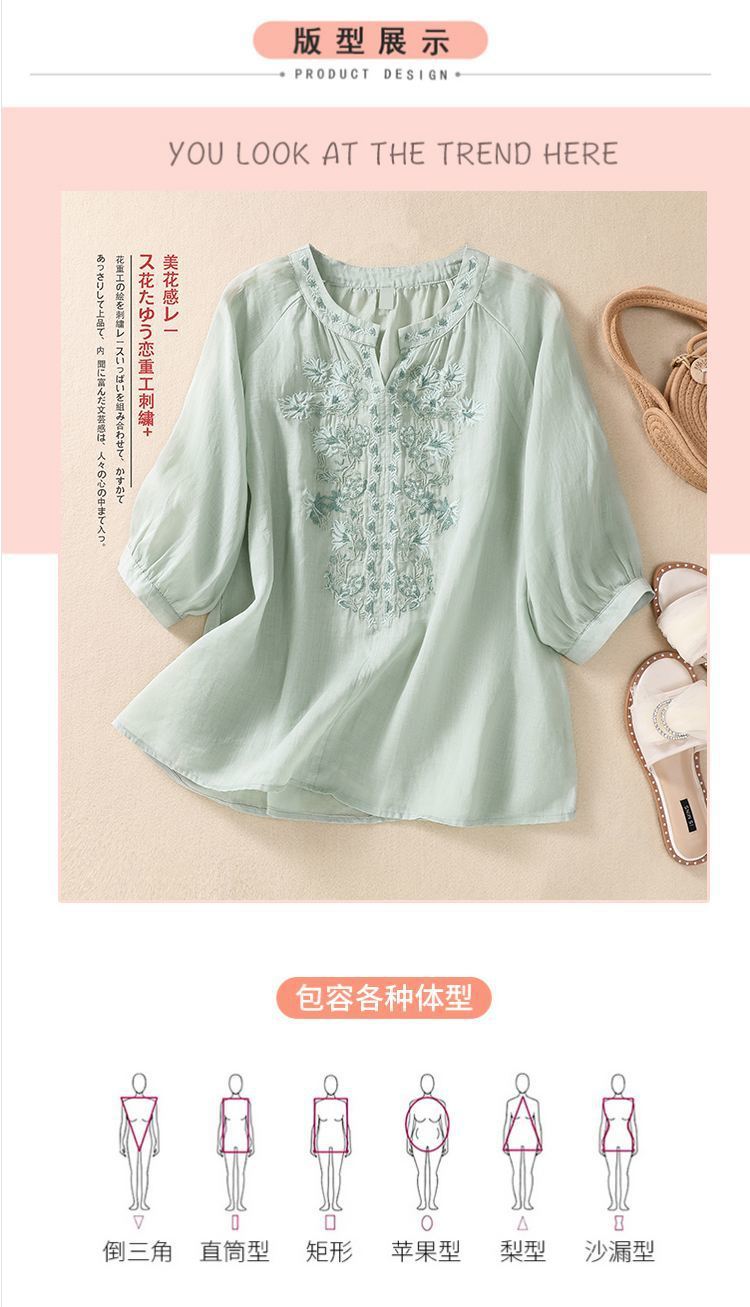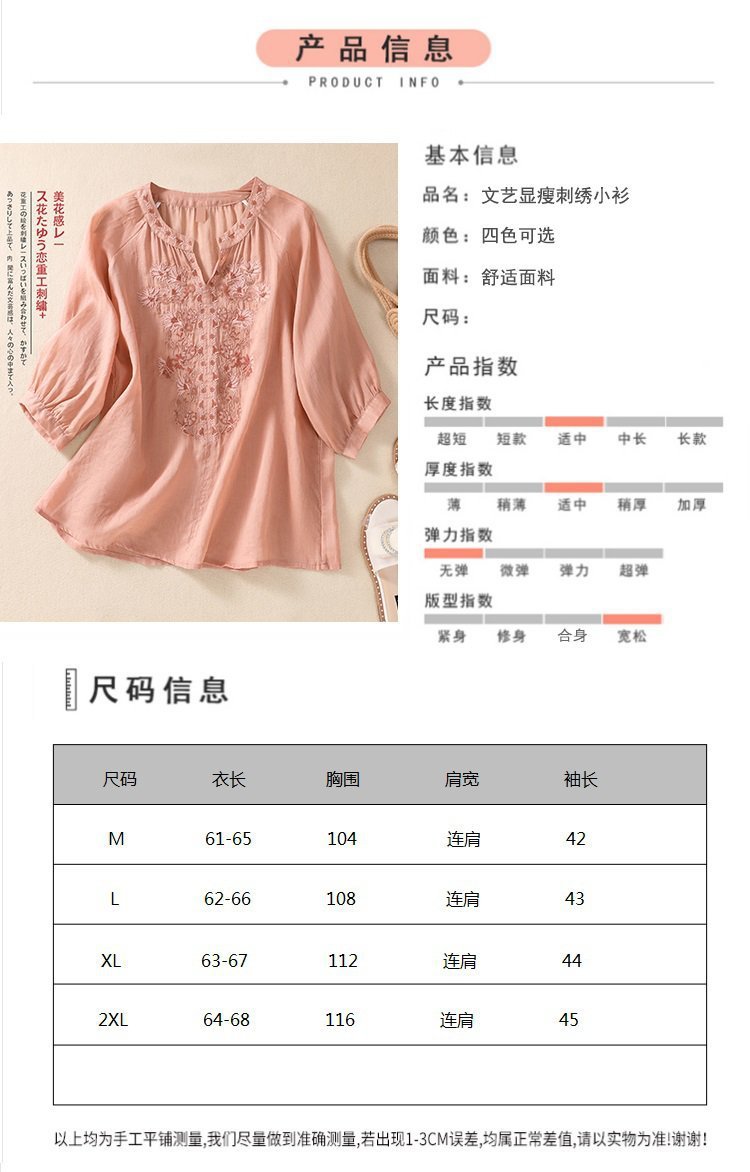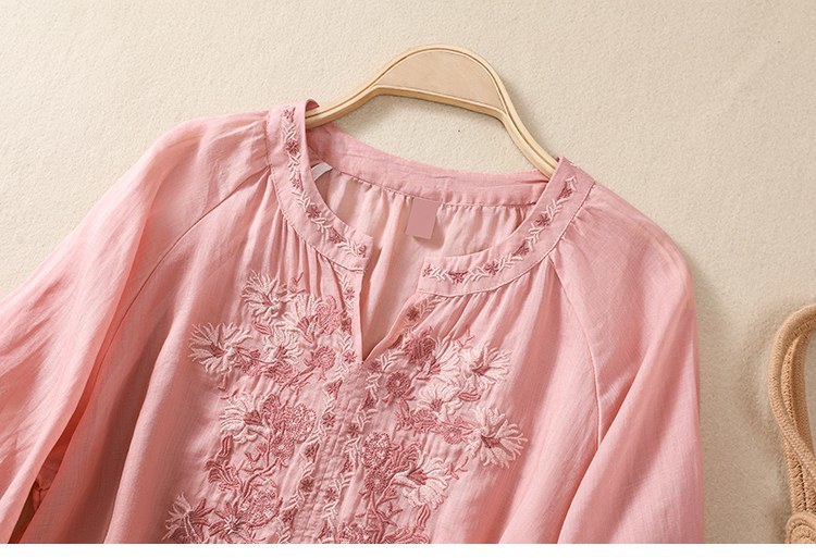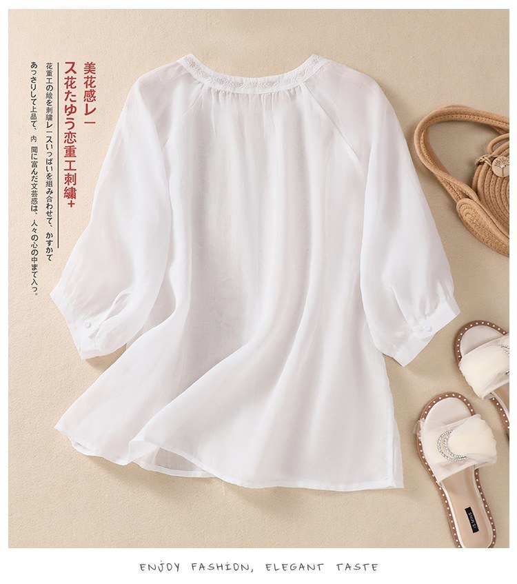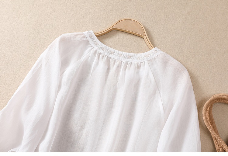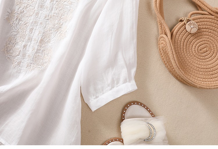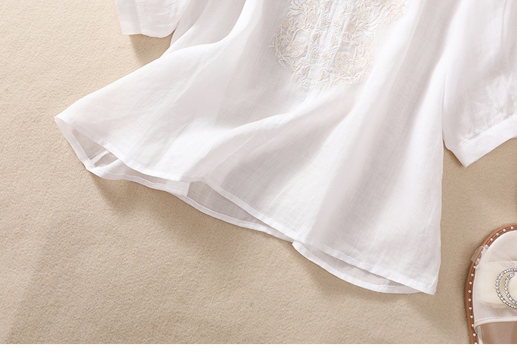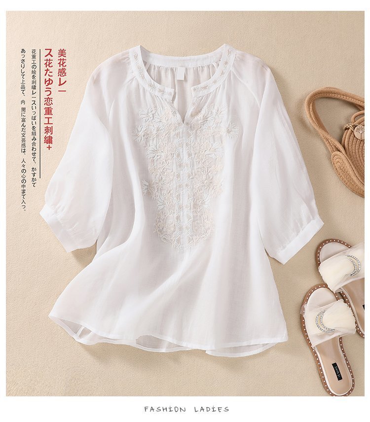 첫 번째 라인 유명한 대외 무역 복고풍면 및 린넨 자수 셔츠 여성의 여름 V 넥 슬리밍 간단한 단색 3/4 소매 탑