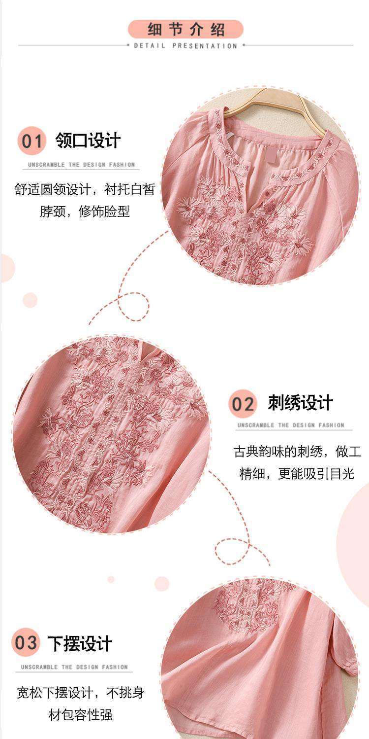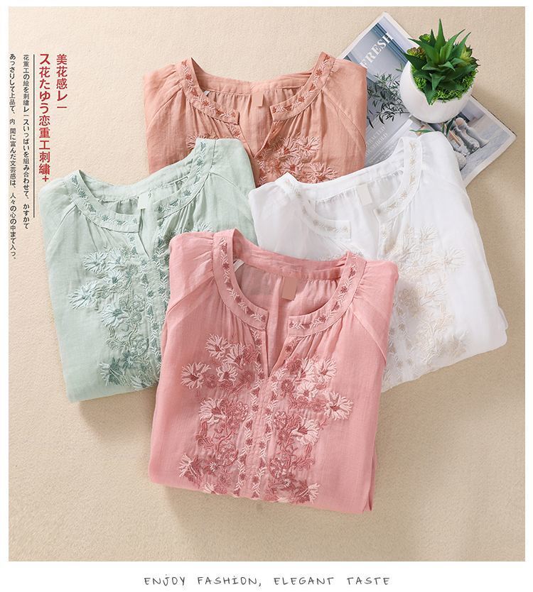 첫 번째 라인 유명한 대외 무역 복고풍면 및 린넨 자수 셔츠 여성의 여름 V 넥 슬리밍 간단한 단색 3/4 소매 탑스토어 가기
