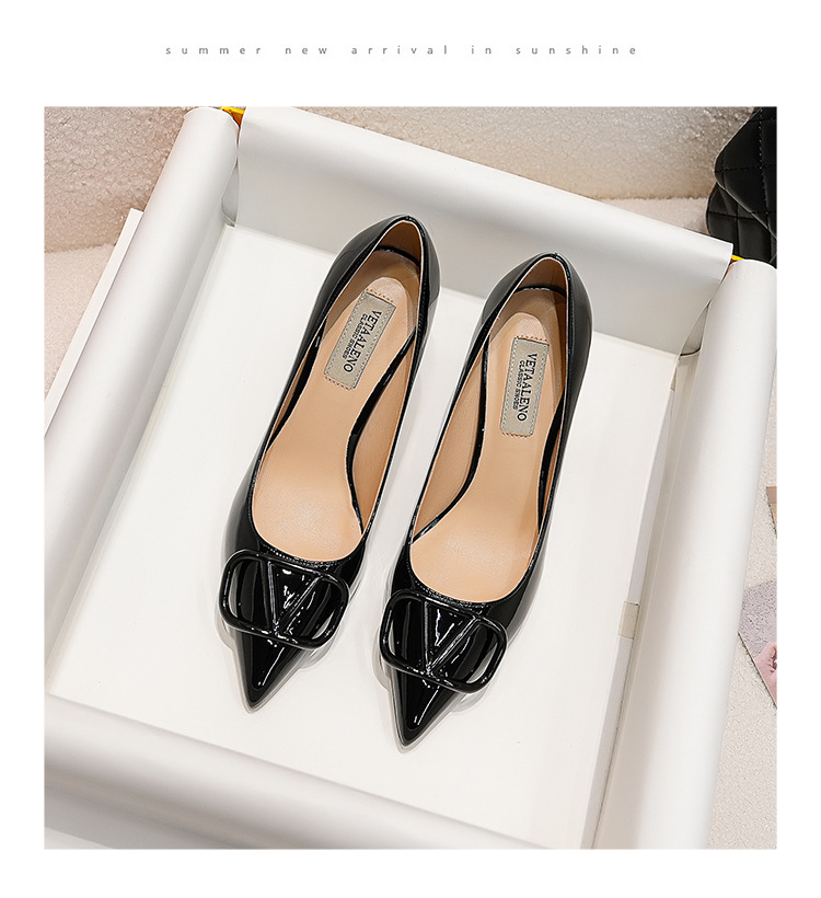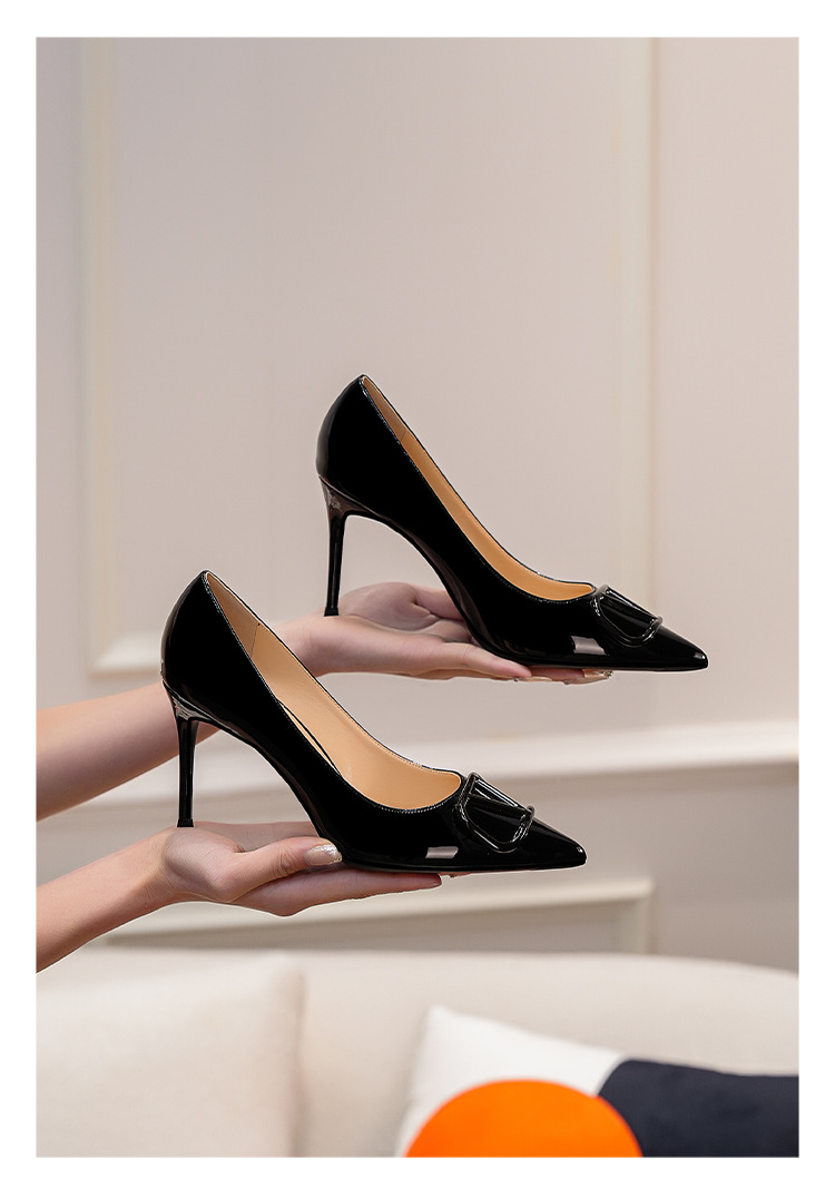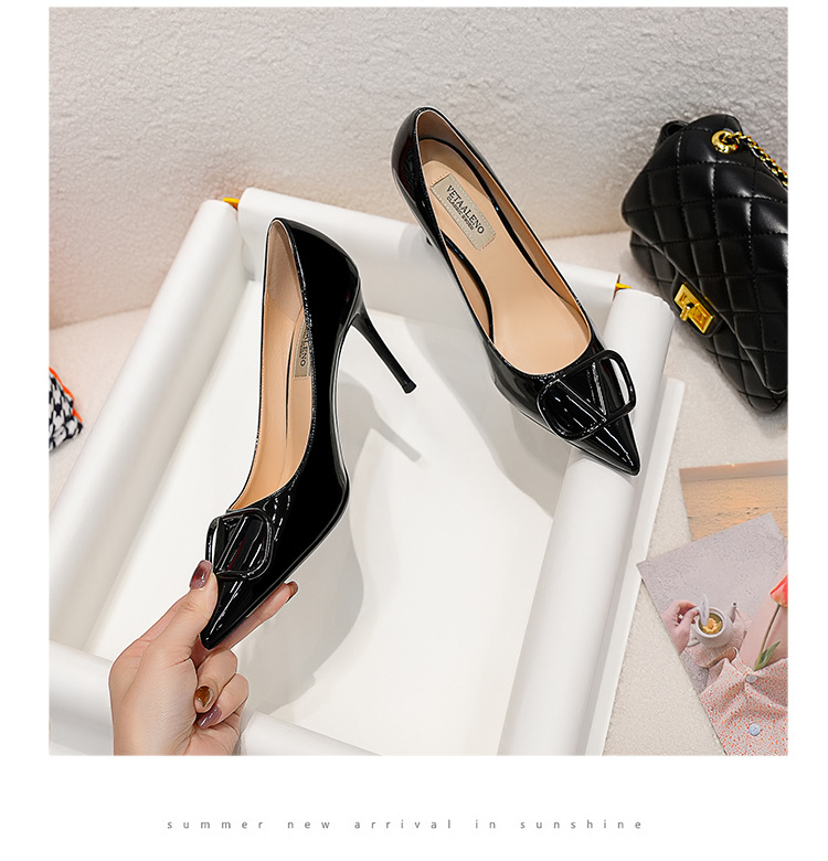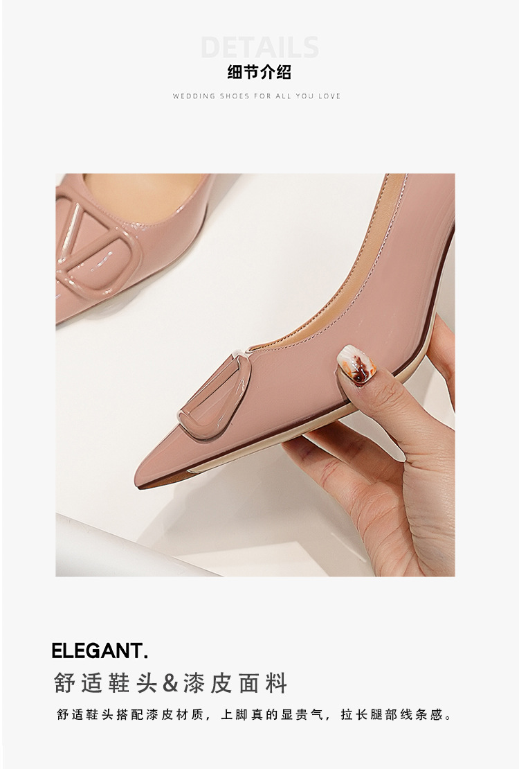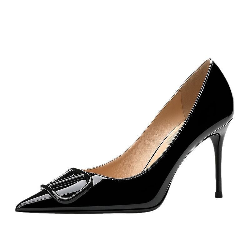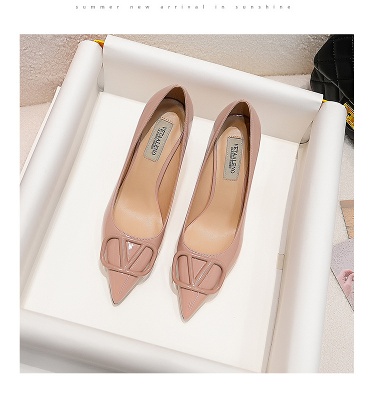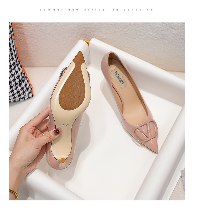 누드 V-버클 하이힐 여성 2025 년 새 도착 스틸레토 포인티드 발톱 입 올매치 섹시 전문 OL 특허 가죽 신발스토어 가기