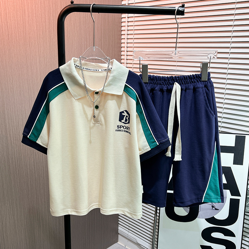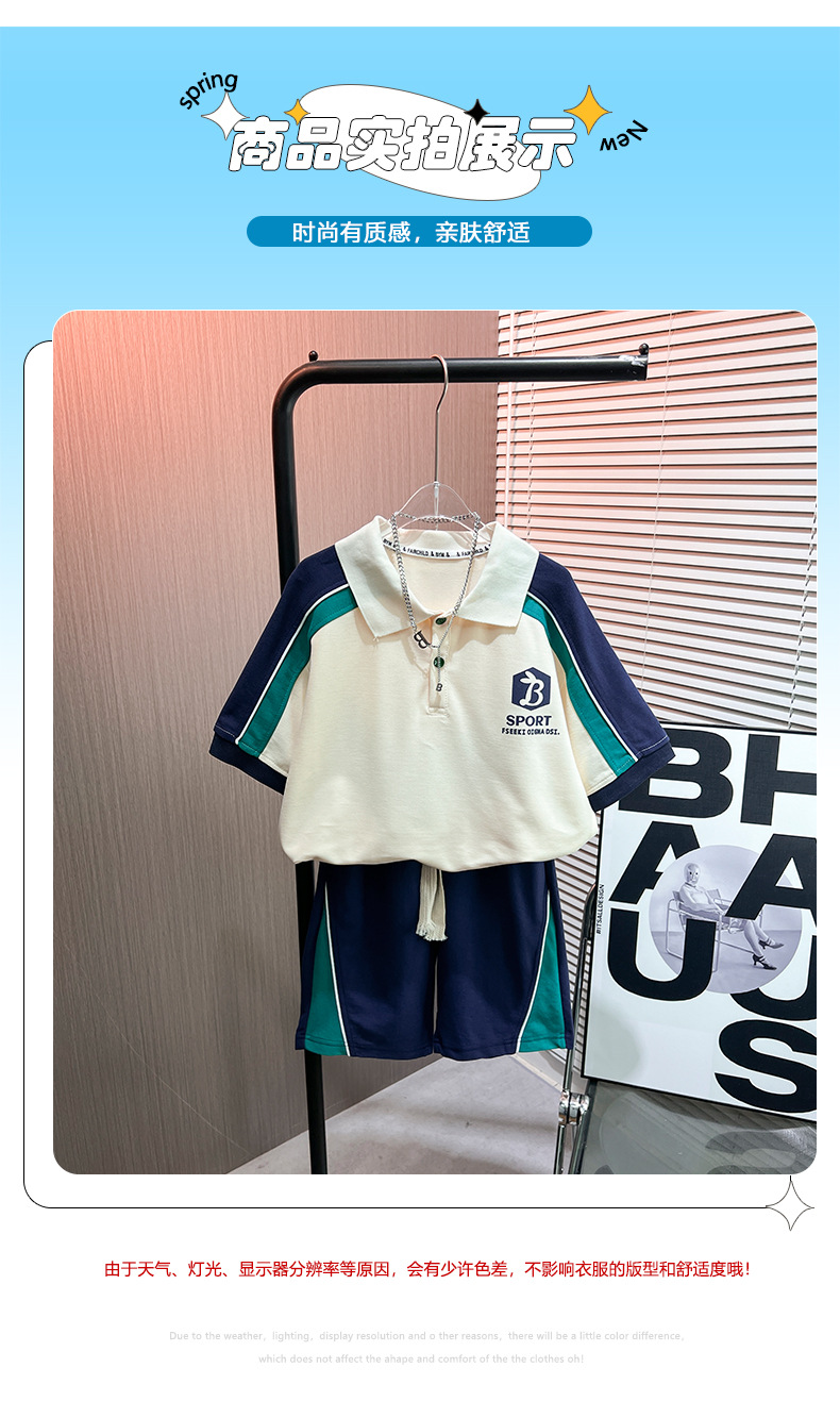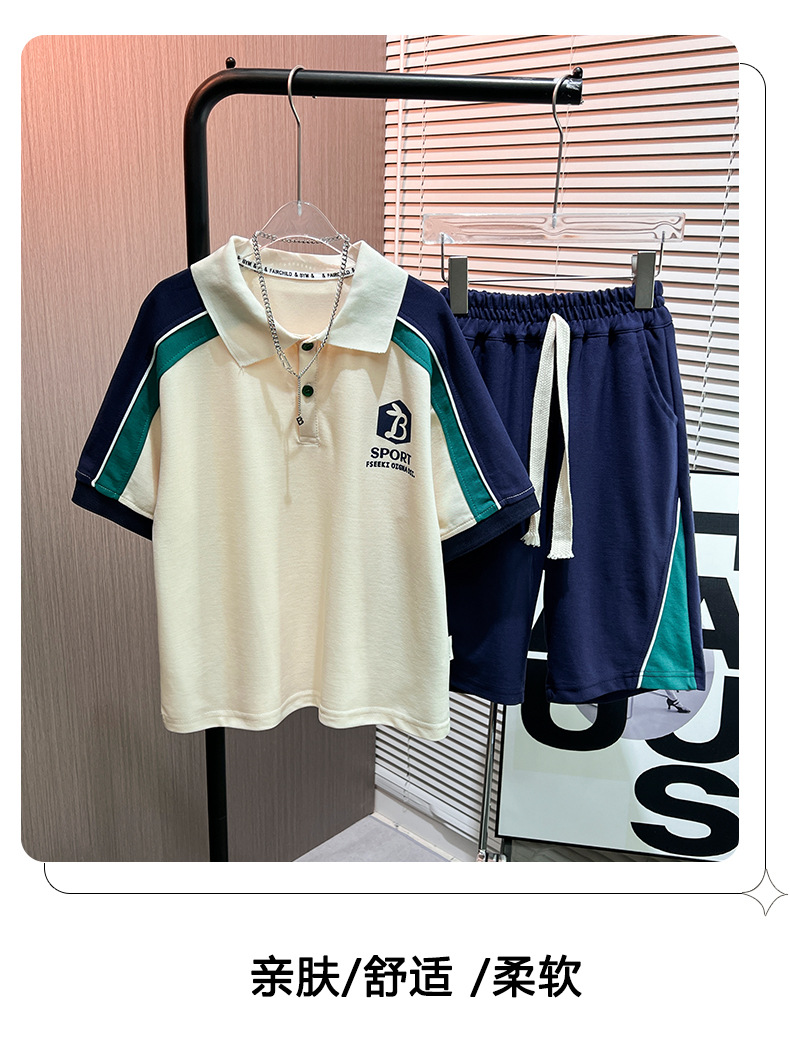 남학생 반팔 세트 2024 여름 새로운 라르 탑 미들 및 빅 어린이 캐주얼 컬러 매칭 반바지 투피스 티셔츠스토어 가기