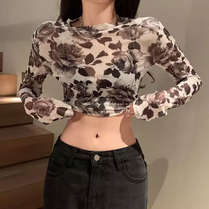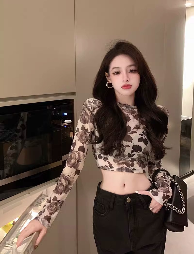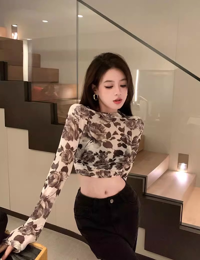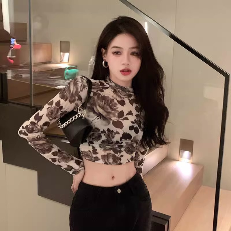 2024 봄과 여름 새로운 빈티지 틈새 유행 꽃 올 매치 슬리밍 허리 슬림 핏 긴팔 티셔츠 여성베이스스토어 가기