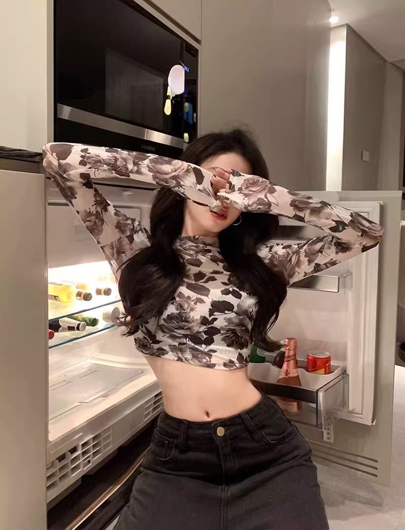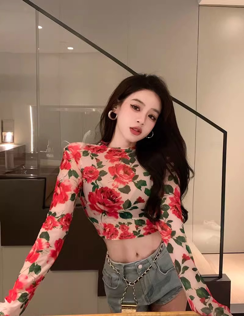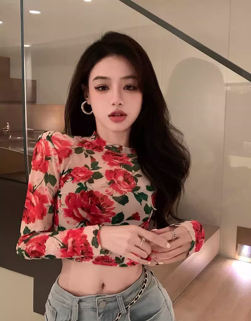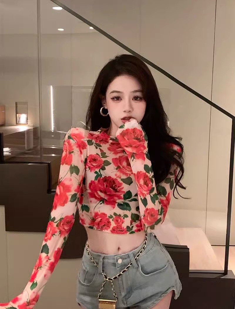 2024 봄과 여름 새로운 빈티지 틈새 유행 꽃 올 매치 슬리밍 허리 슬림 핏 긴팔 티셔츠 여성베이스스토어 가기