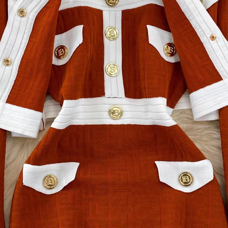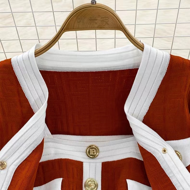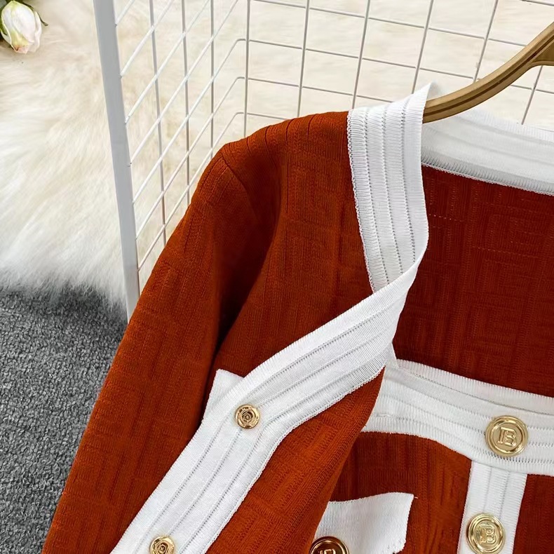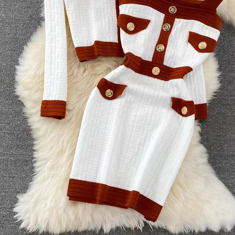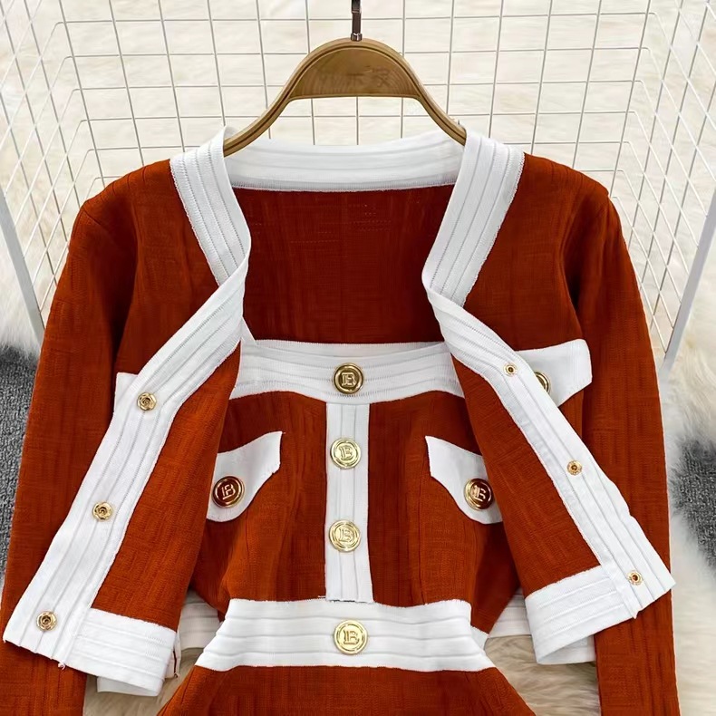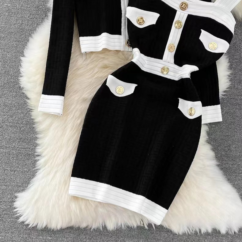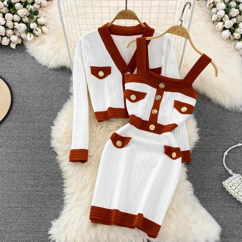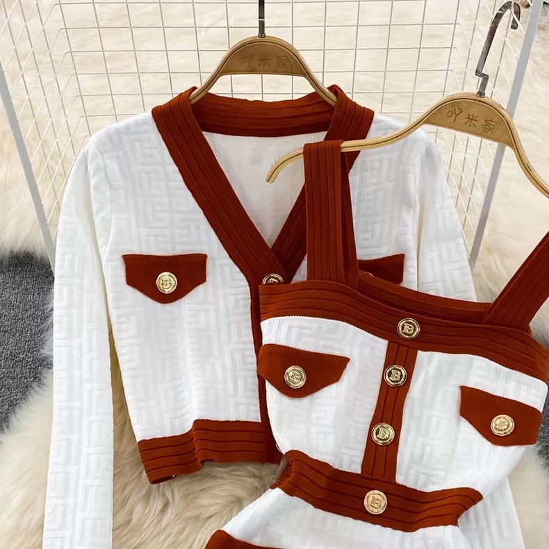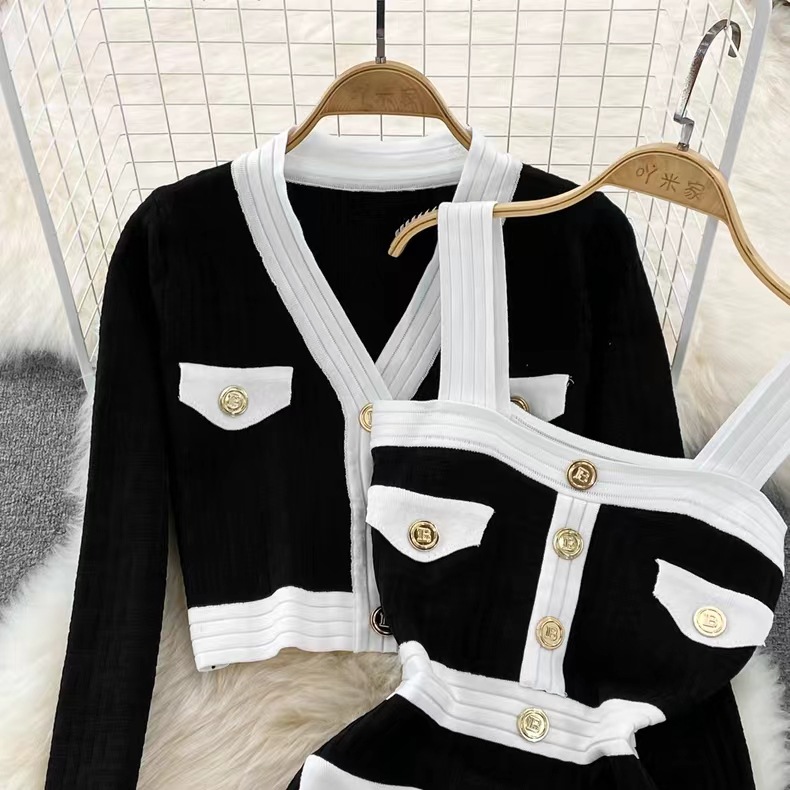 패션 세트 여성 연예인 우아한 V-목 대비 컬러 짧은 니트 재킷 투피스 슬링 힙합 원피스스토어 가기