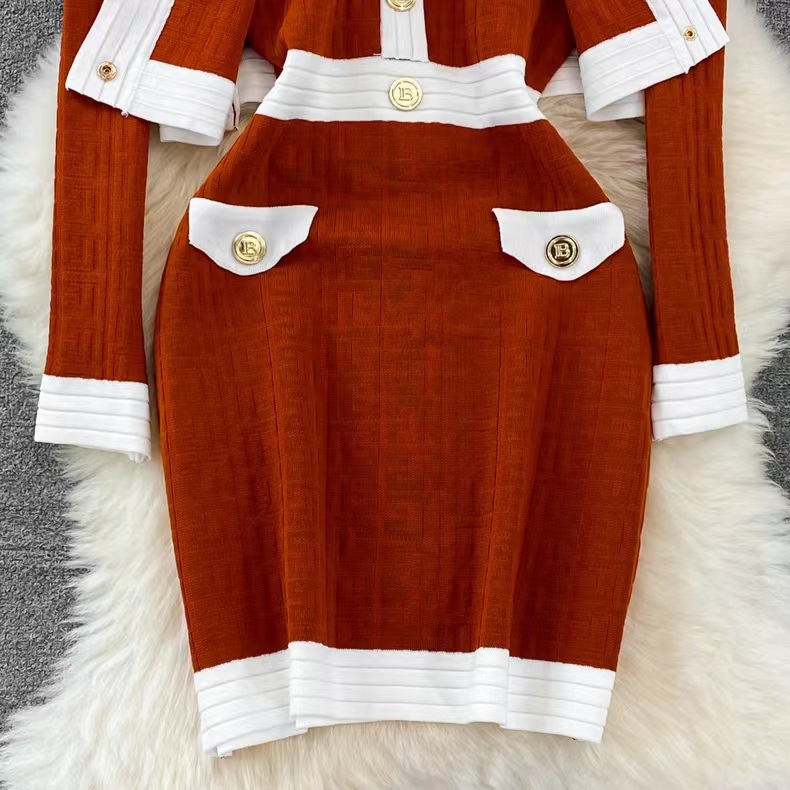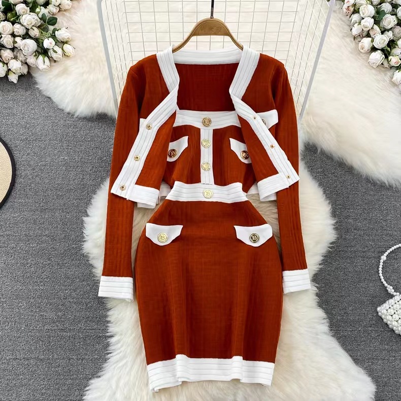 패션 세트 여성 연예인 우아한 V-목 대비 컬러 짧은 니트 재킷 투피스 슬링 힙합 원피스