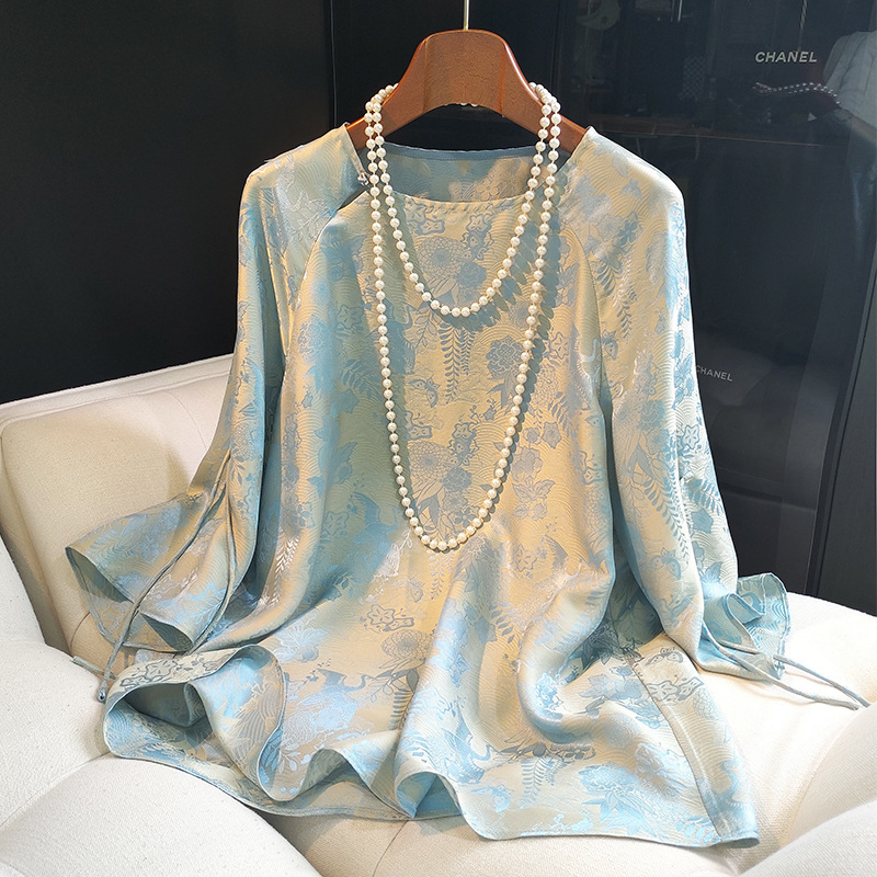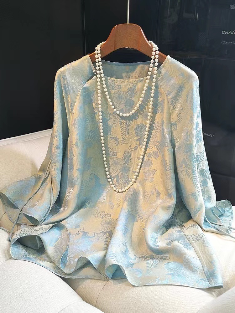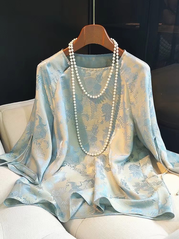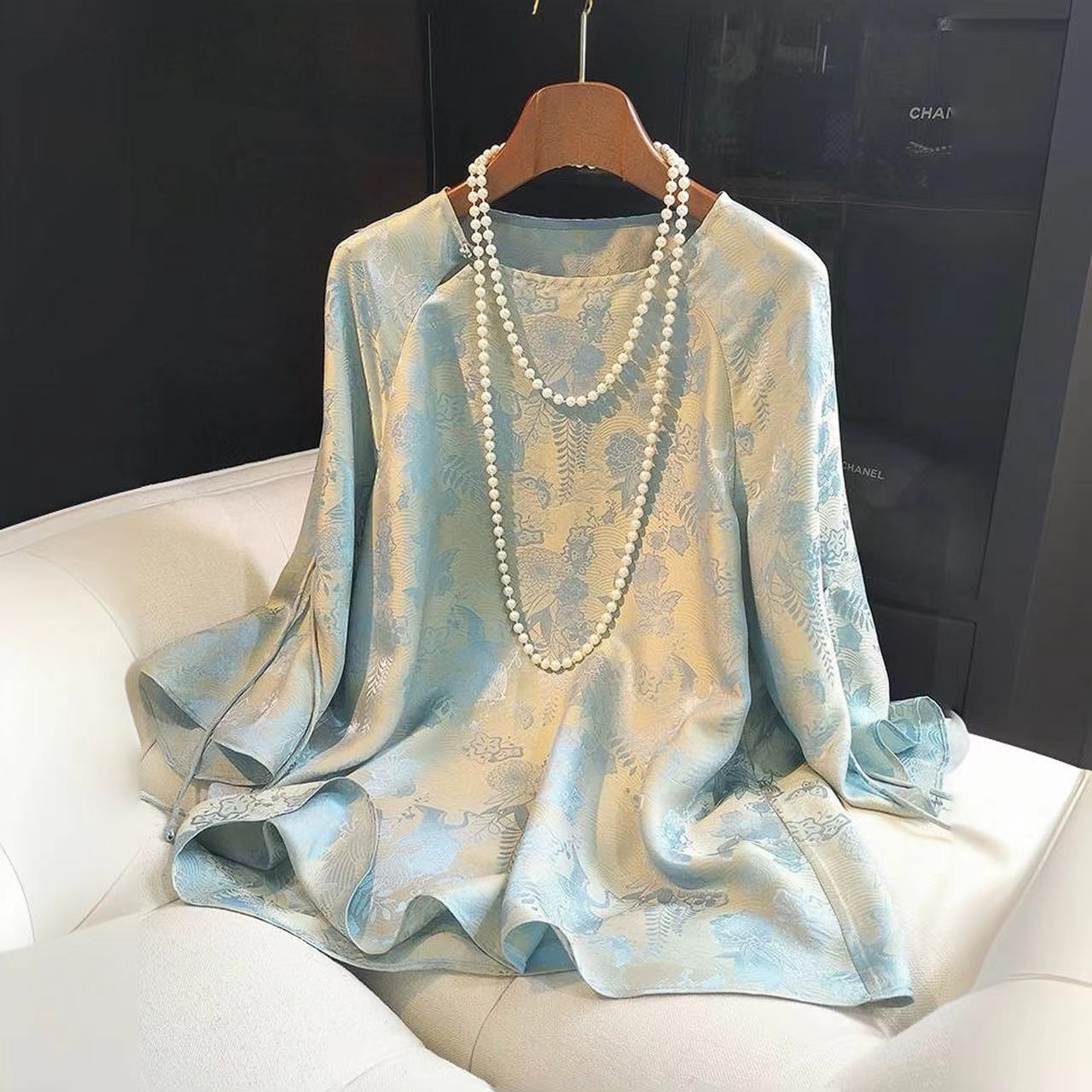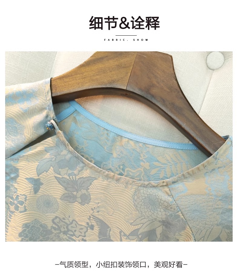 레트로 자카드 탑 여성의 얇은 여름 새로운 개선 된 중국 라운드 넥 캐주얼 하프 소매 인공 실크 셔츠