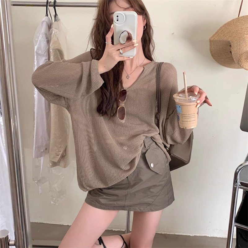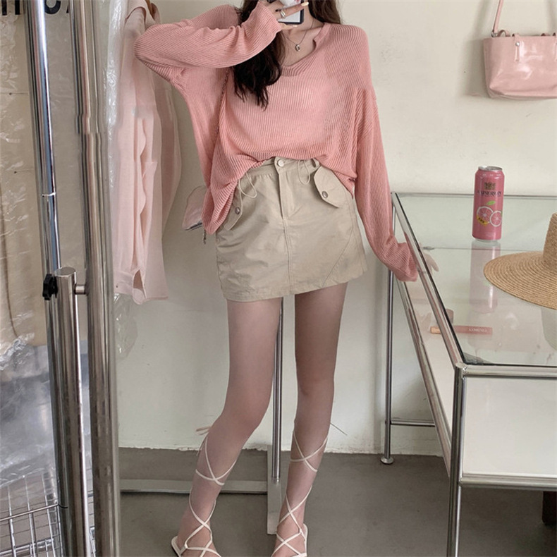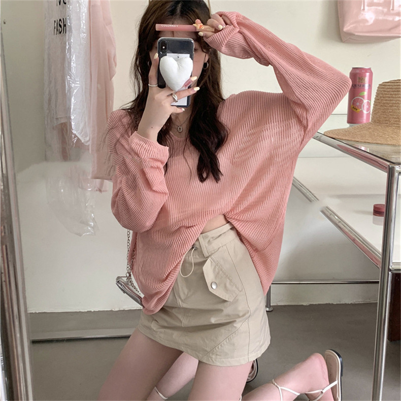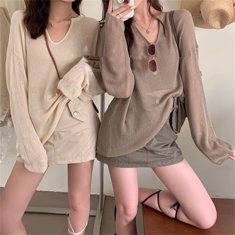 여성을위한 얇은 중공 스웨터 2024 새로운 여름 느슨한 게으른 스타일 긴 소매 큰 V 넥 아이스 실크 탑스토어 가기