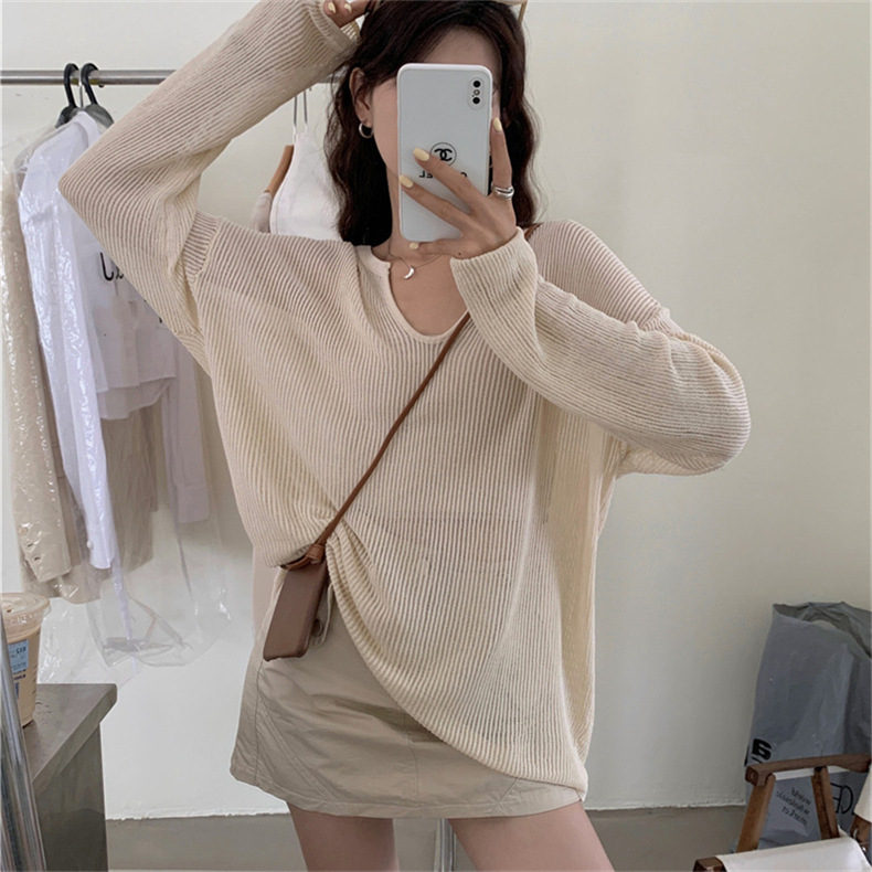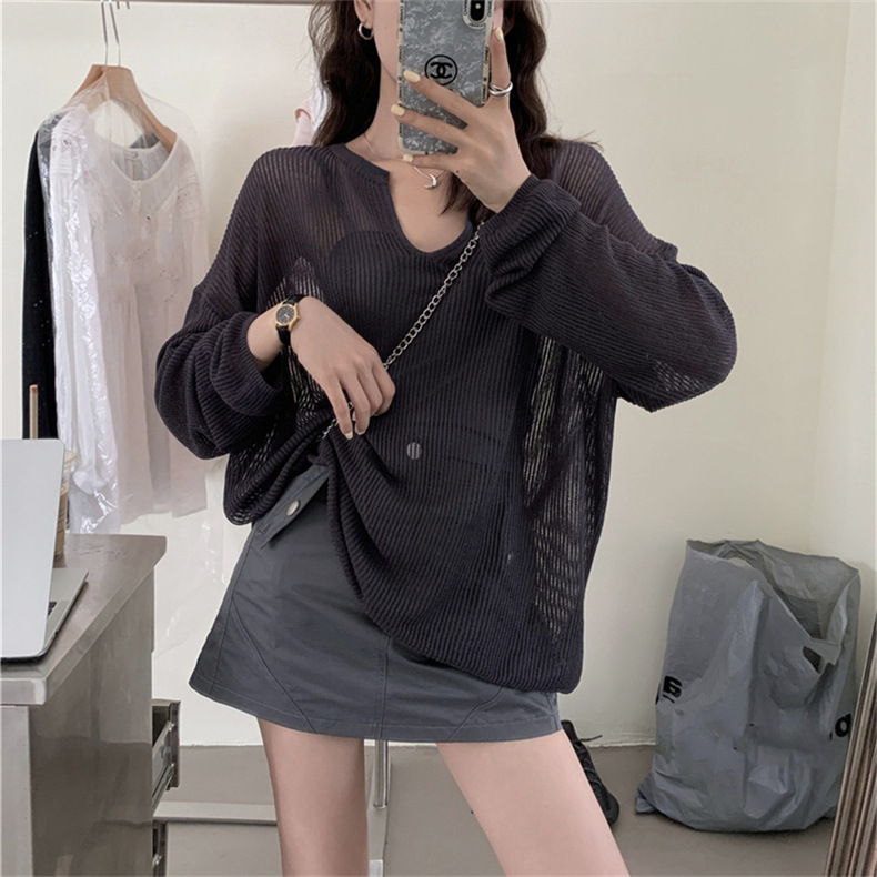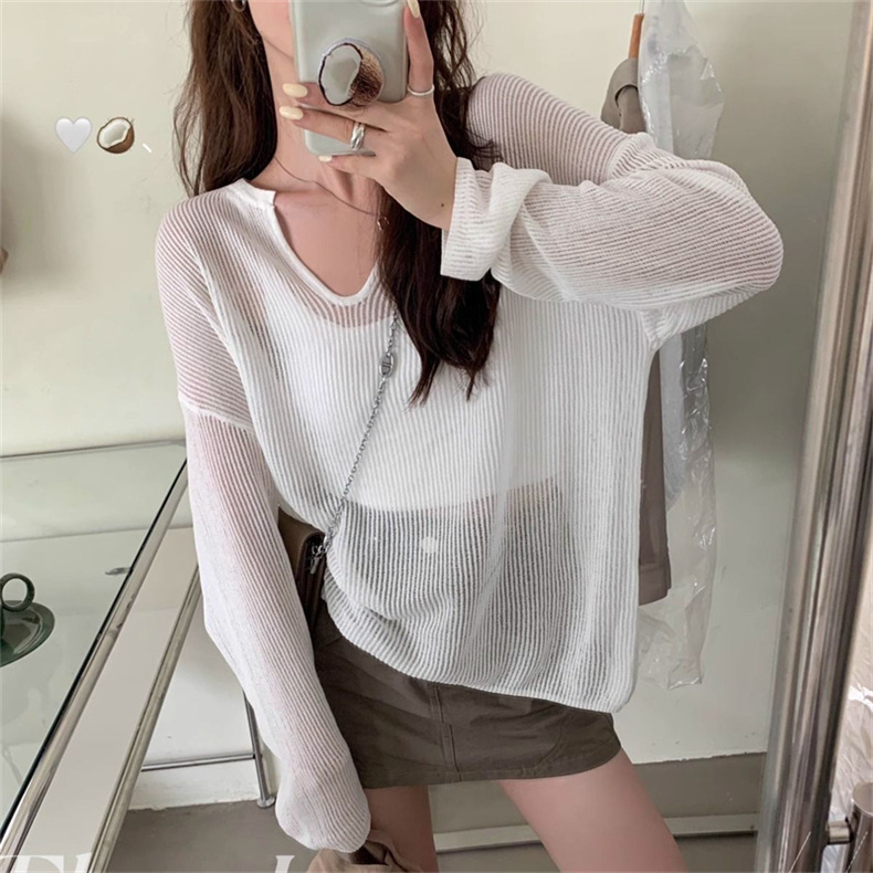 여성을위한 얇은 중공 스웨터 2024 새로운 여름 느슨한 게으른 스타일 긴 소매 큰 V 넥 아이스 실크 탑