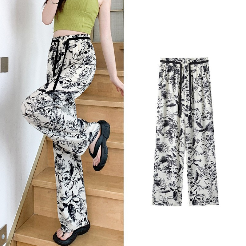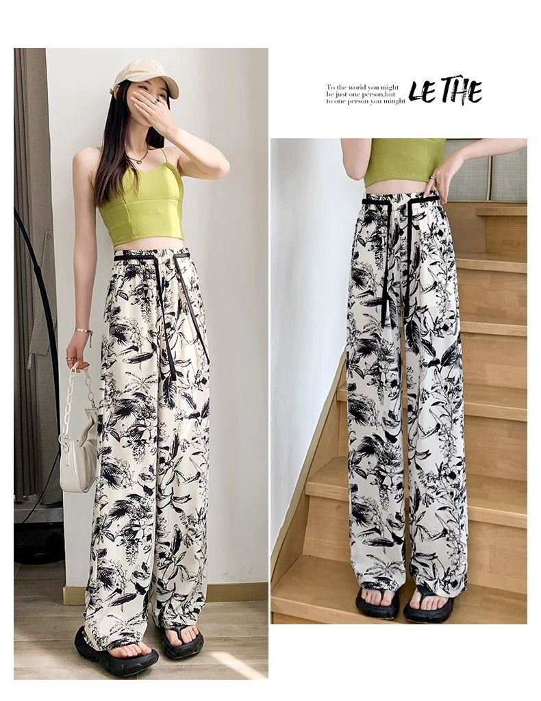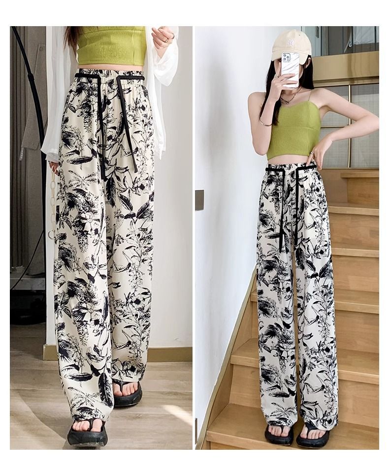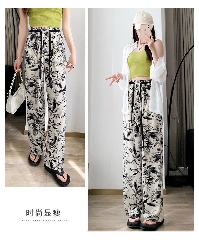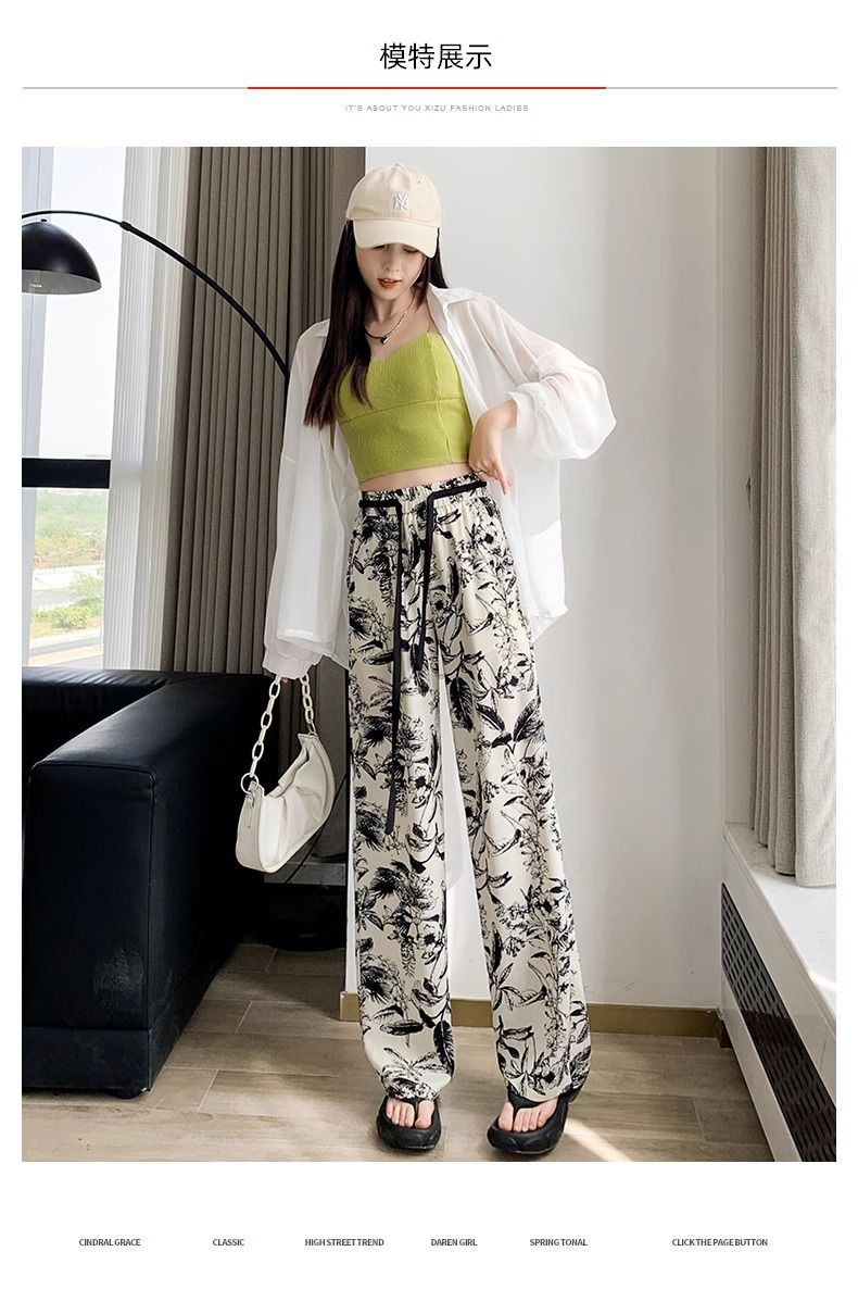 잉크 프린트 쉬폰 와이드 팬츠 여성 여름 슬림 레트로 스트레이트 팬츠 빅사이즈 하이웨이스트 드레이프 캐주얼 팬츠 롱 팬츠
