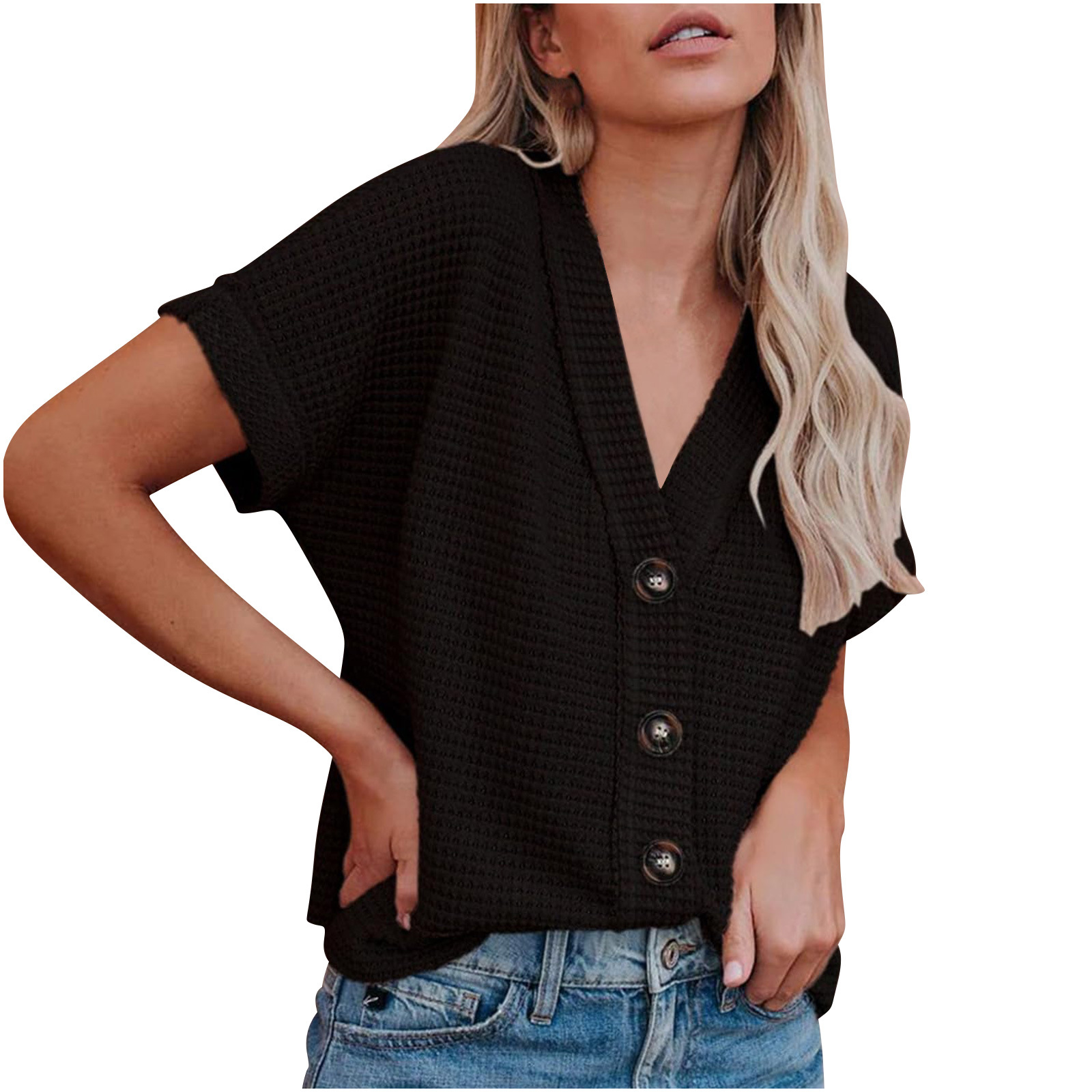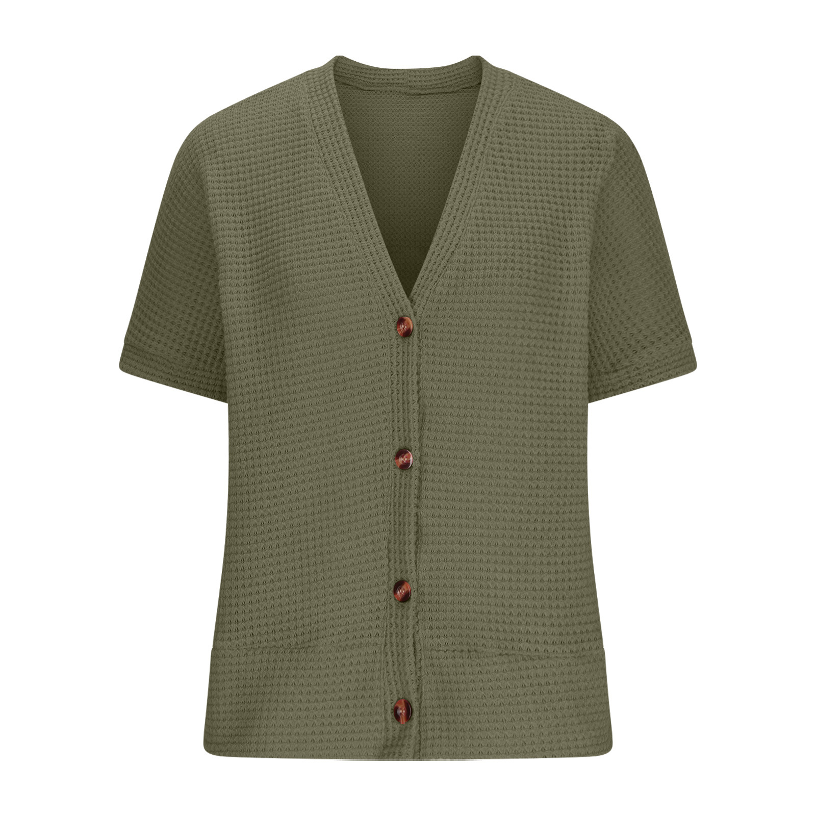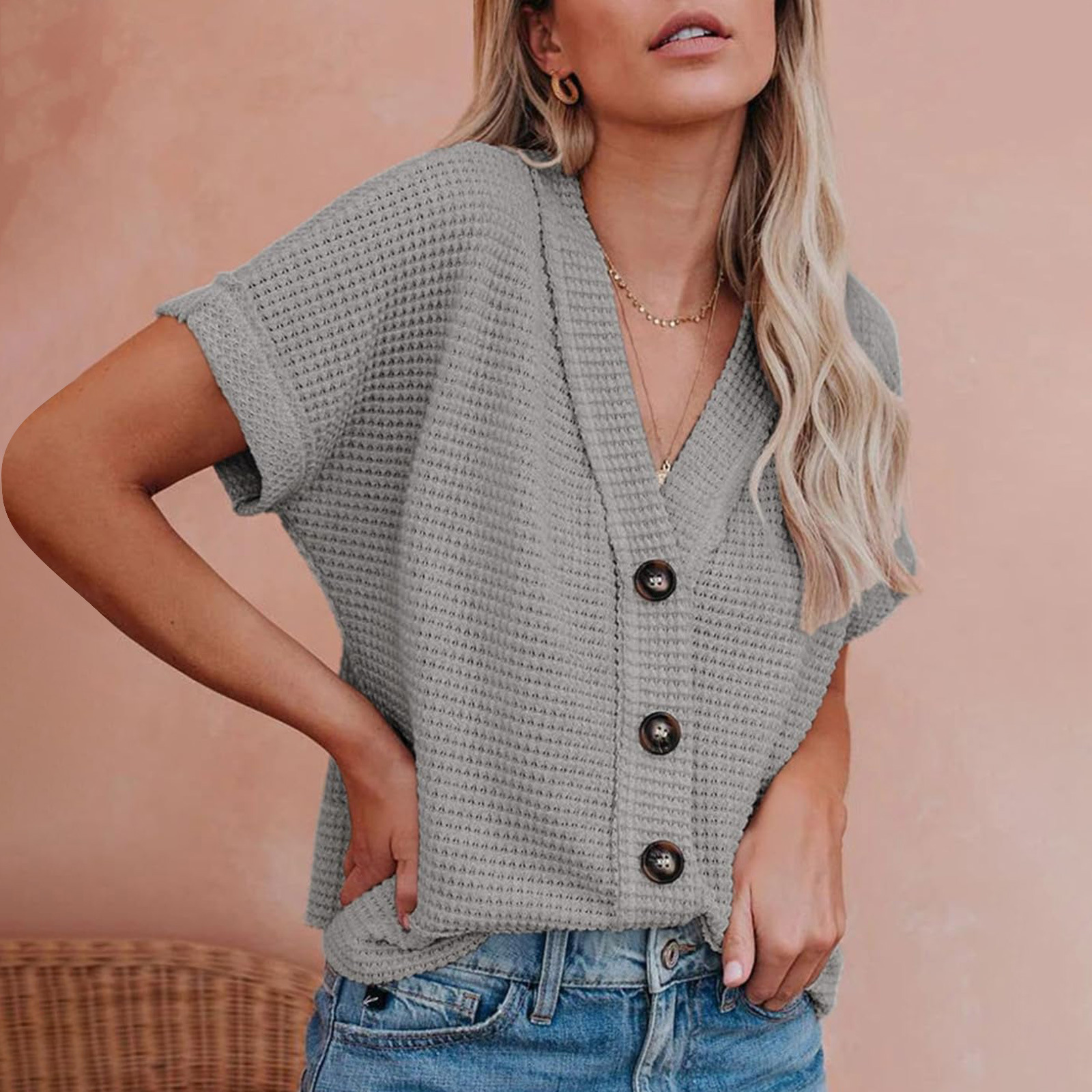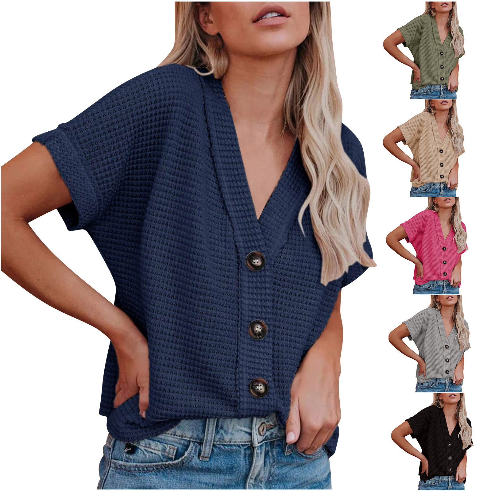 2024 아마존 유럽과 미국의 대외 무역 단색 V 넥 캐주얼 울 니트 반팔 버튼 셔츠 카디건 탑스토어 가기