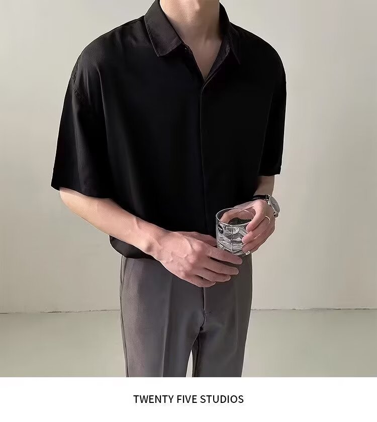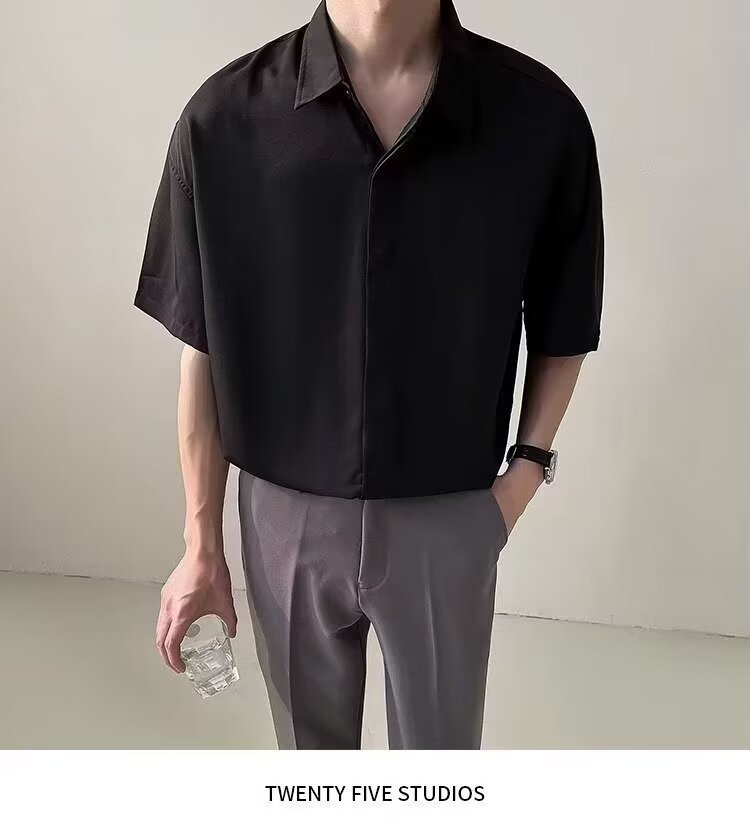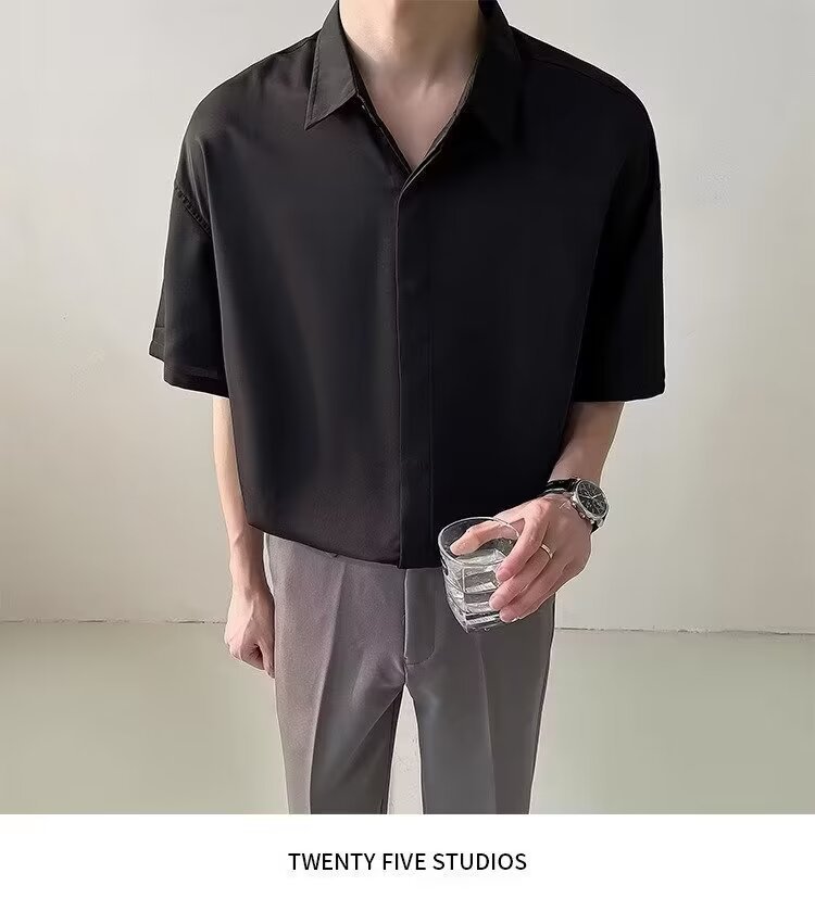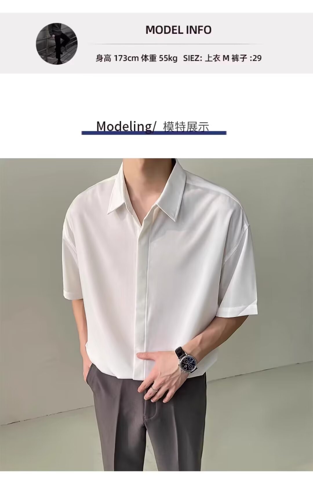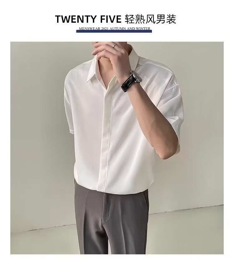 반팔 셔츠 남성용 여름 새로운 고급 드레이핑 비 다림질 라이트 성숙한 탑 단색 반소매 셔츠 남성용 아이스 실크스토어 가기