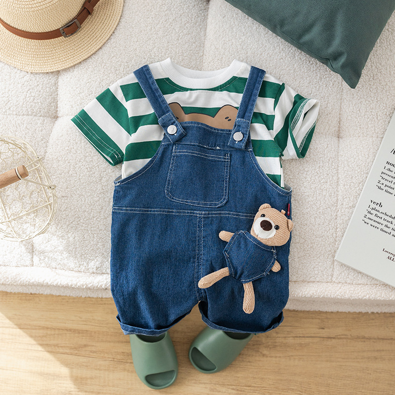 2024 봄 새 소년 소녀 캐주얼 데님 서스펜더 바지 투피스 세트 아기 와이드 스트라이프 짧은 소매 세트 세대 헤어