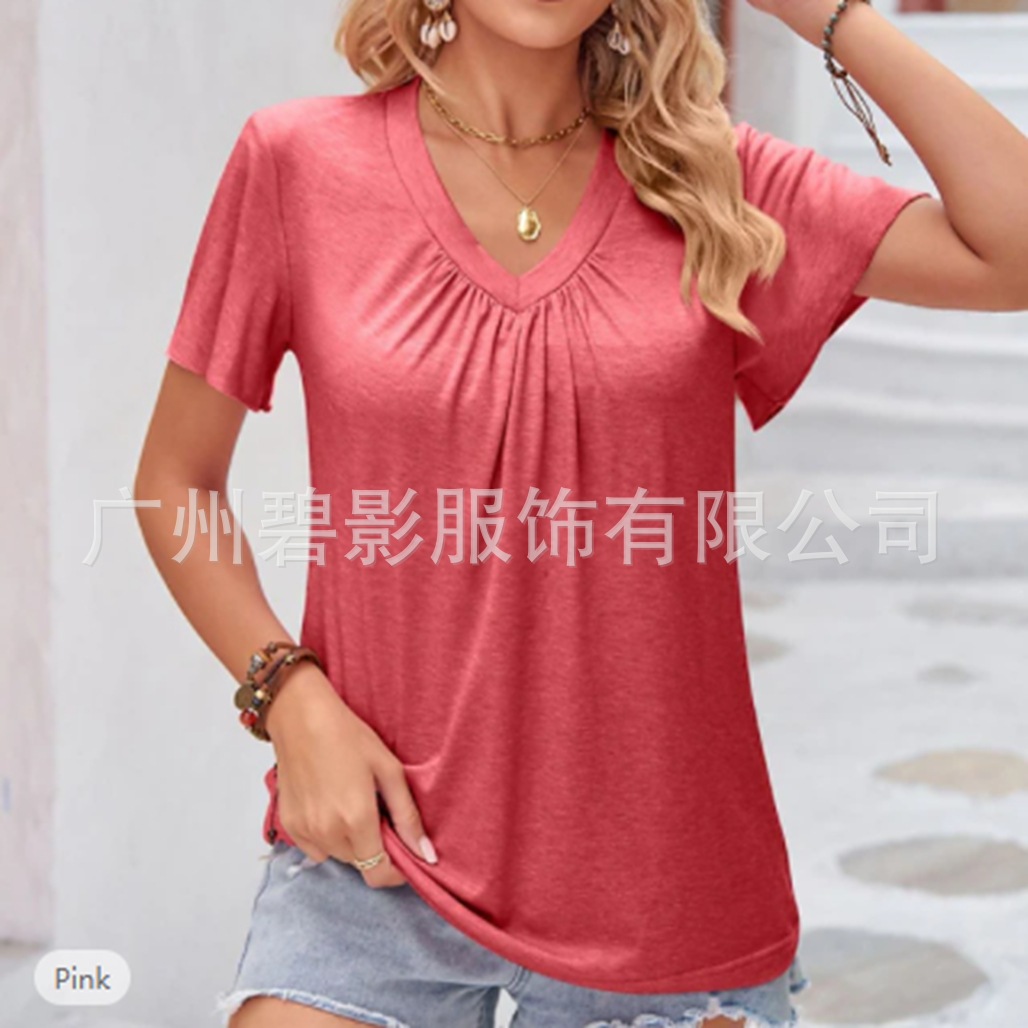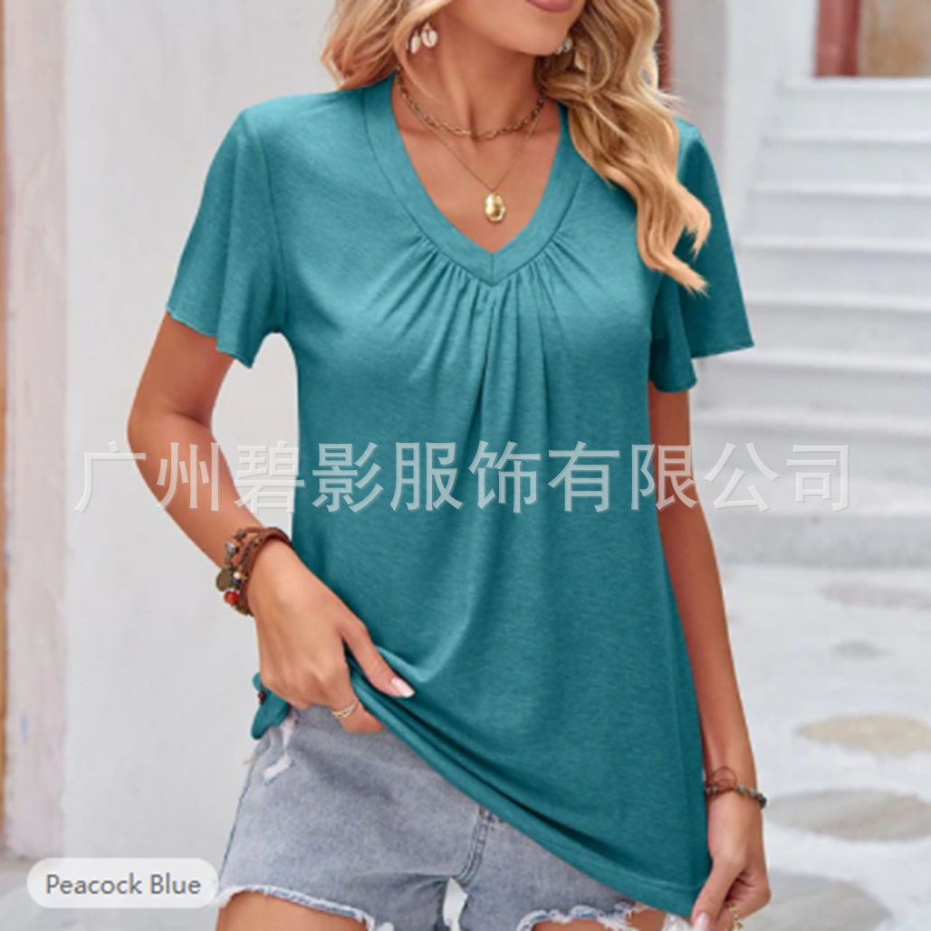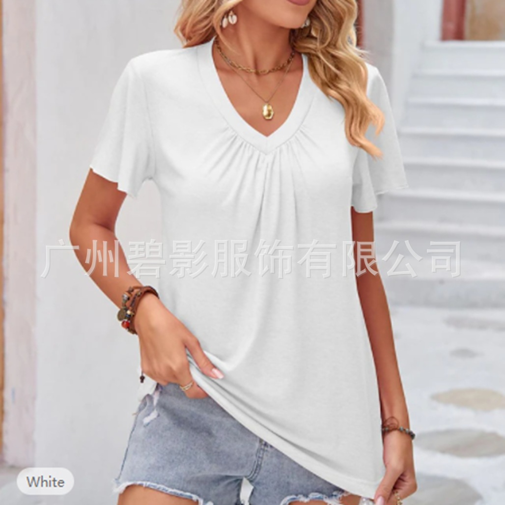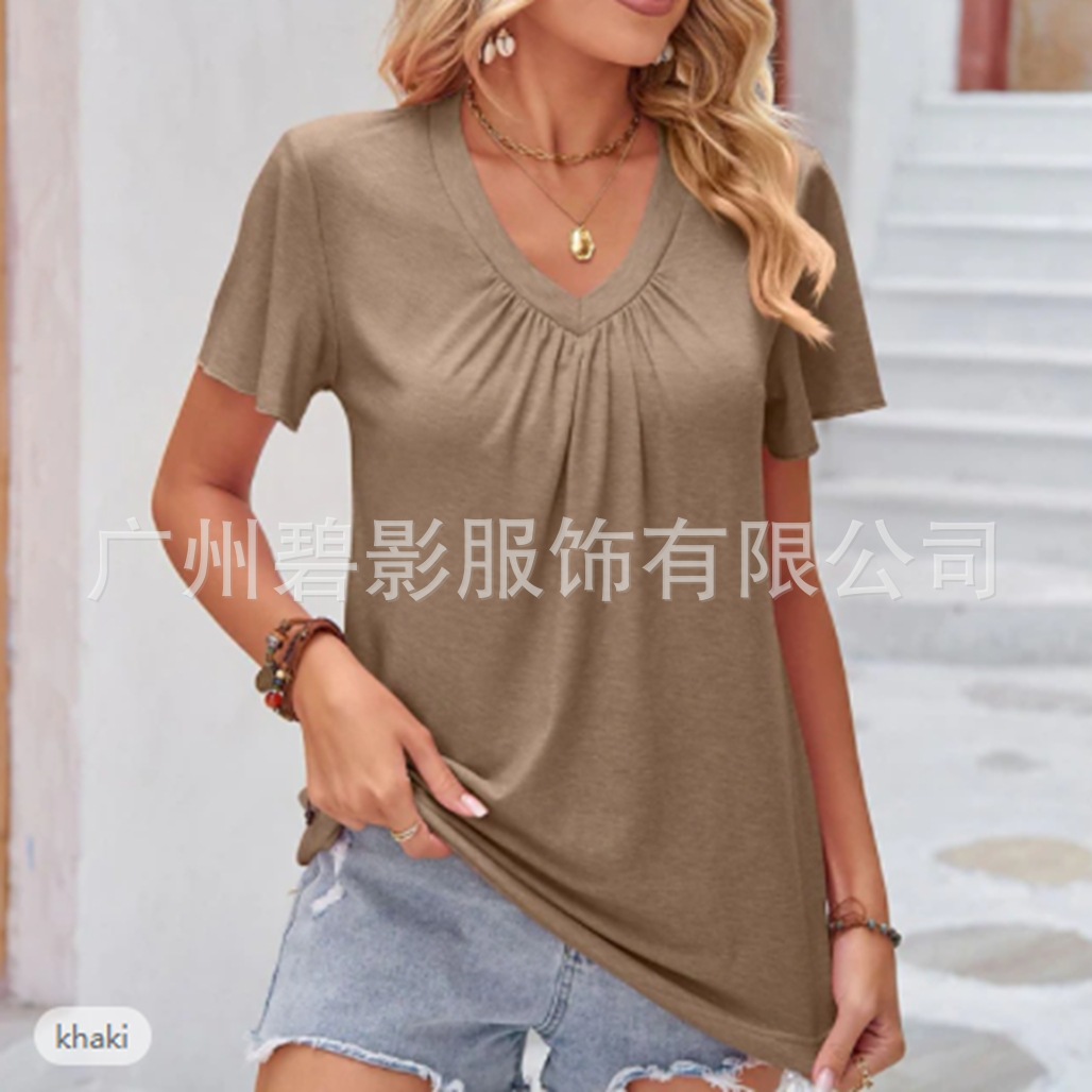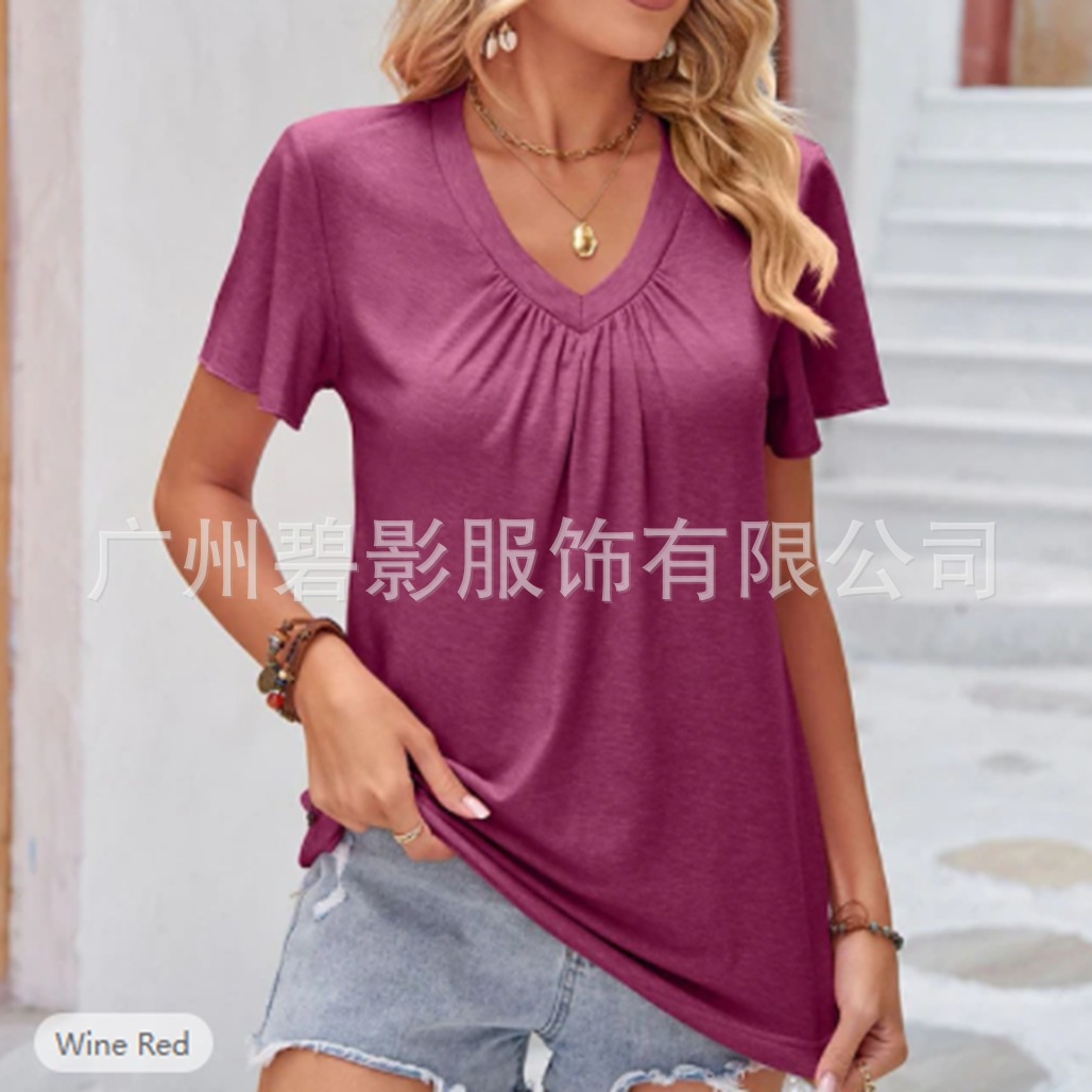유럽과 미국의 국경 간 여성 2024 아마존 여름 새로운 단색 Pleated V 넥 러플 슬리브 루즈 탑 티셔츠