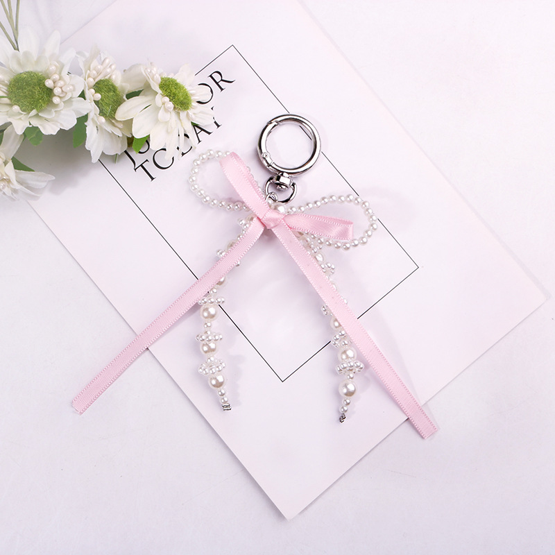 새로운 귀여운 달콤한 수제 흰색 진주 직물 활 키 체인 자동차 장식품 선물 창조적 인 보석
