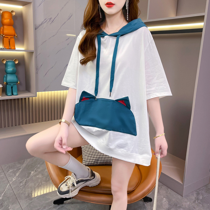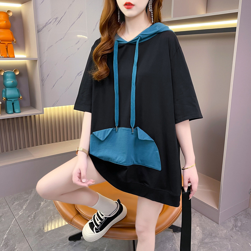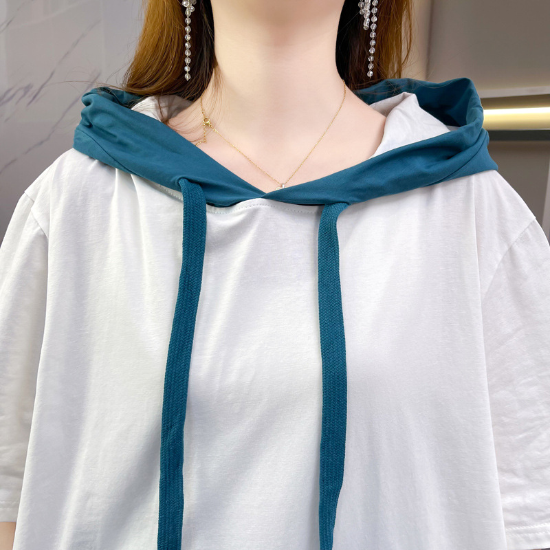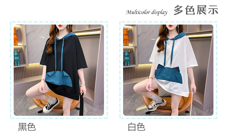 후드 탑 여성의 여름 얇은 태양 보호 틈새 디자인 대비 컬러 중간 길이의 유럽과 미국 만화 짧은 소매 티셔츠 여성