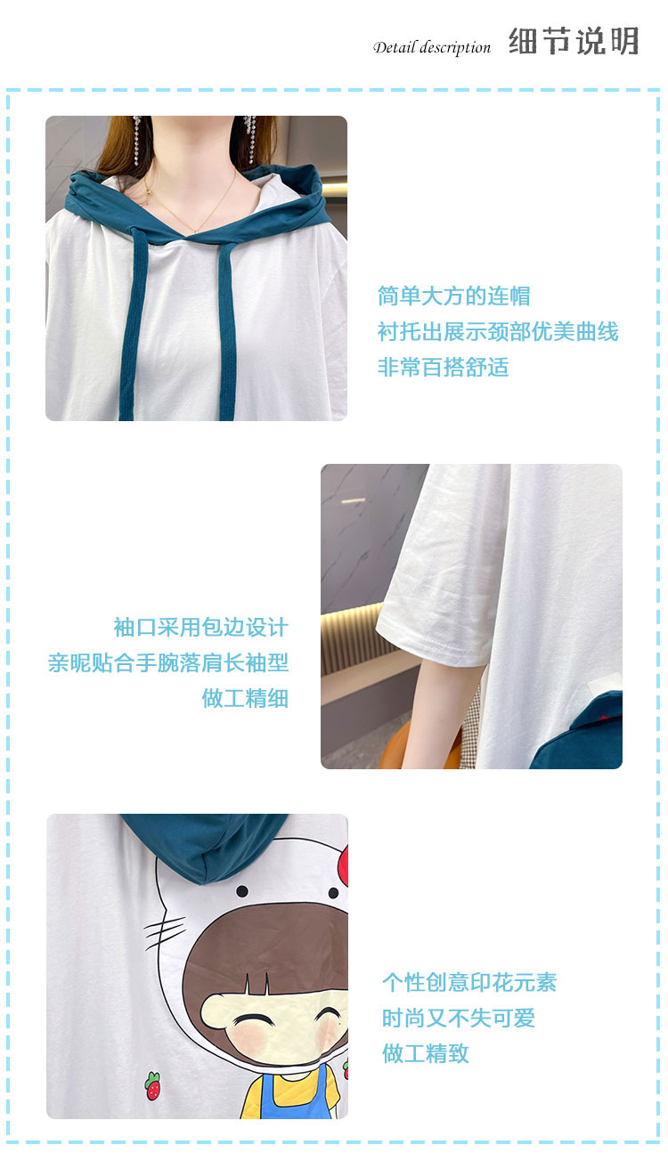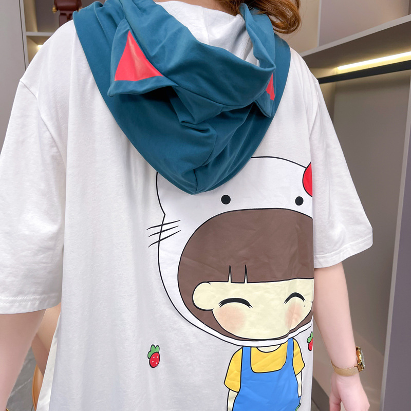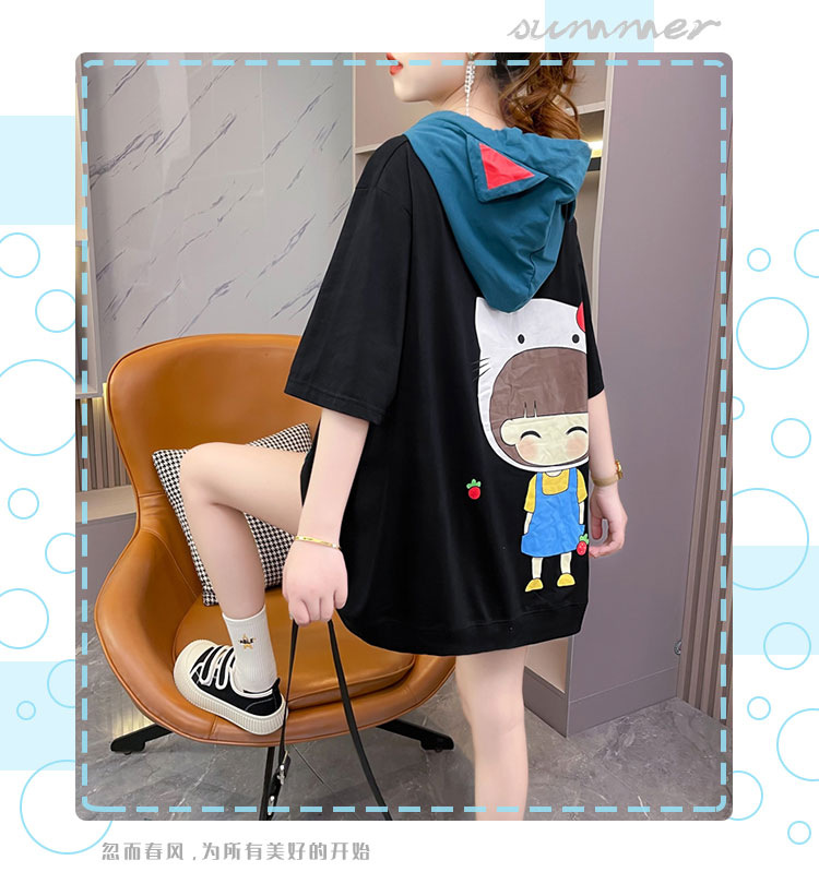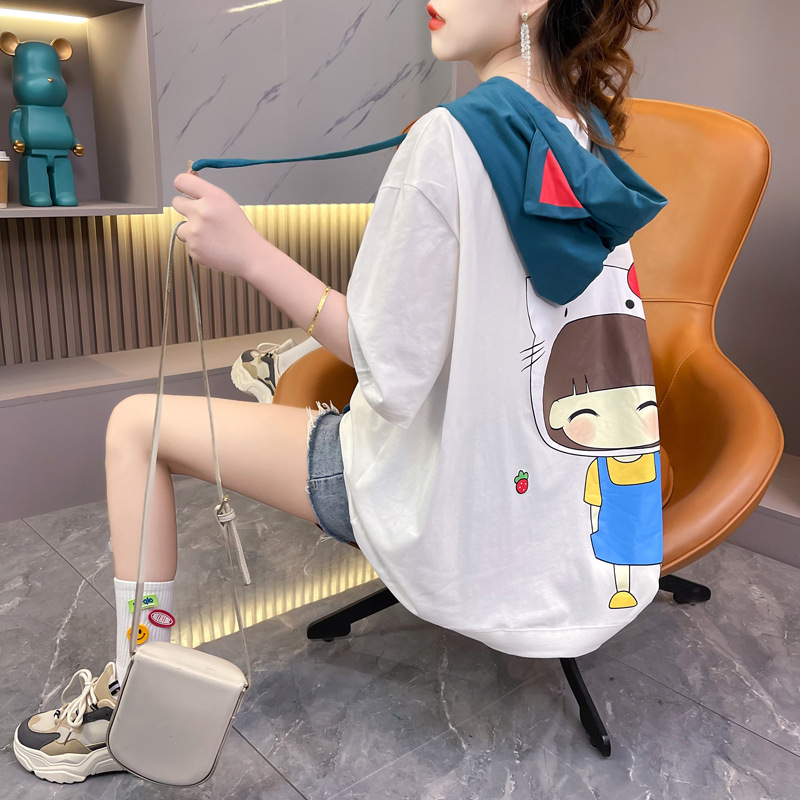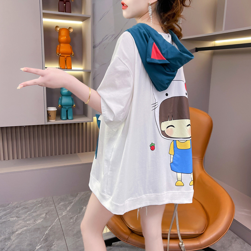 후드 탑 여성의 여름 얇은 태양 보호 틈새 디자인 대비 컬러 중간 길이의 유럽과 미국 만화 짧은 소매 티셔츠 여성스토어 가기