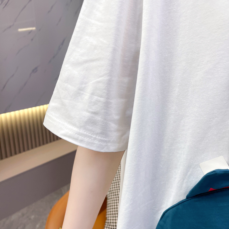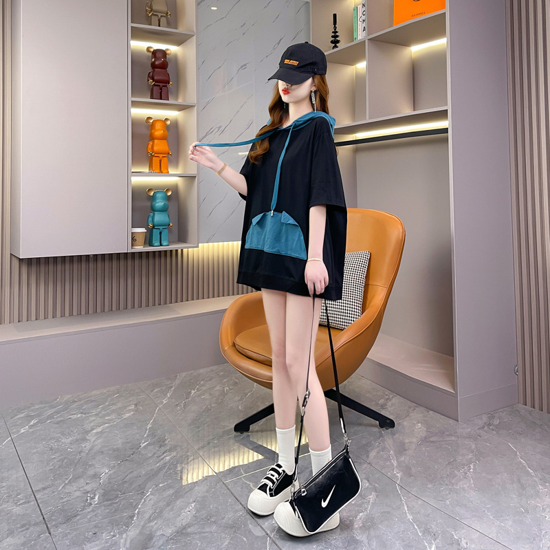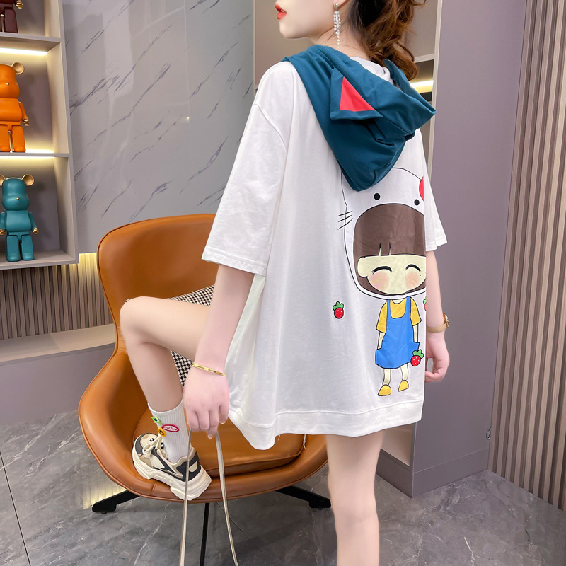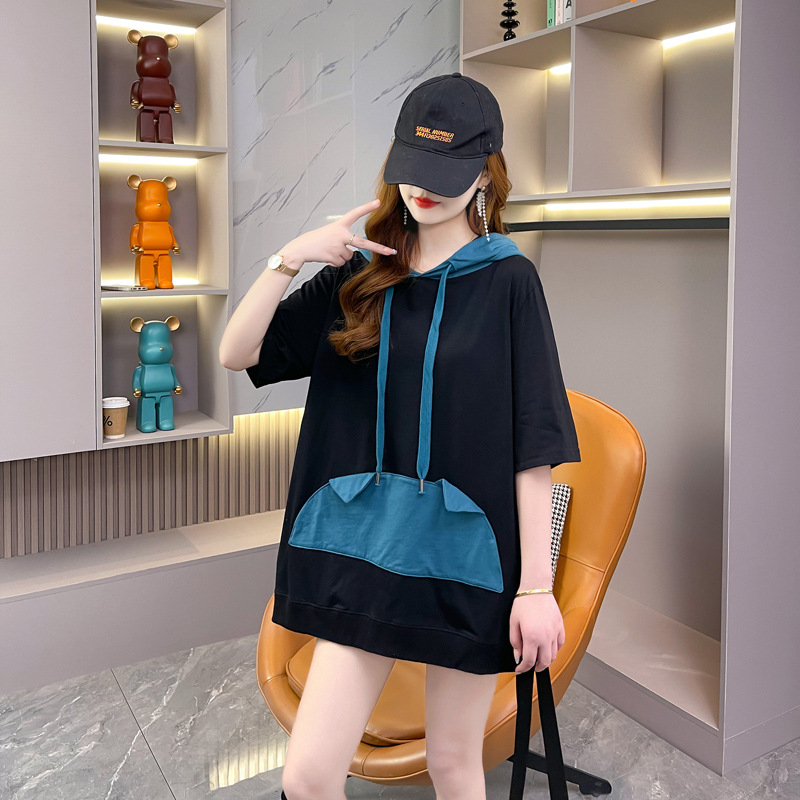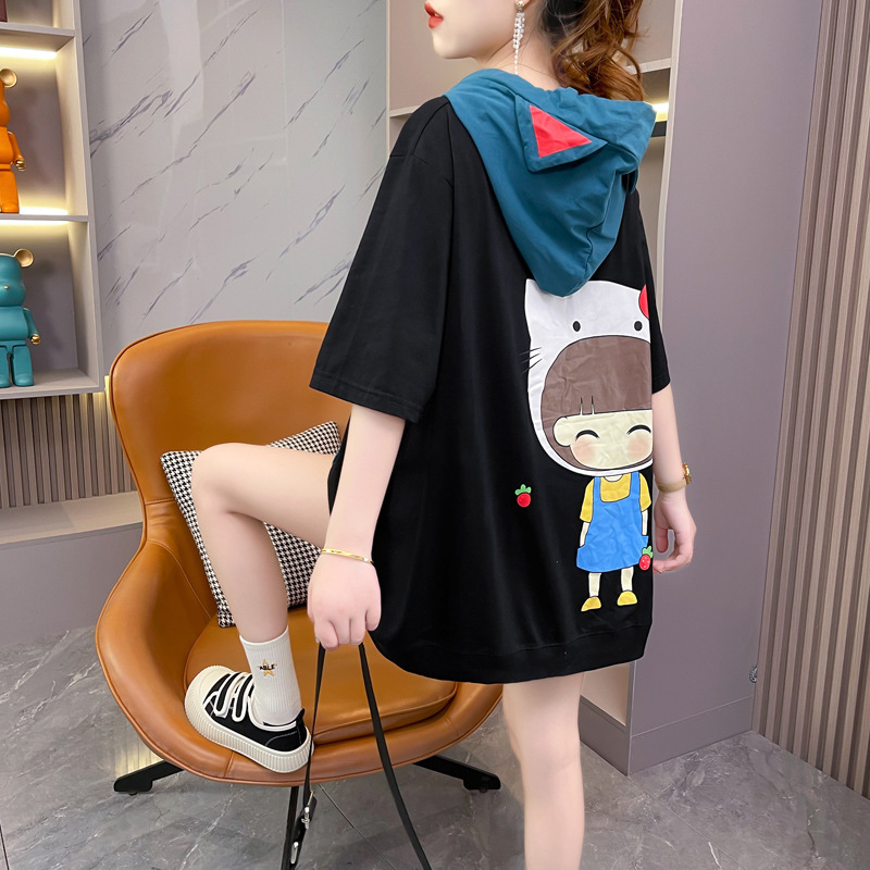 후드 탑 여성의 여름 얇은 태양 보호 틈새 디자인 대비 컬러 중간 길이의 유럽과 미국 만화 짧은 소매 티셔츠 여성스토어 가기