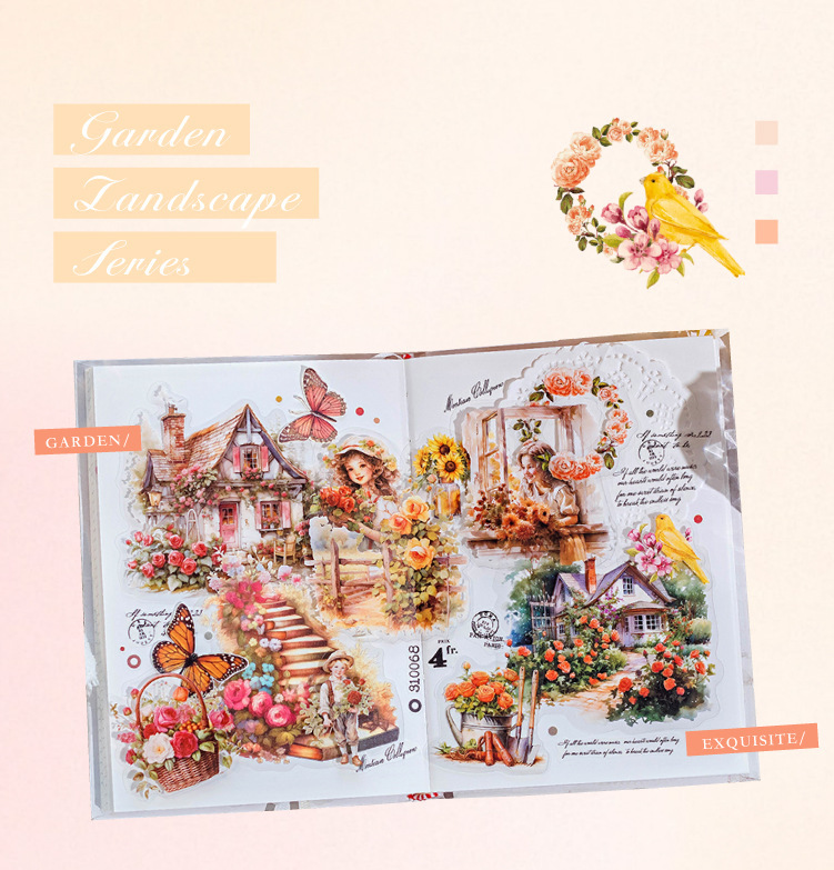 Tangshi PET 스티커 가방 정원 풍경 시리즈 빈티지 꽃 소녀 저널 풍경 장식 콜라주스토어 가기
