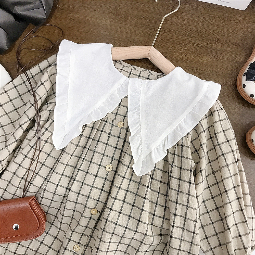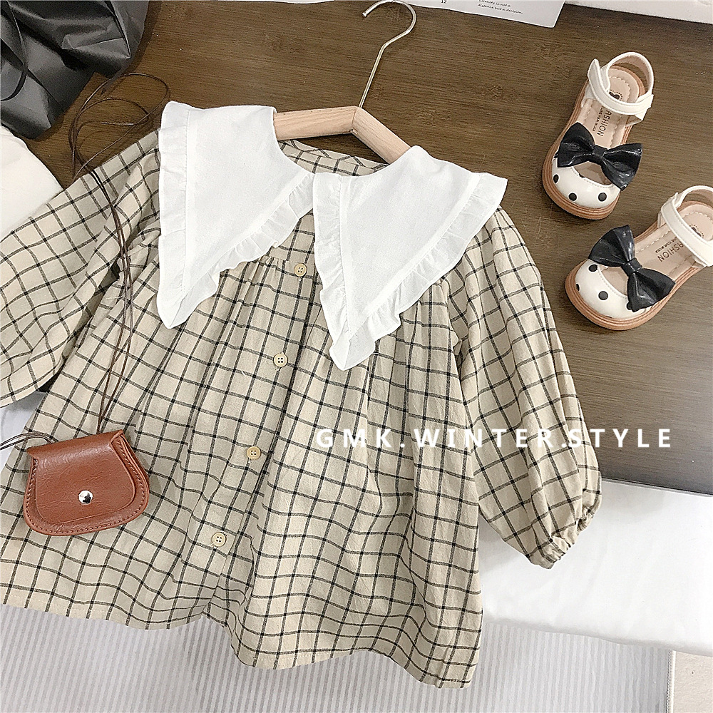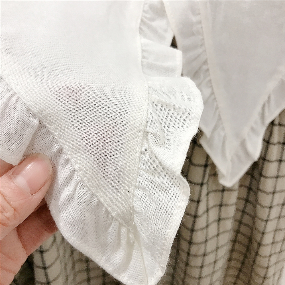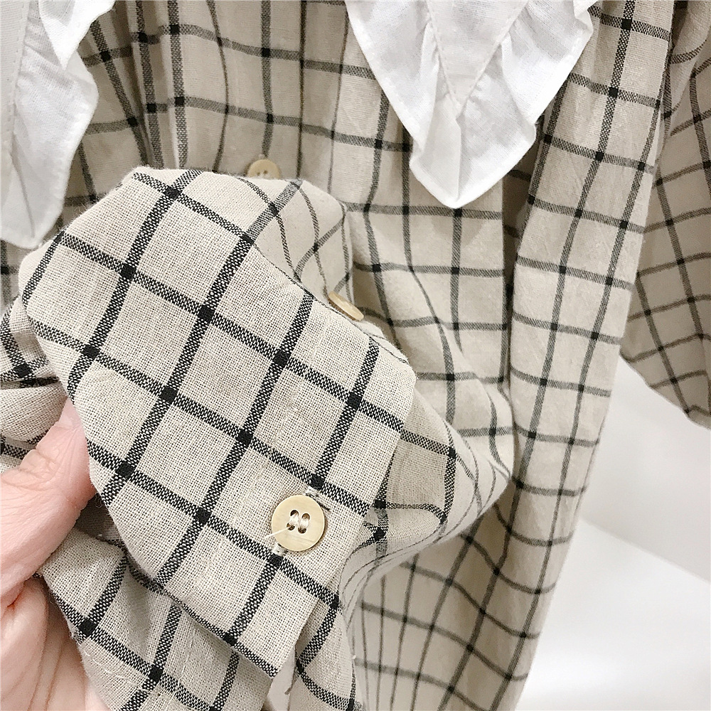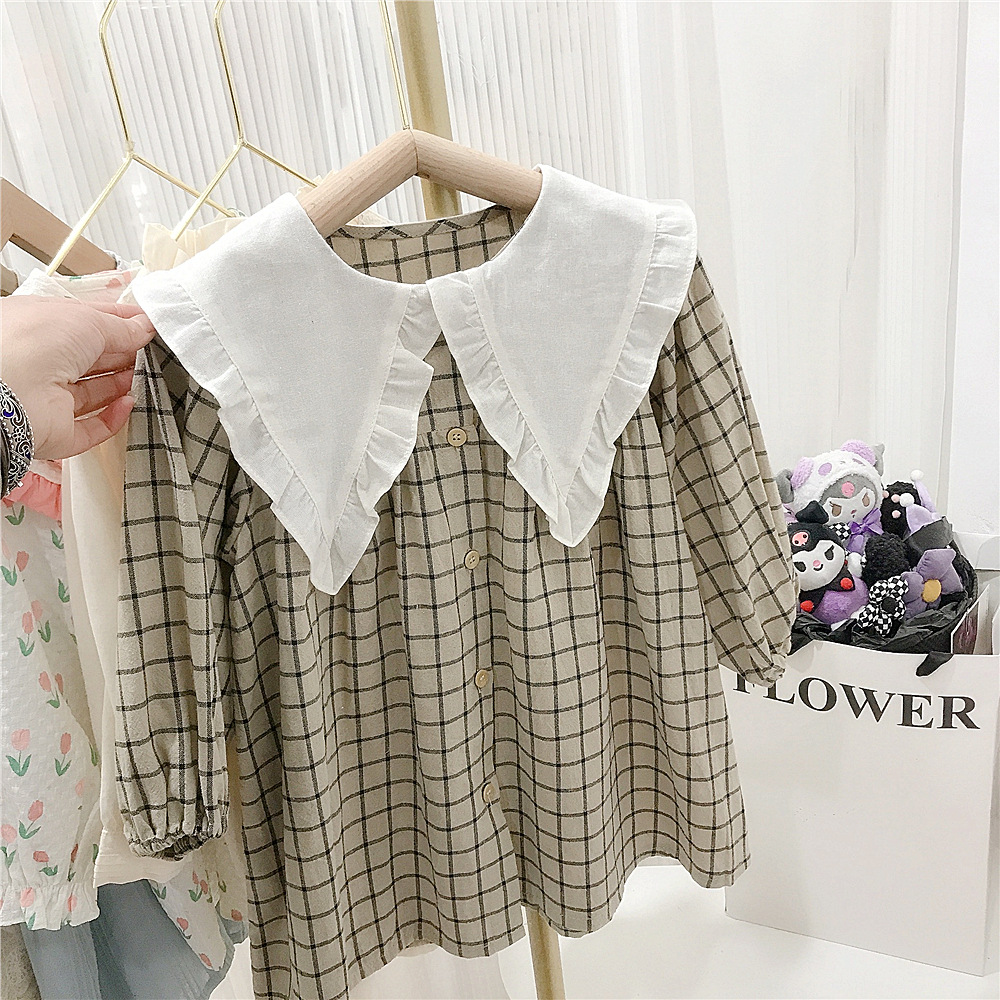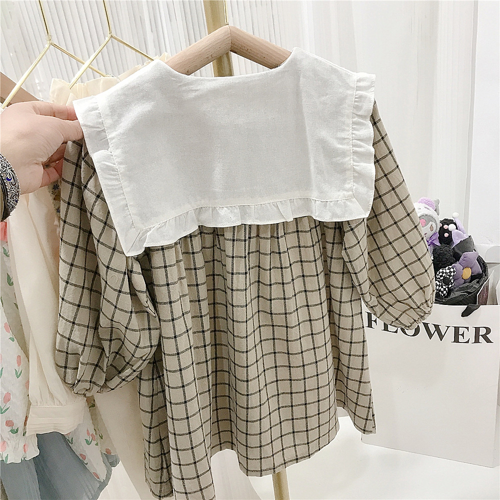 봄과 가을 한국 스타일의 새로운 어린이 원피스 면화 및 린넨 레이스 옷깃 체크 무늬 스커트 얇은 소녀 원피스 모리 대외 무역스토어 가기