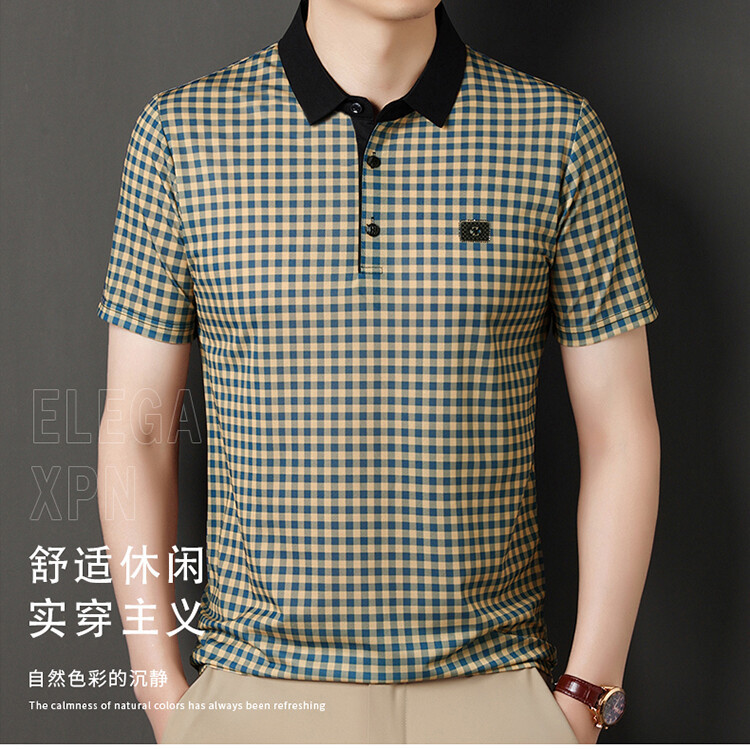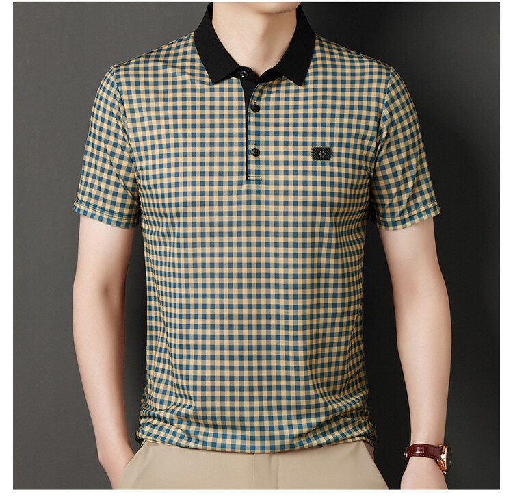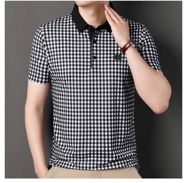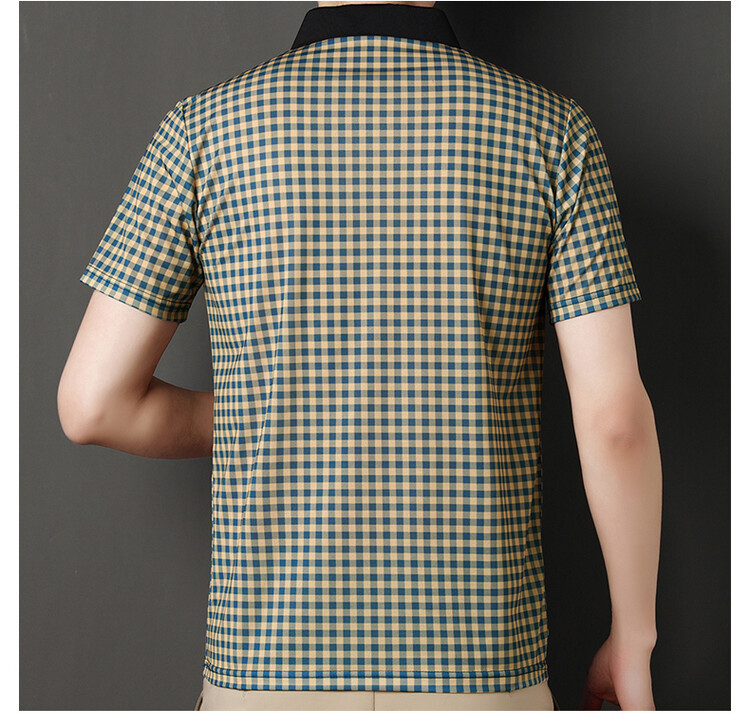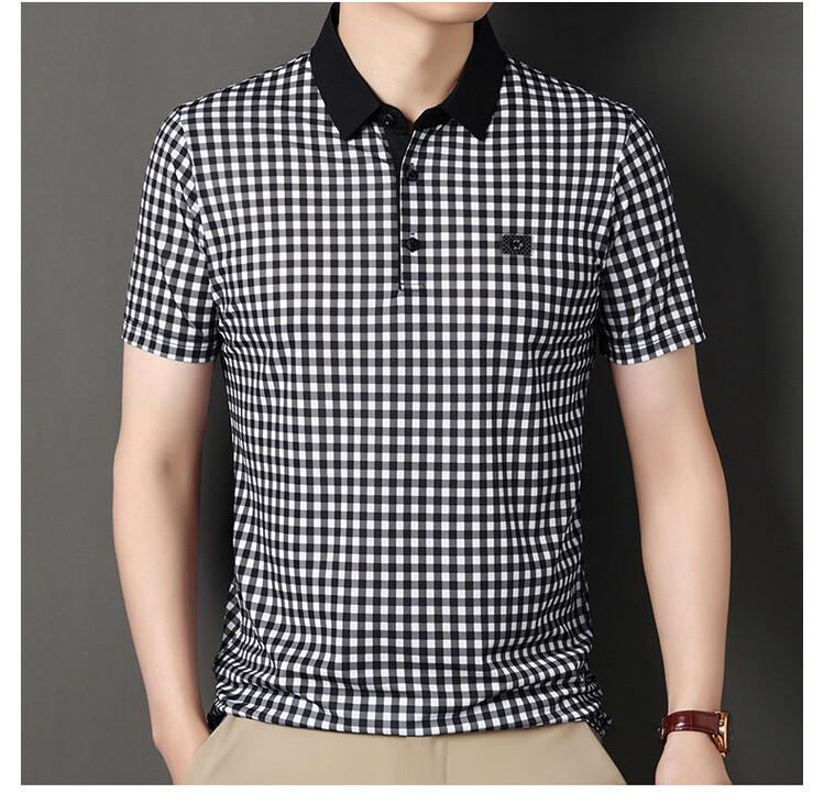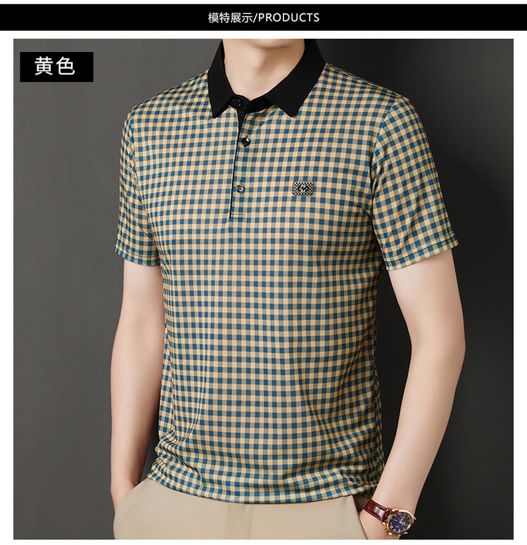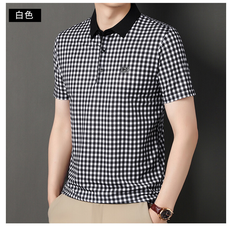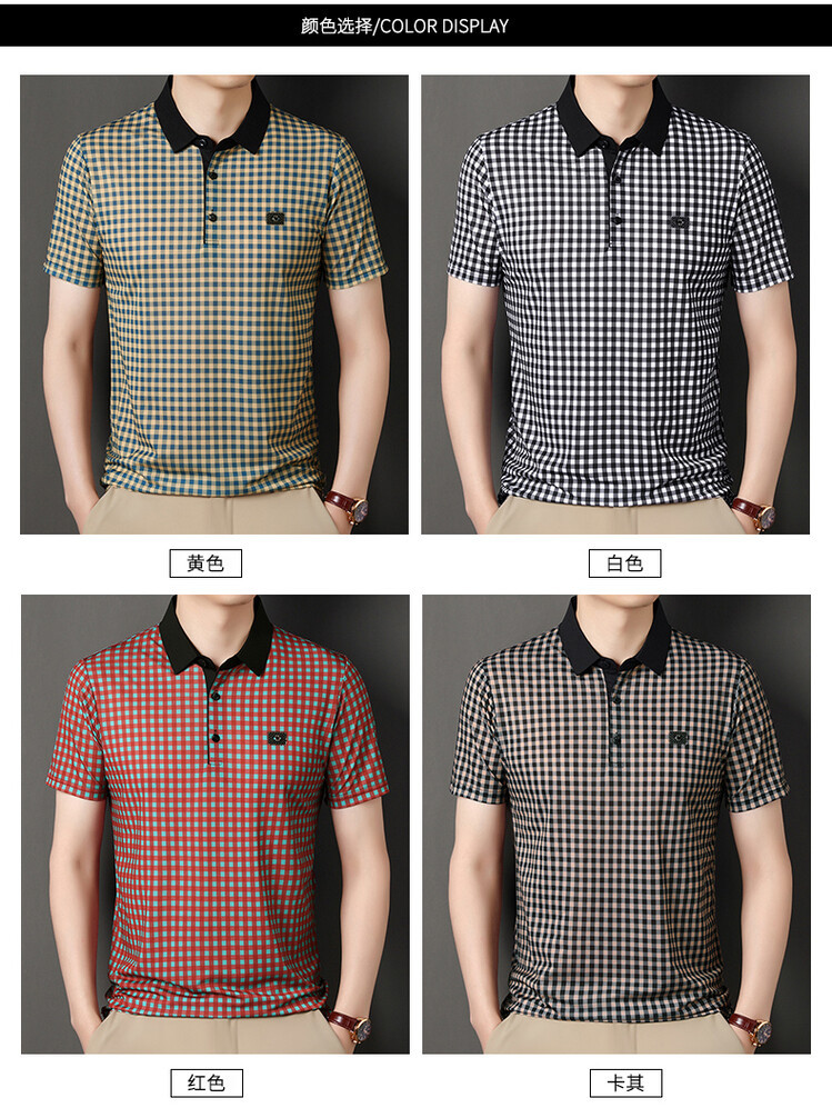 아이스 실크 반팔 티셔츠 남성용 여름 느슨한 반소매 언더 셔츠 티셔츠 중년 아빠용 격자 무늬 옷깃 남성용 탑 T