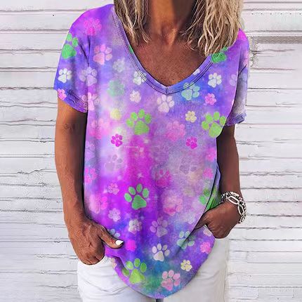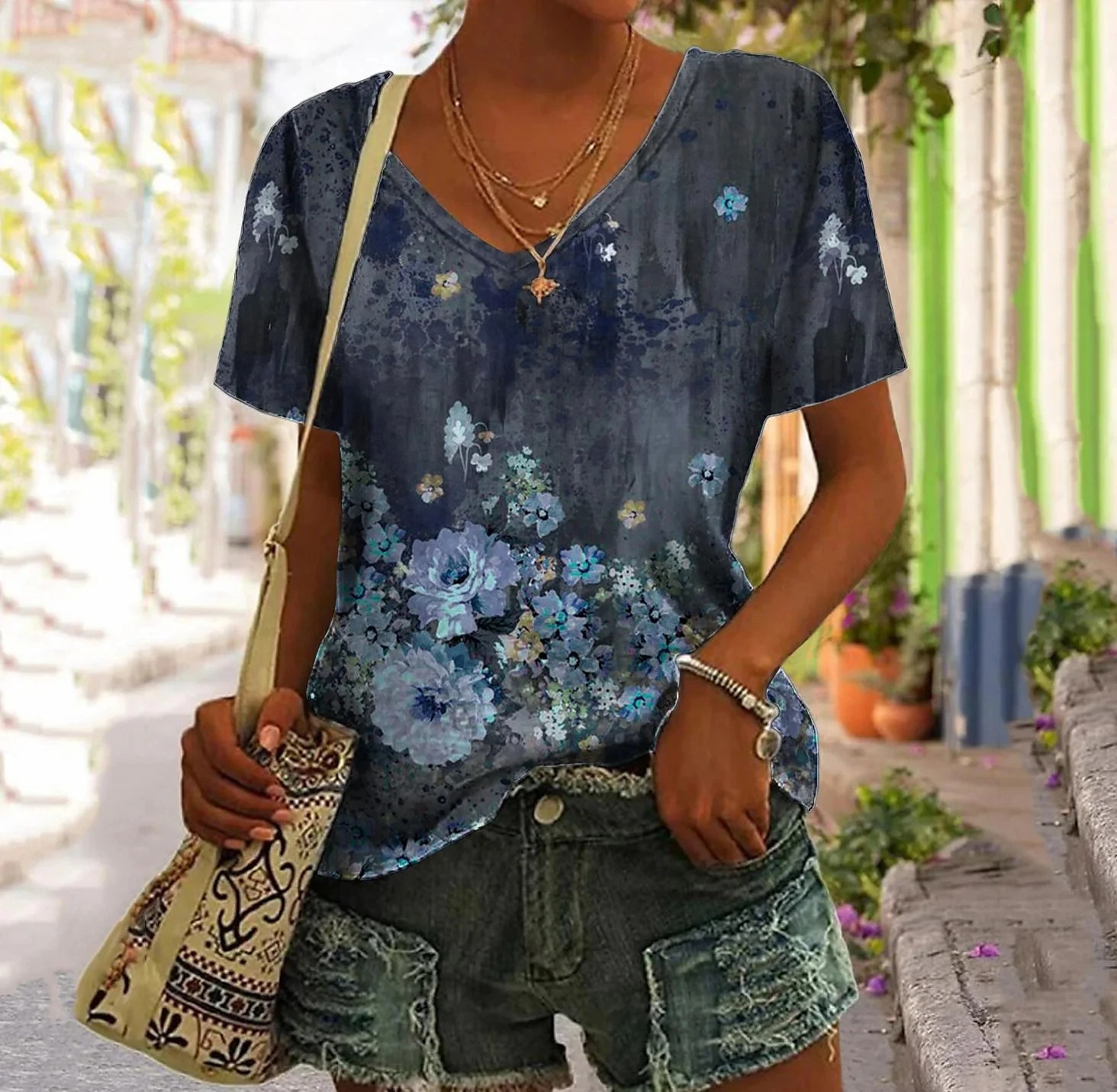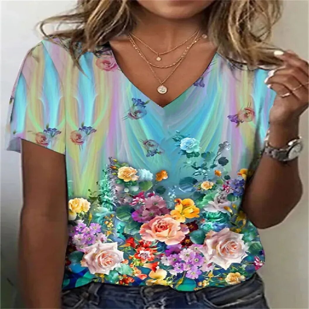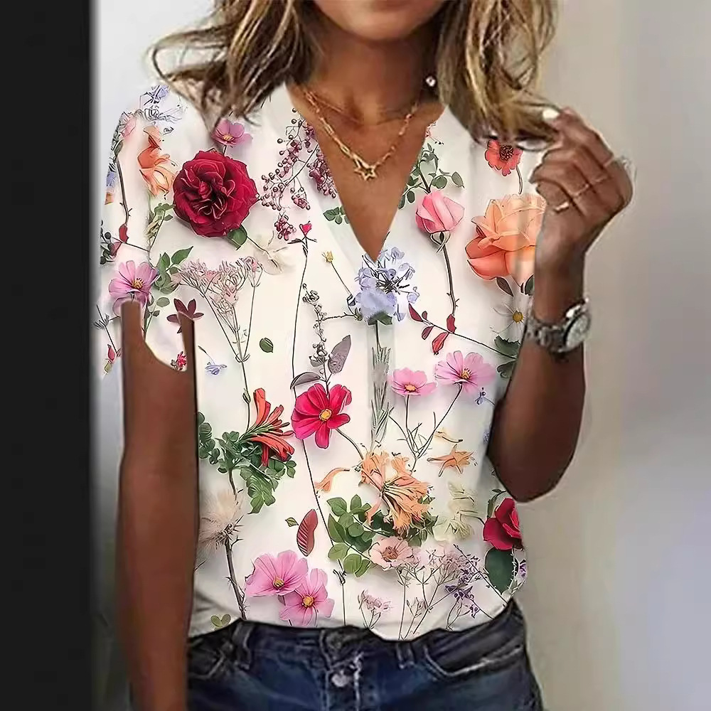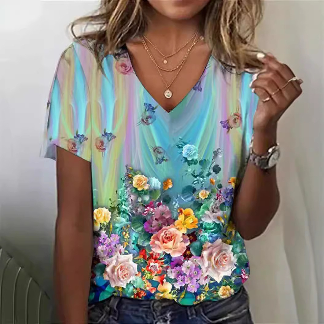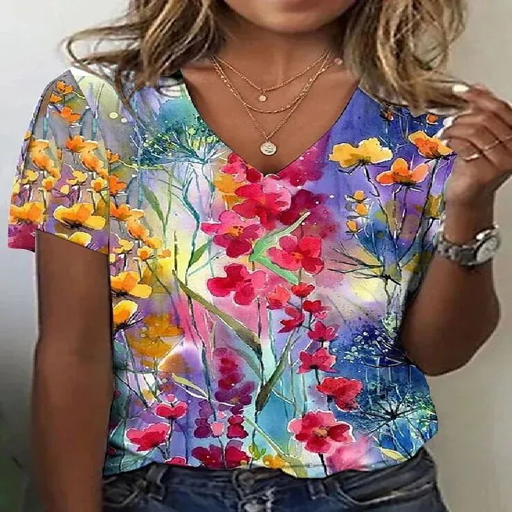 2024 대외 무역 모조 면 반팔 여성 티셔츠 V-목 꽃 인쇄 유럽과 미국의 대외 무역 여성 원피스 원피스 스트레이트 헤어스토어 가기