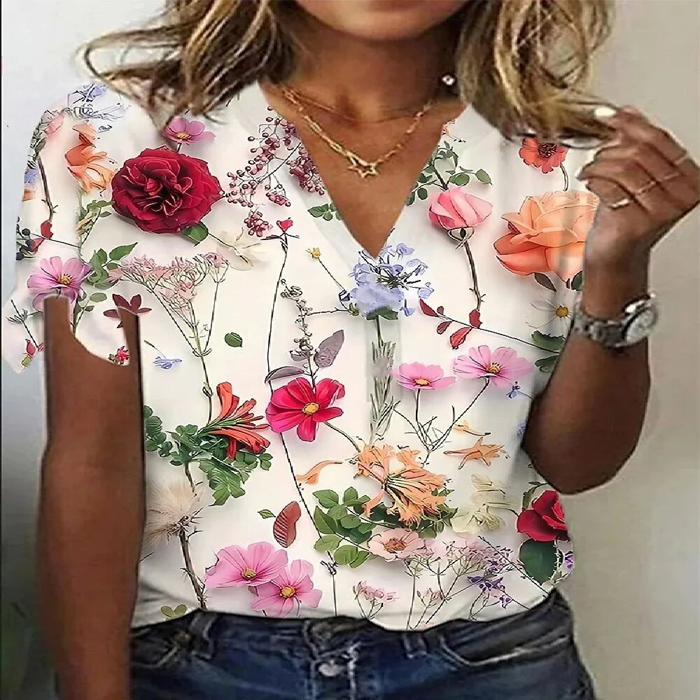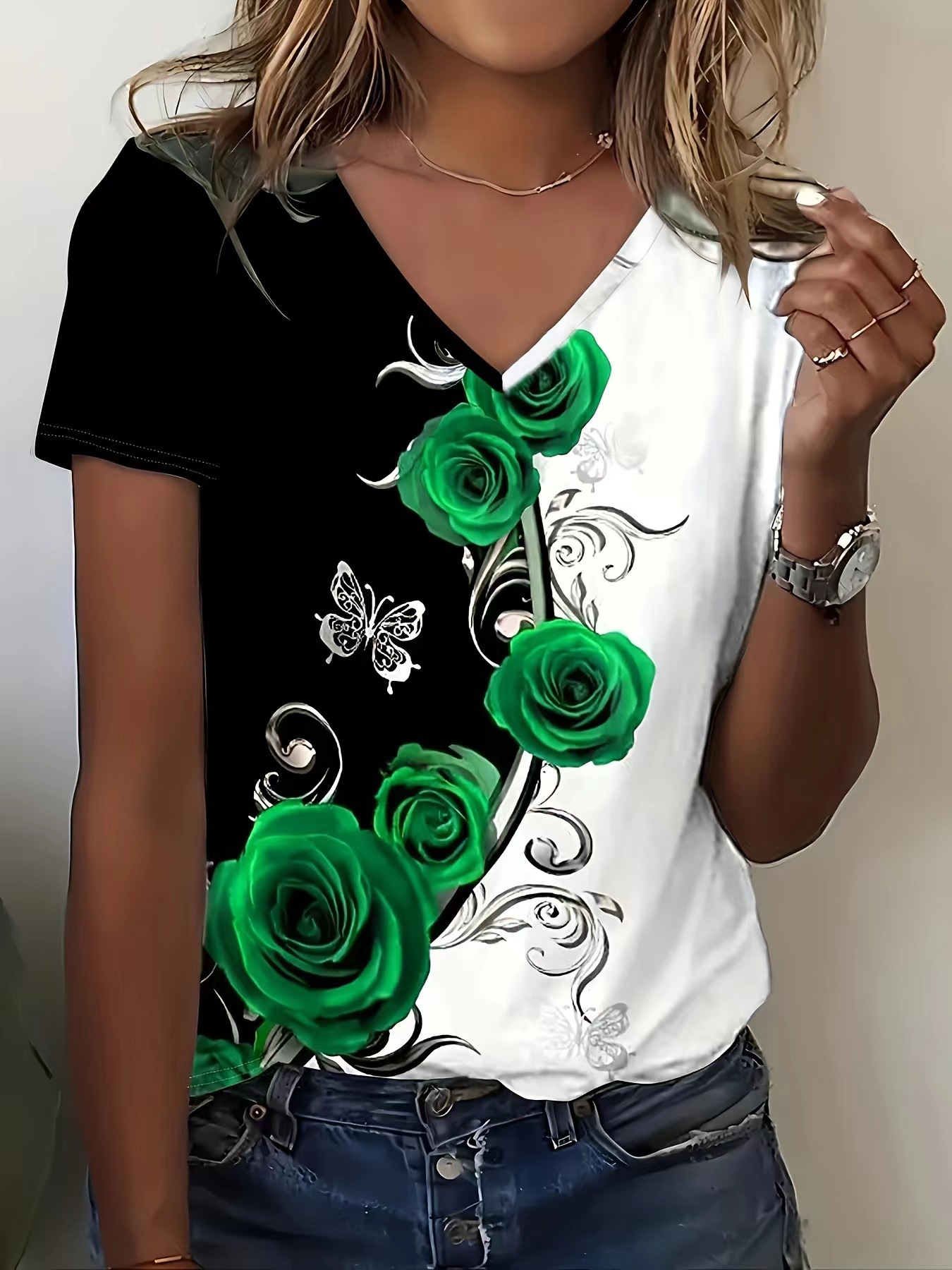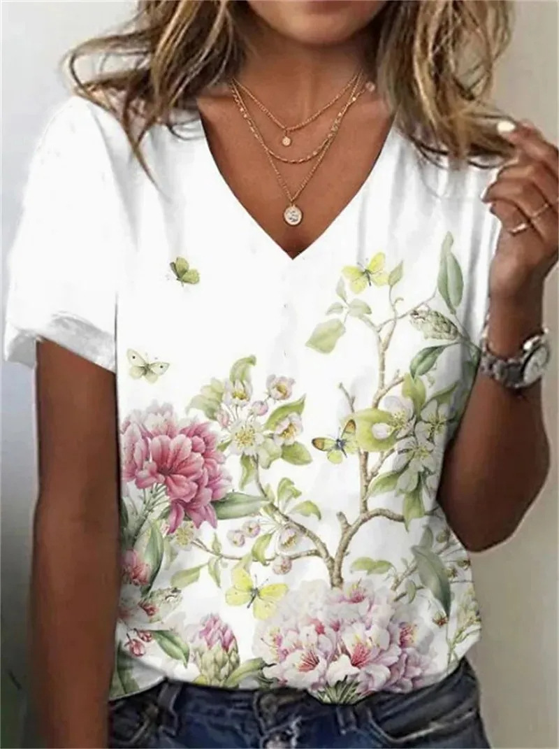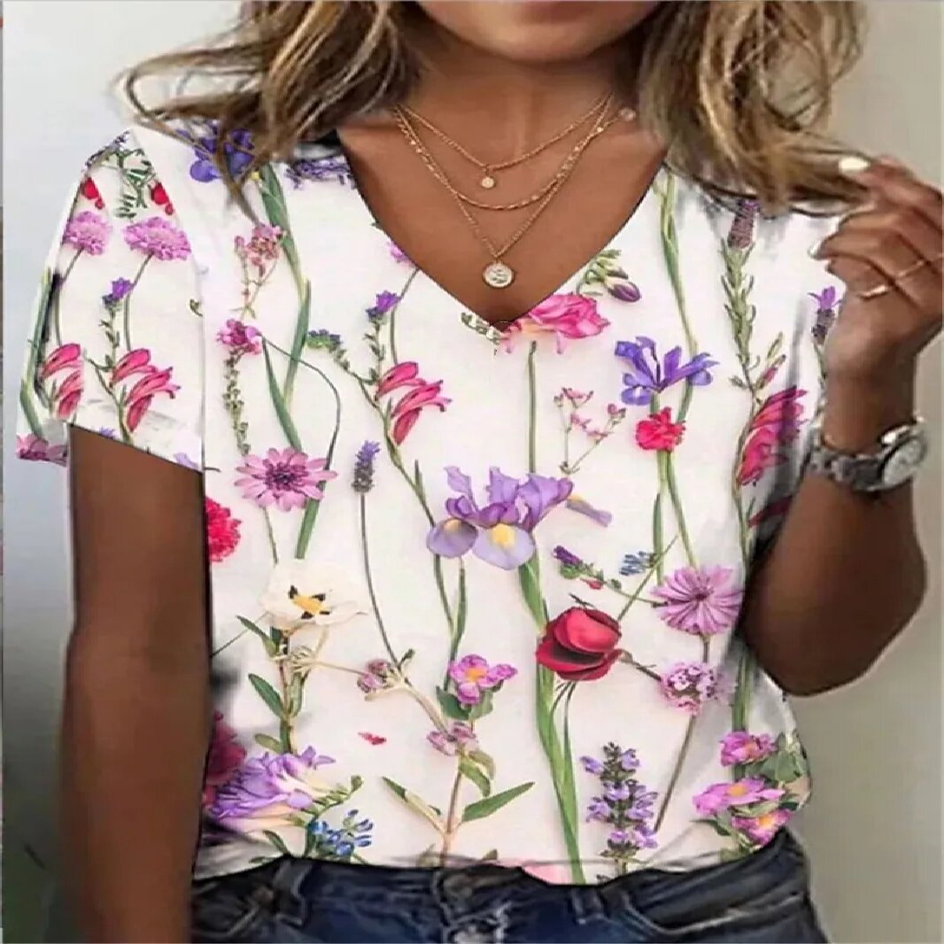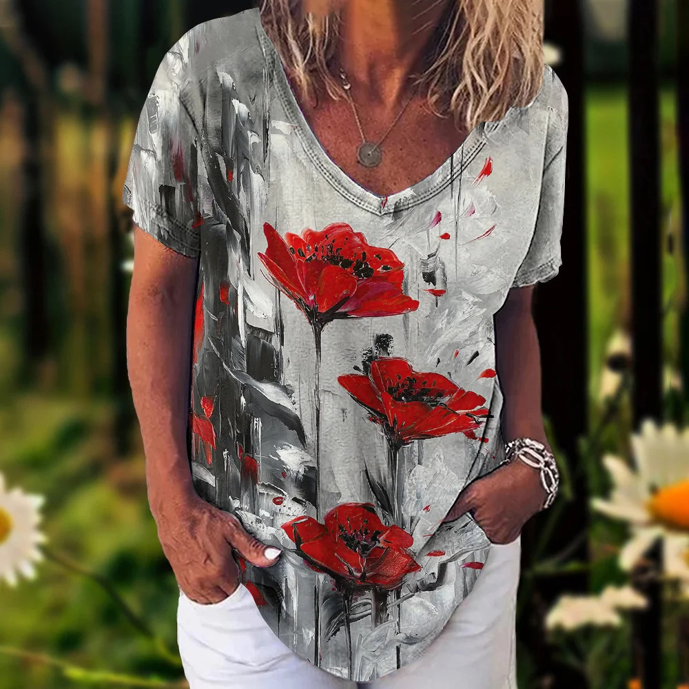 2024 대외 무역 모조 면 반팔 여성 티셔츠 V-목 꽃 인쇄 유럽과 미국의 대외 무역 여성 원피스 원피스 스트레이트 헤어스토어 가기