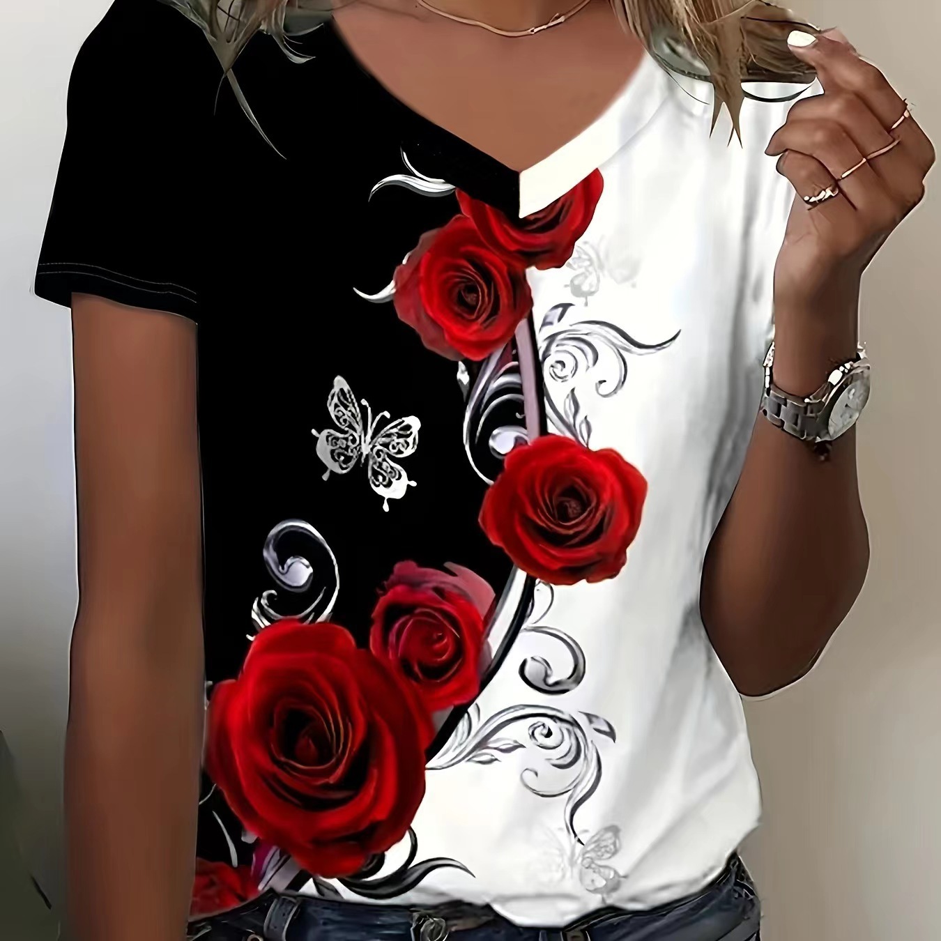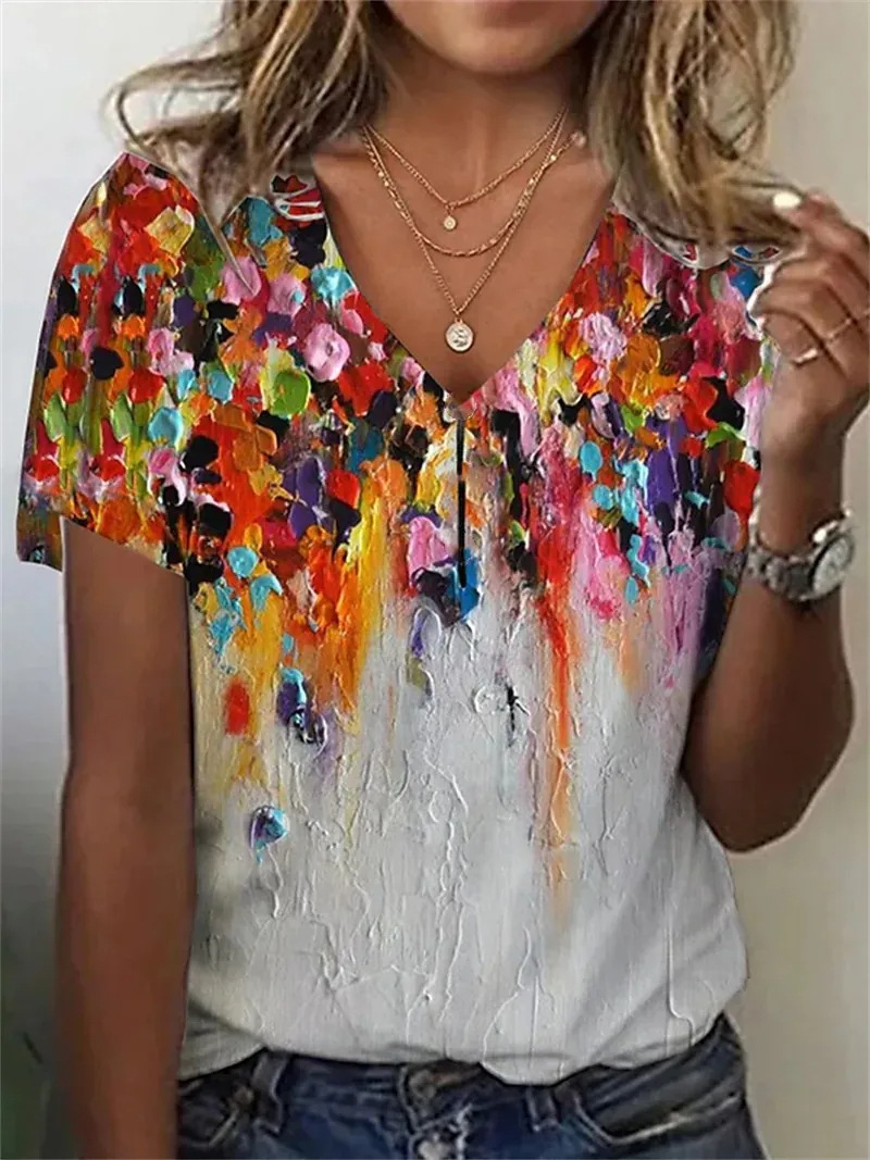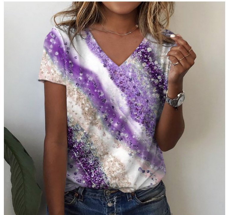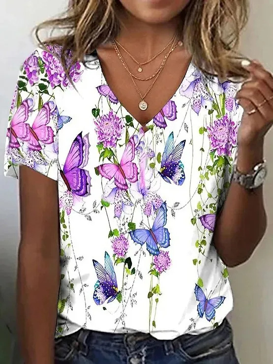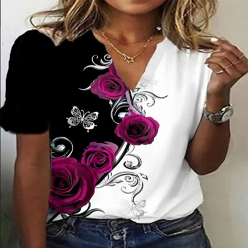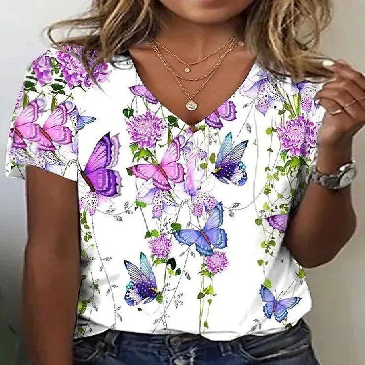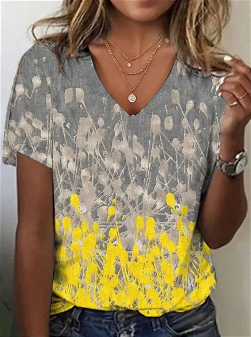 2024 대외 무역 모조 면 반팔 여성 티셔츠 V-목 꽃 인쇄 유럽과 미국의 대외 무역 여성 원피스 원피스 스트레이트 헤어스토어 가기