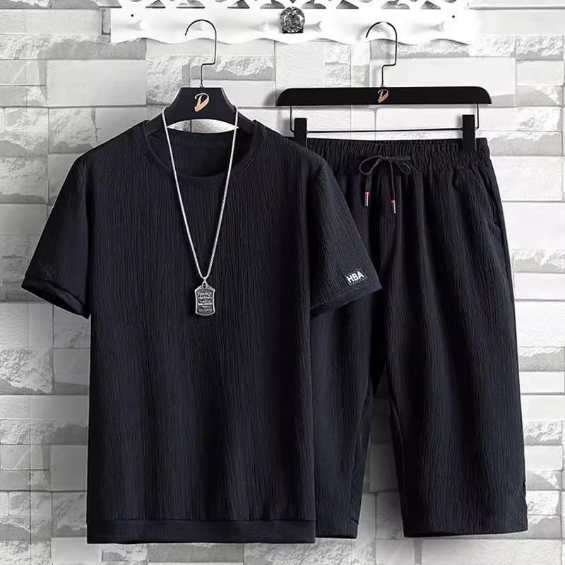 여름 캐주얼 스포츠 세트 남성 아이스 실크 반팔 티셔츠 반바지 패션 투피스 세트 어울리는 소년 세트