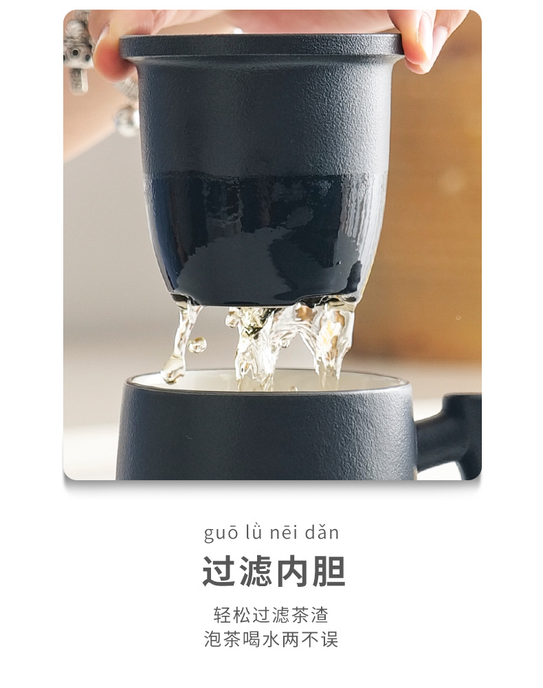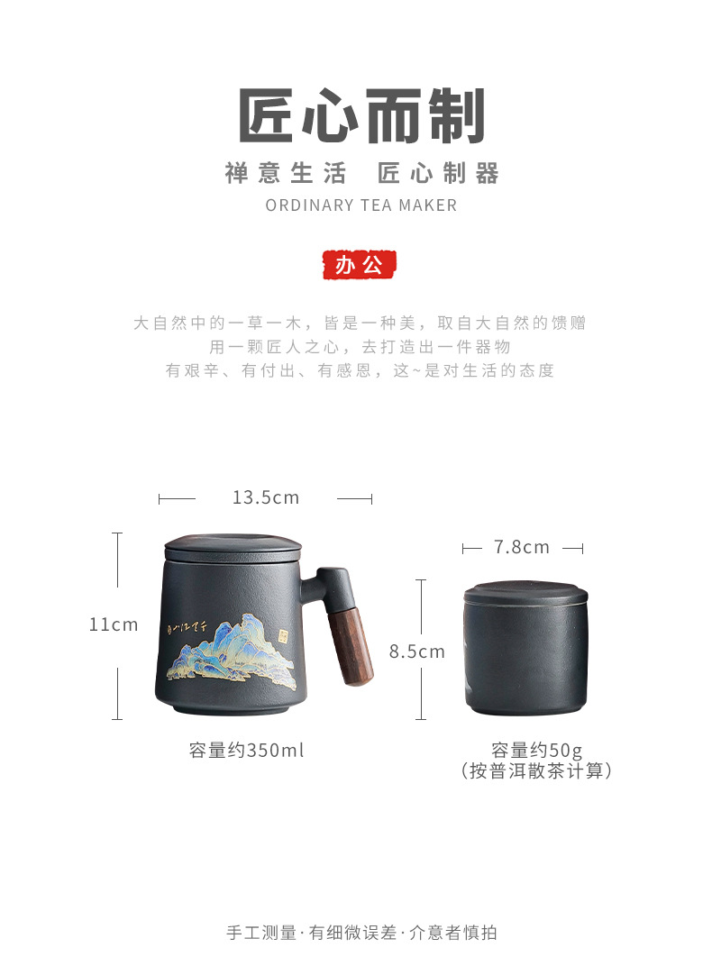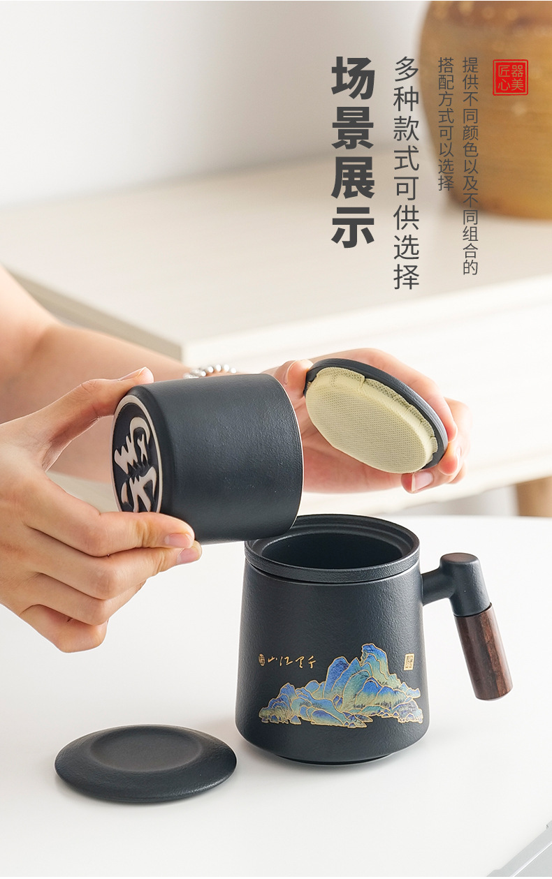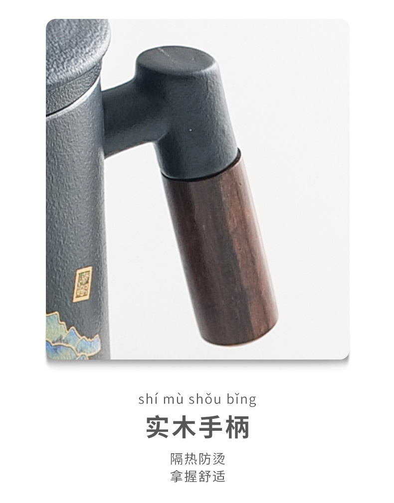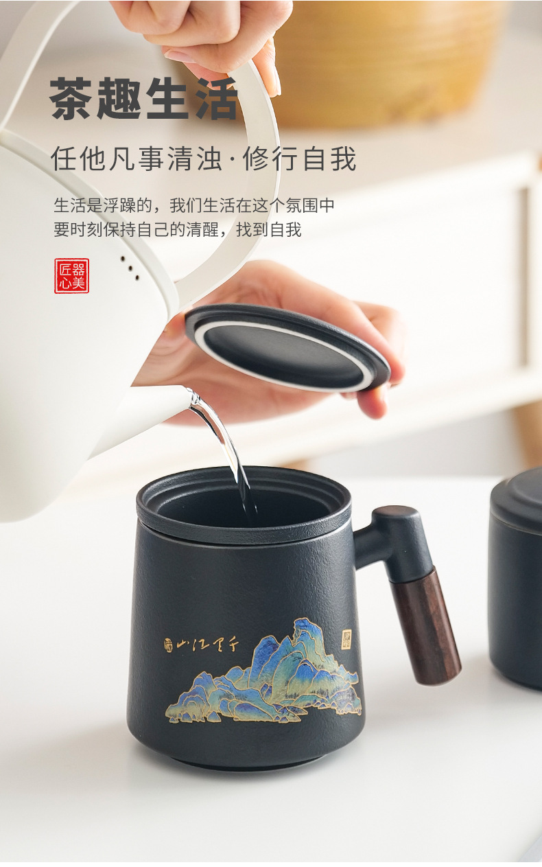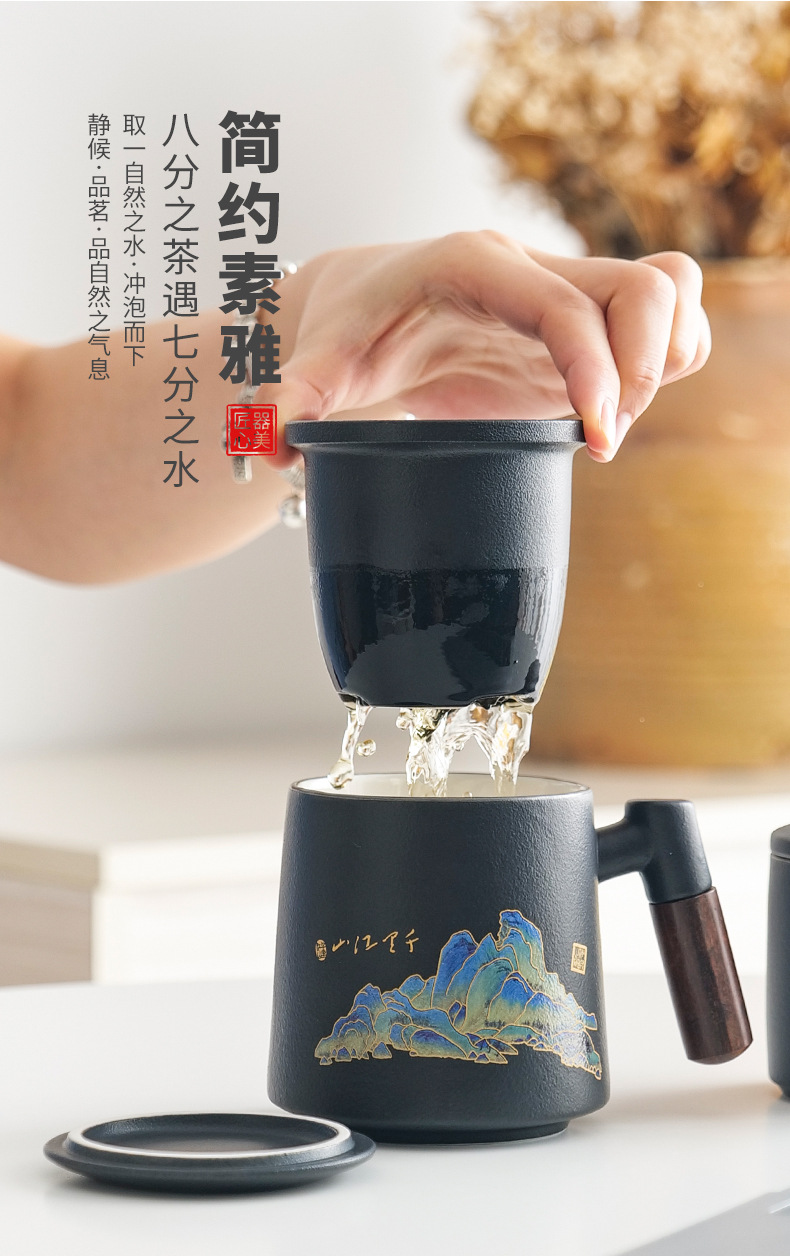 Qianli Jiangshan 나무 손잡이 세라믹 찻잔 차 분리 사무실 차 컵 필터 물 컵 인쇄 가능한 로고