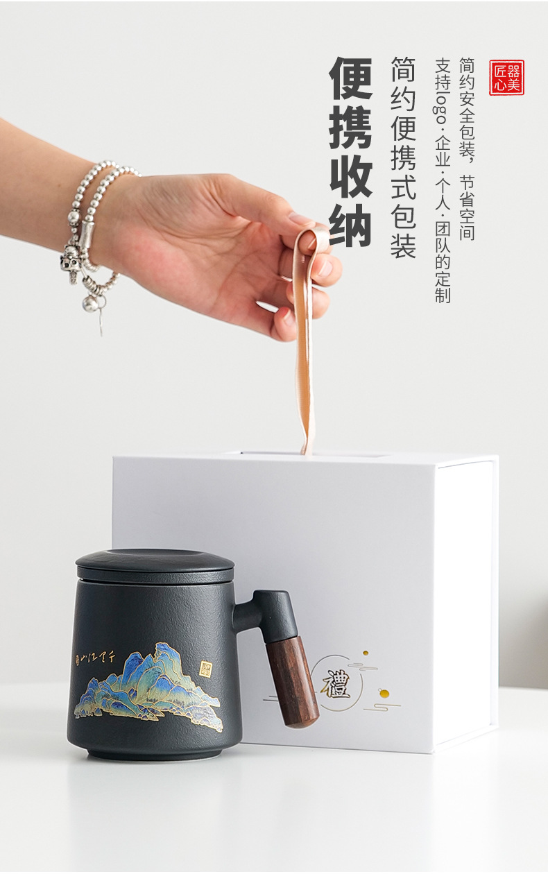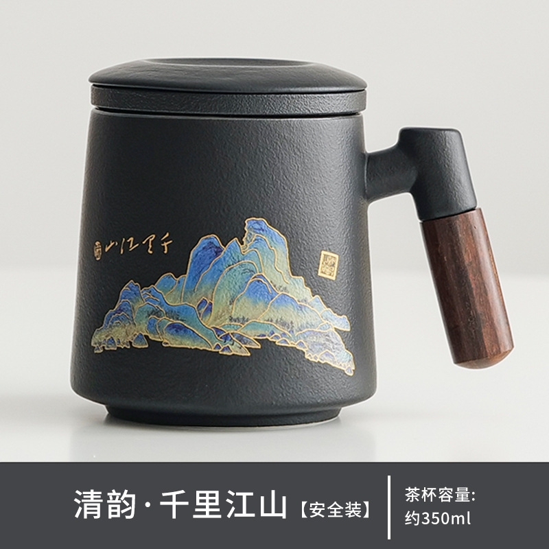 Qianli Jiangshan 나무 손잡이 세라믹 찻잔 차 분리 사무실 차 컵 필터 물 컵 인쇄 가능한 로고스토어 가기