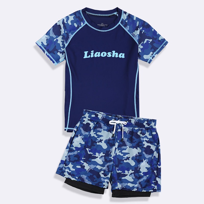 어린이 수영복 소년 쪼개진 뚱뚱한 소년 수영복 십대 안티 당혹감 짧은 소매 더블 레이어 빠른 건조 수영 트렁크 세트