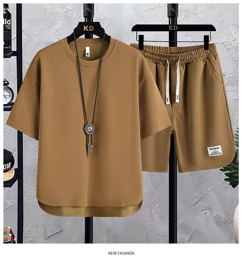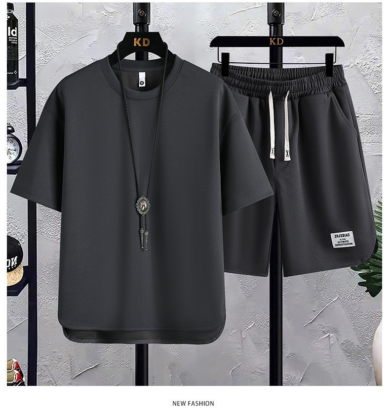 유행 세트 남성 와플 반팔 티셔츠 유행 브랜드 여름 새로운 느슨한 한국 유행 스포츠 캐주얼 투피스 세트스토어 가기