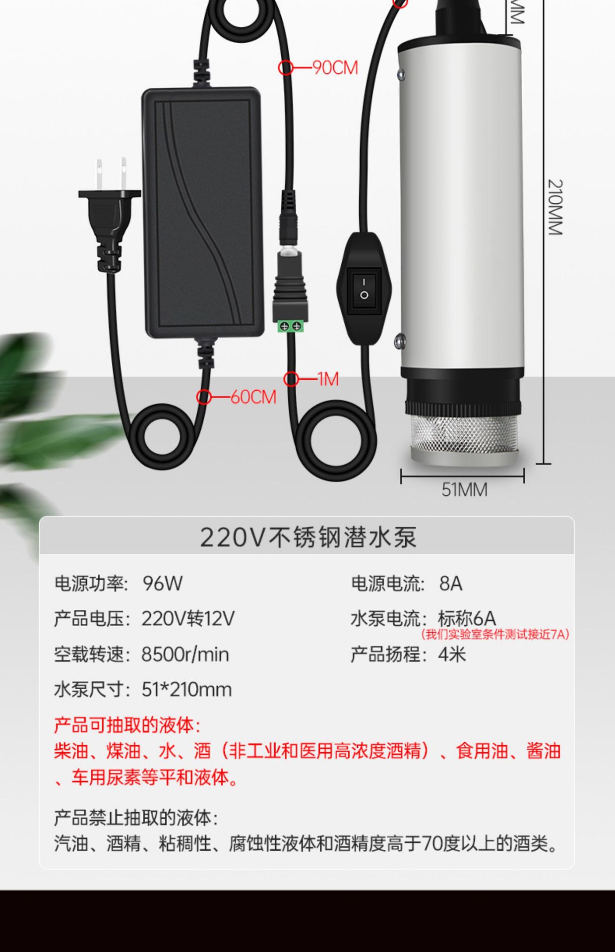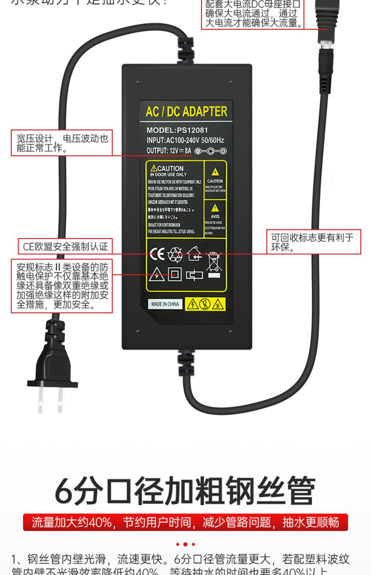 • 12v8a 전원 공급 장치 + 51mm 수중 펌프 + 강선 파이프 3m