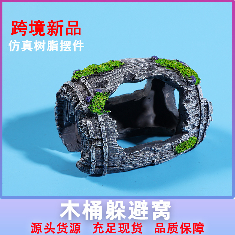 • 木桶躲避窝 创意鱼缸造景装饰摆件树脂破旧酒桶鱼虾屋批发