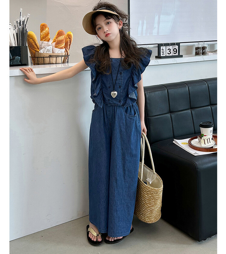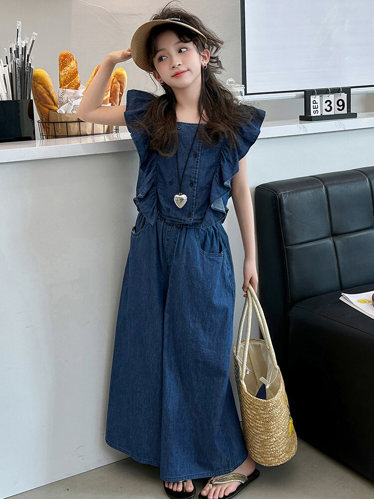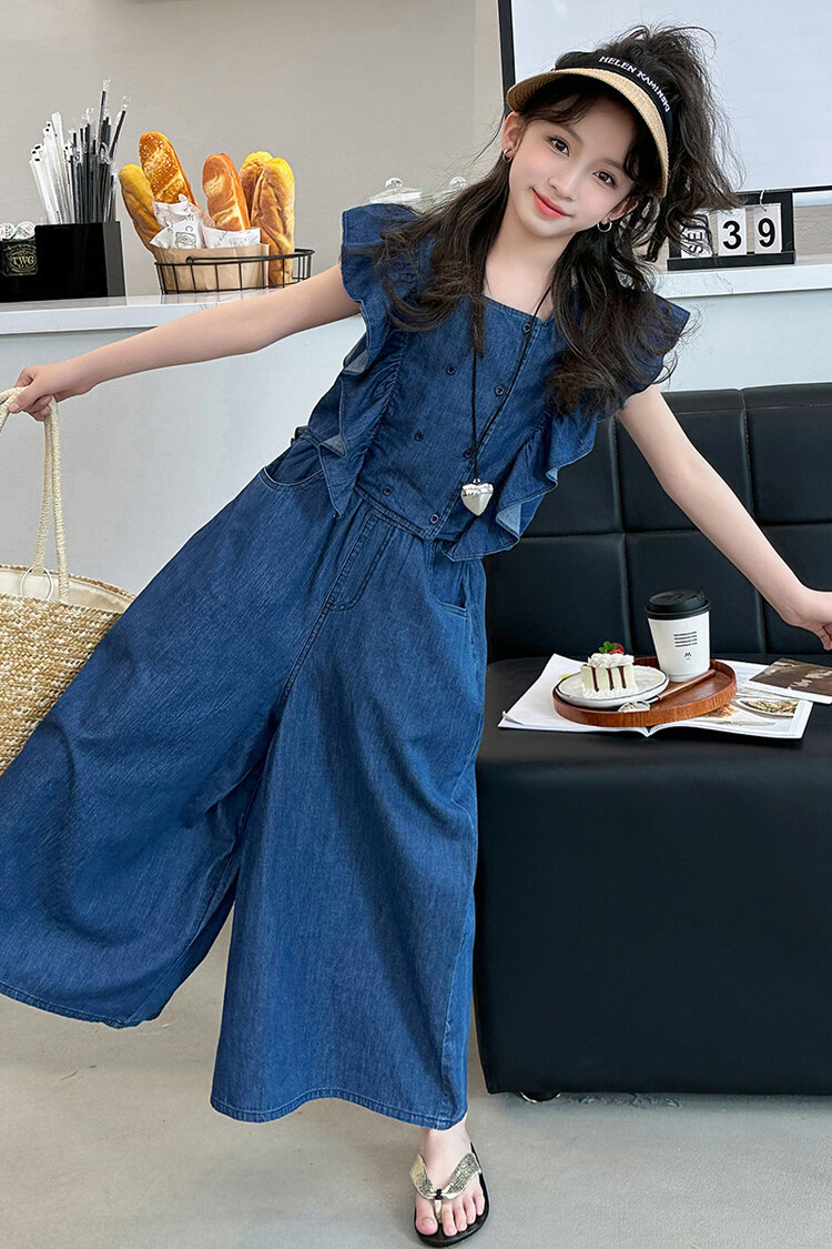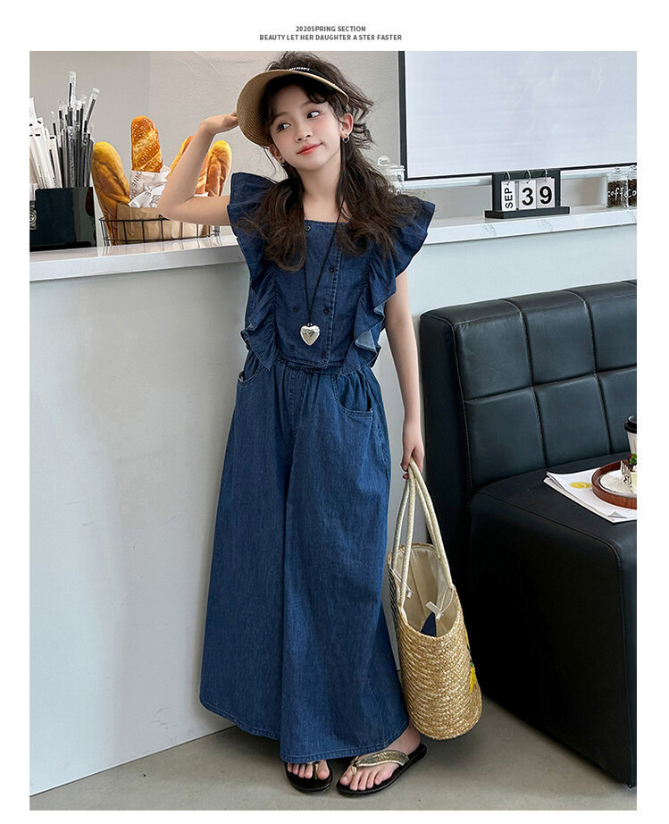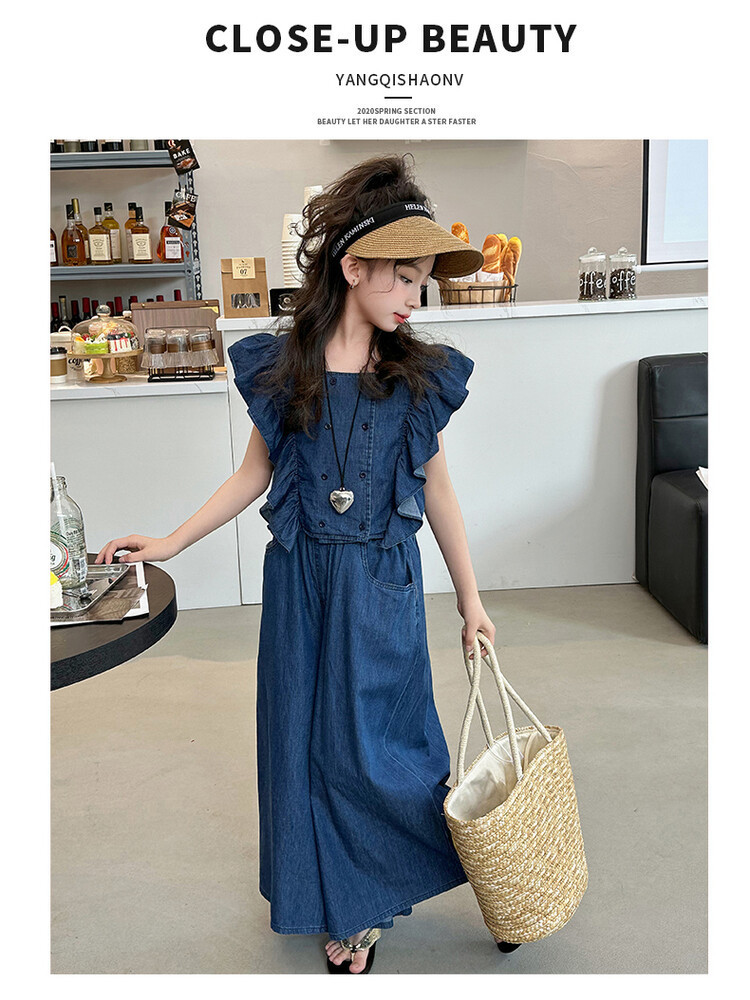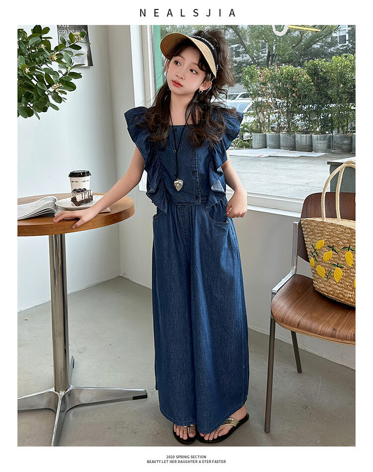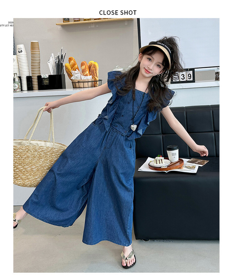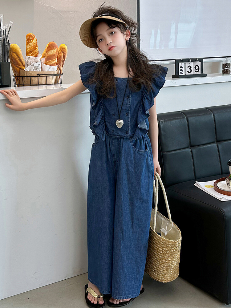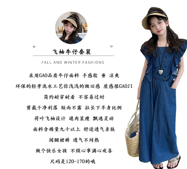 소녀 플라잉 슬리브 세트 2024 새로운 여름 원피스 큰 소년 소녀 얇은 데님 넓은 다리 바지 여름 투피스 유행 세트스토어 가기