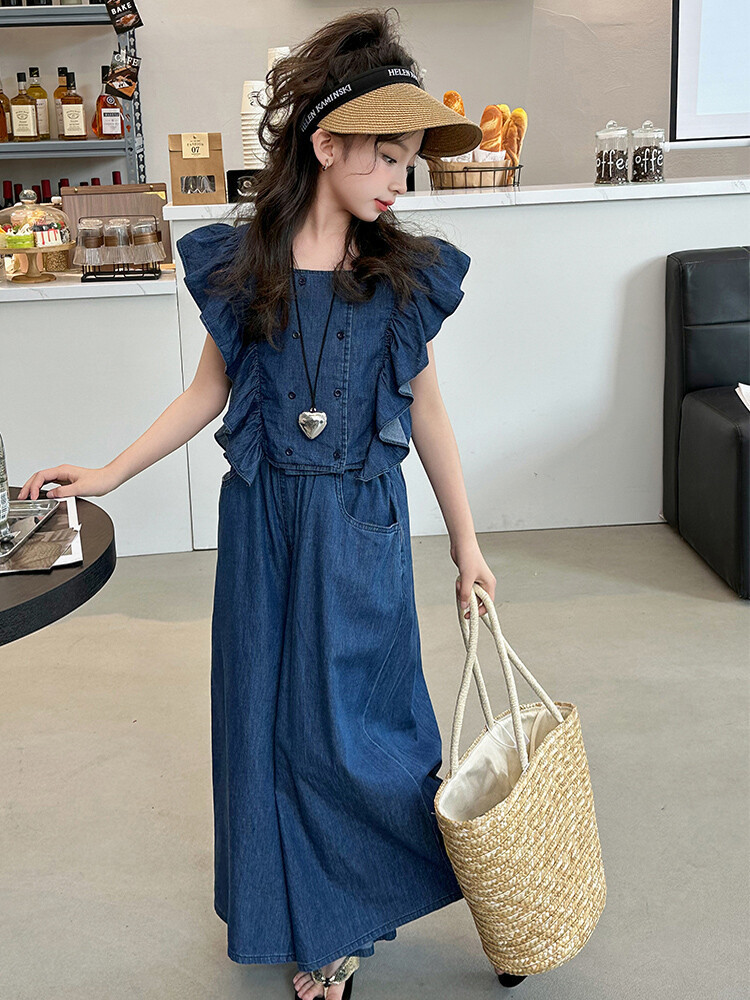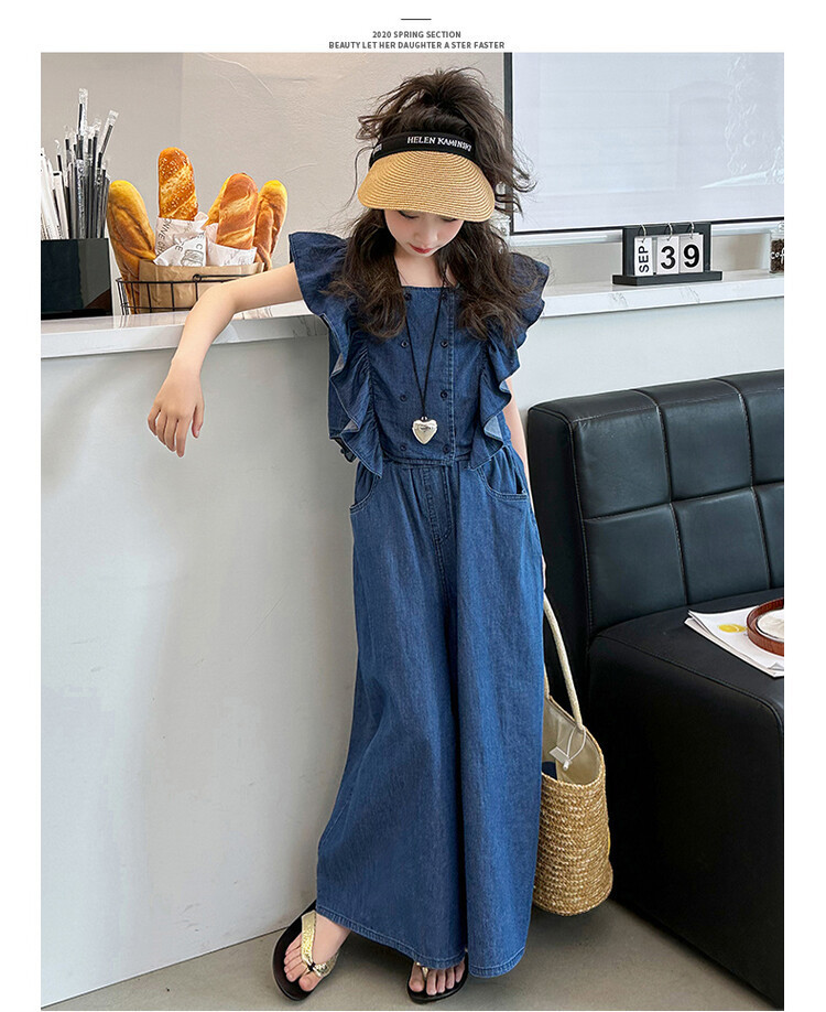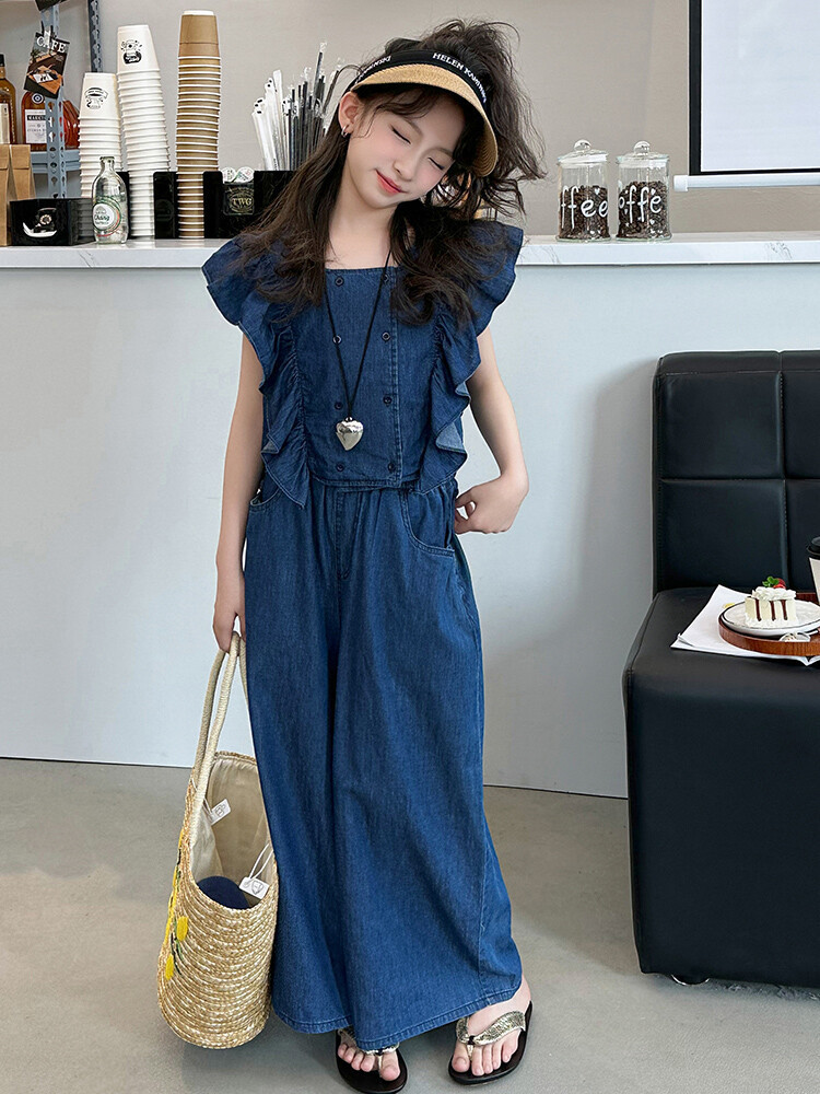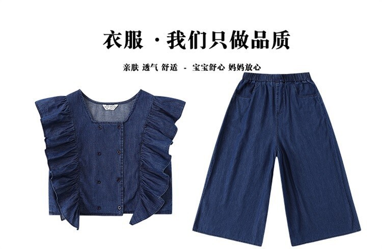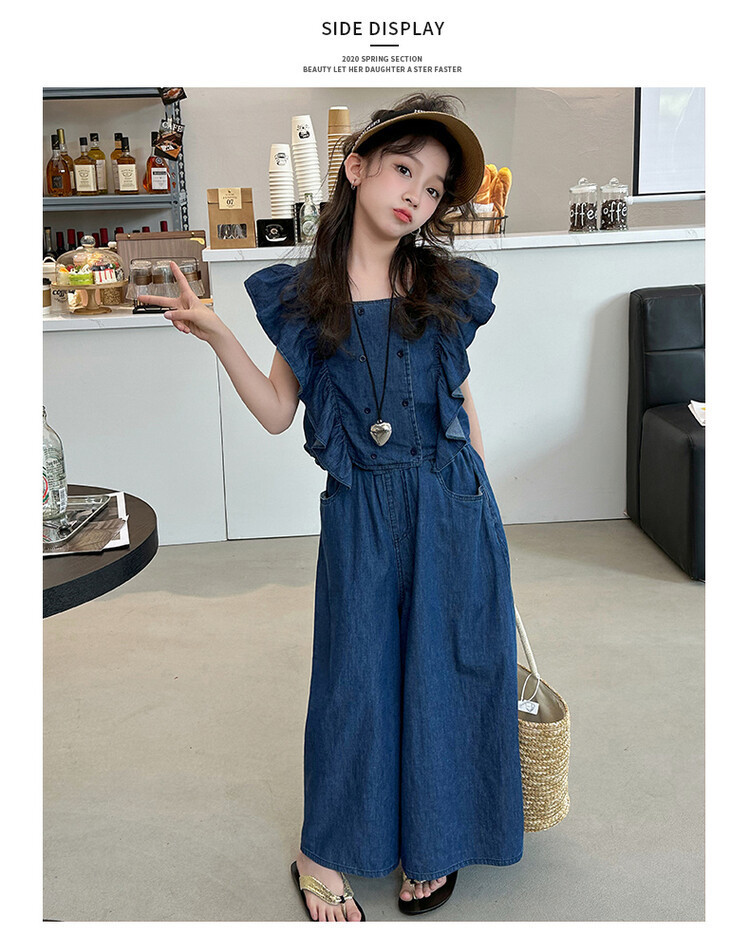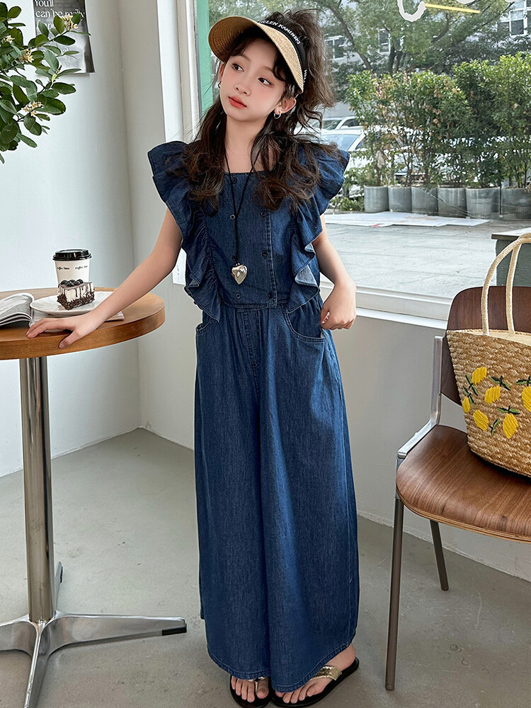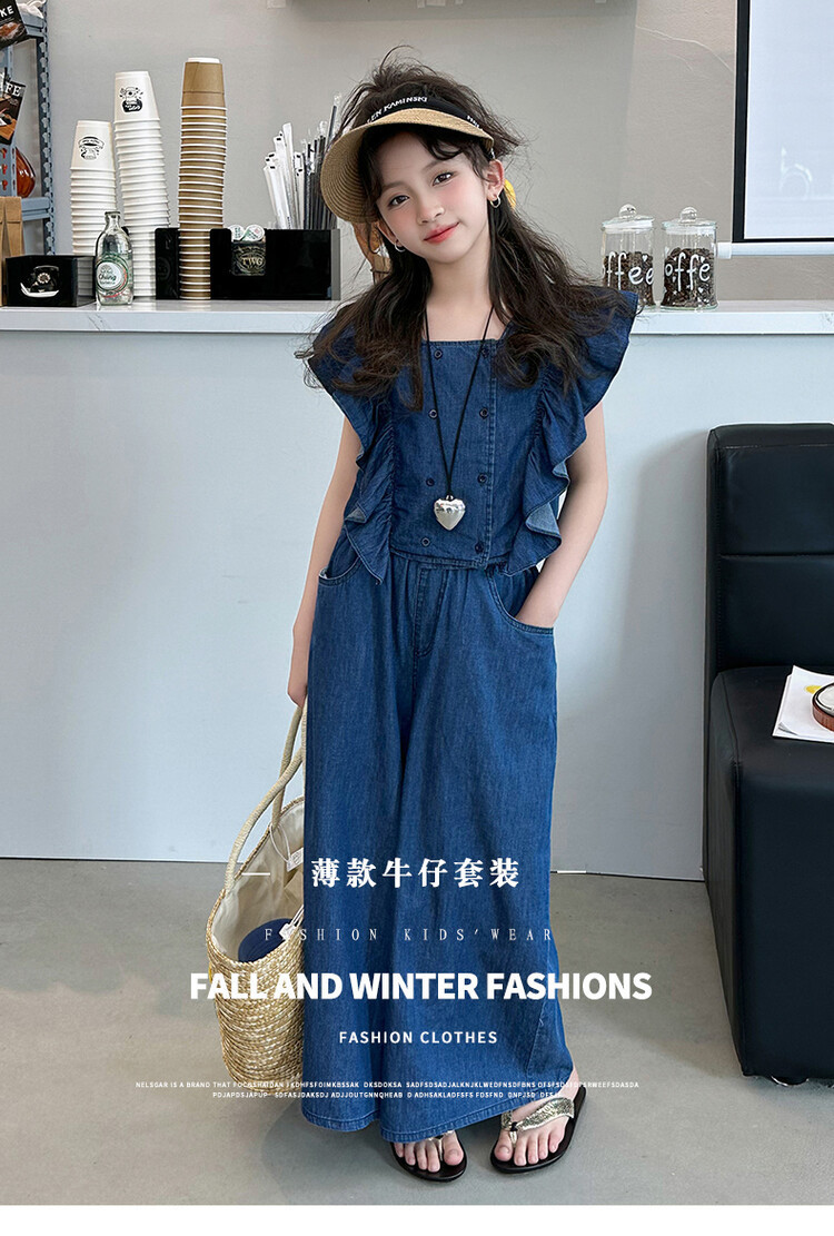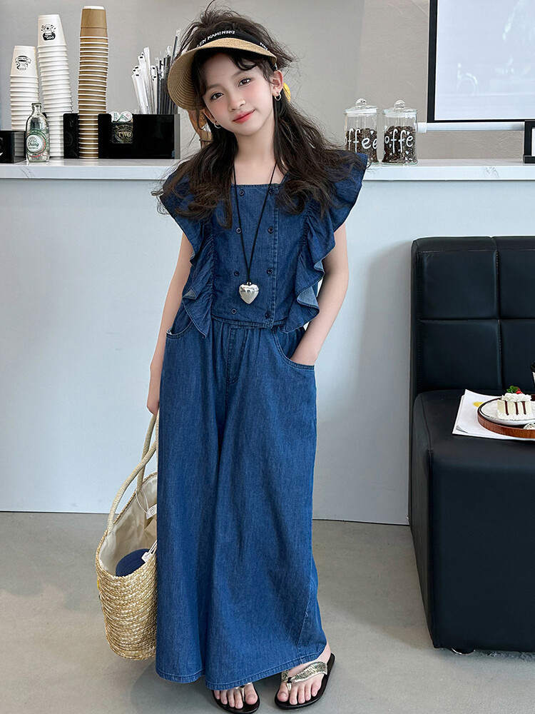 소녀 플라잉 슬리브 세트 2024 새로운 여름 원피스 큰 소년 소녀 얇은 데님 넓은 다리 바지 여름 투피스 유행 세트스토어 가기